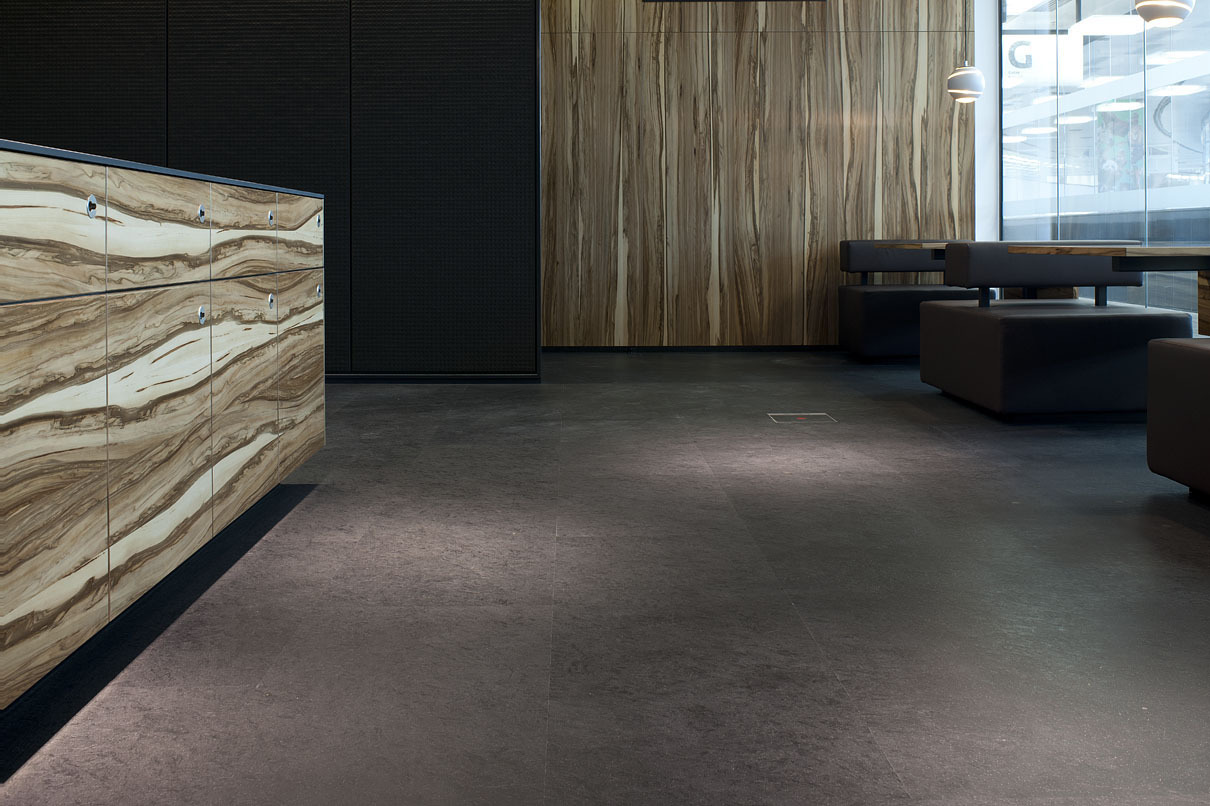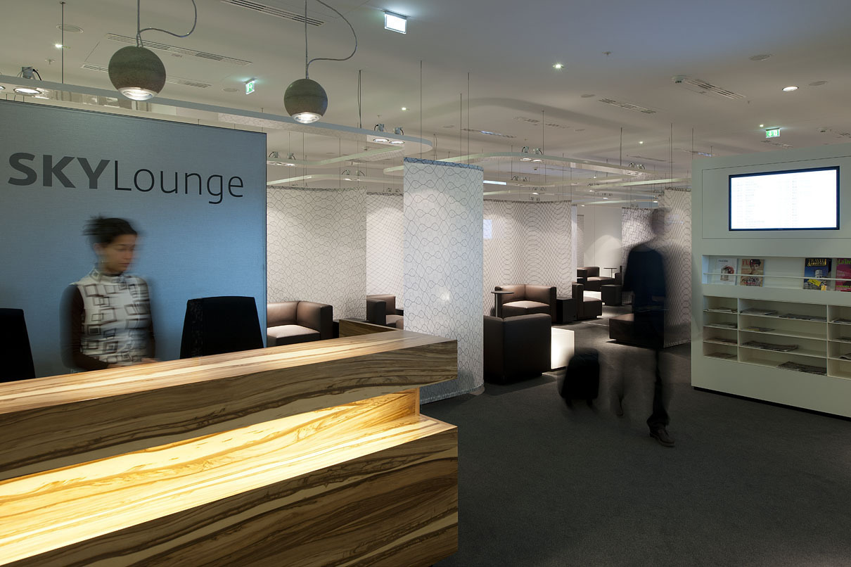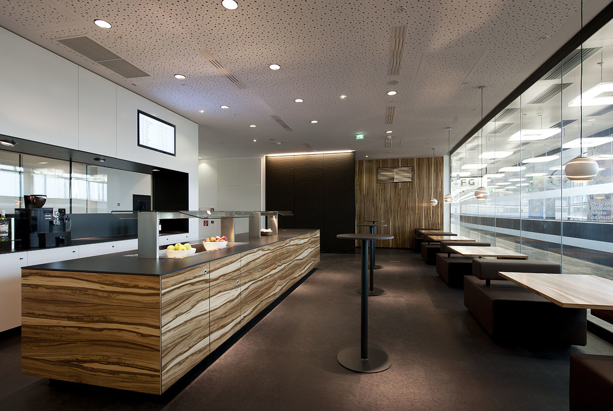 Rund um die Hauptlounges lagern sich Arbeits- und Besprechungsräume, textil abgeschirmte Entspannungsräume mit komfortablen Liegesesseln sowie die beiden Restaurantbereiche an. Oberflächen aus farbenreich gemasertem Amberbaumholz verbreiten auch hier eine elegante und doch wohnliche Grundstimmung. Die Tischreihen mit Ausblick entlang der Fassaden sind wiederum eine Hommage an das Wiener Kaffeehaus, nur heißt der Stephansdom hier Control Tower. (gekürzter Text der Architekten)