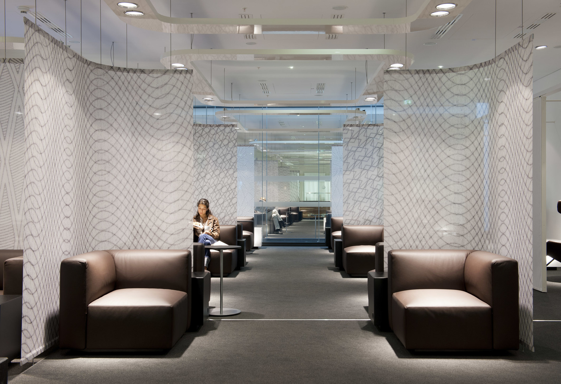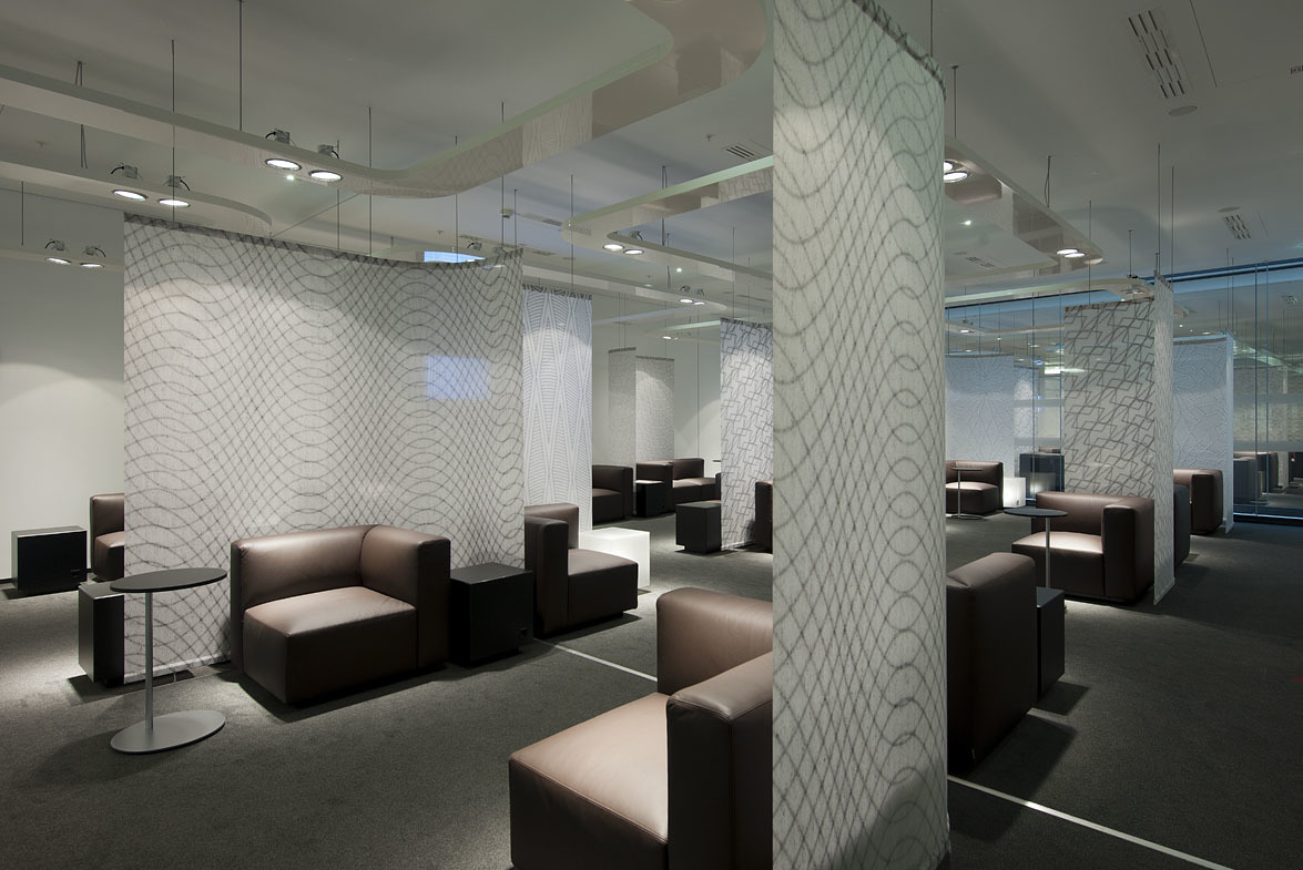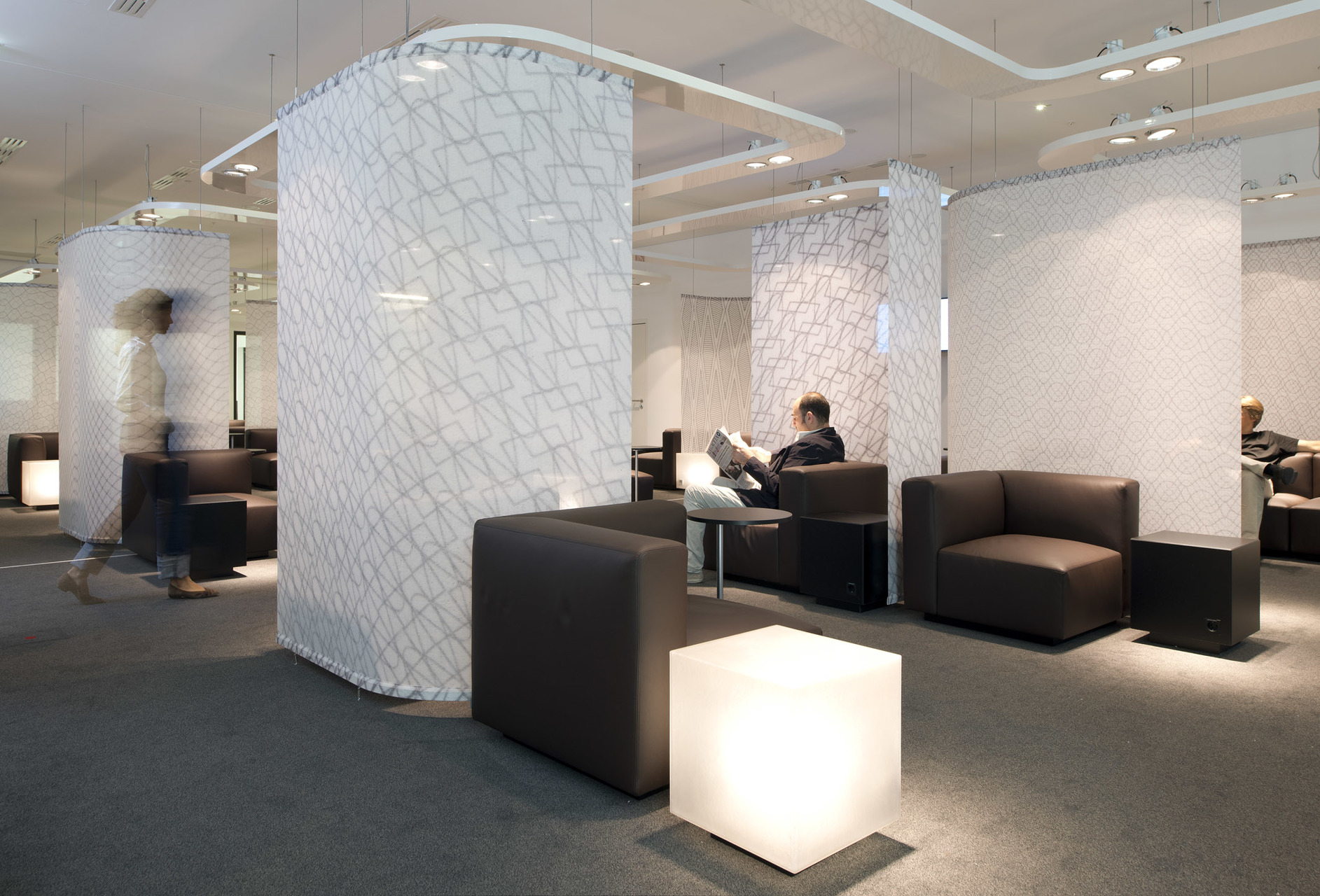 Die halbtransparenten textilen Flächen der Stoffwände erzeugen ein räumliches Gewebe mit unverwechselbarer Atmosphäre. Sie sind individuell bedruckt und zeigen „State Paintings“, die Arbeit der Künstler Özlem Günyol und Mustafa Kunt. Die unterschiedlichen Liniengrafiken sind Ausschnitte aus Makroaufnahmen der Sicherheitslineamente in Reisepässen von vierzehn Staaten, von Österreich über andere europäische Länder bis in ferne Kontinente. Der visuelle Reiz der feinen, vielschichtigen und leichten Lineamente transportiert zugleich die Mitteilung unterschiedlicher menschlicher Mobilitätsradien und Grenzen, Herkunft und Destinationen der Reisenden. Die Stoffwände erzeugen eine angenehm gedämpfte Raumakustik: eine wesentliche Voraussetzung für Entspannung und Diskretion.