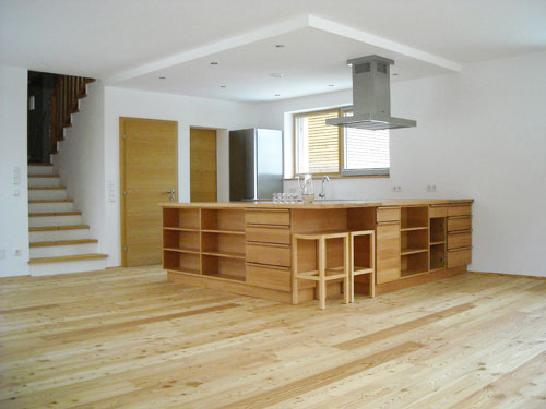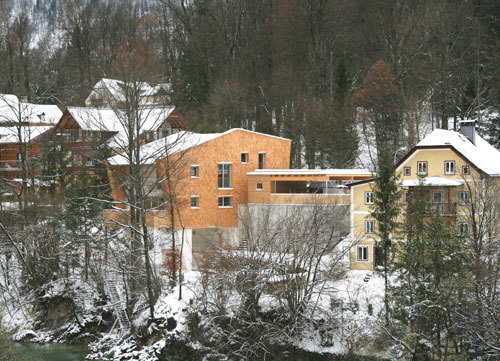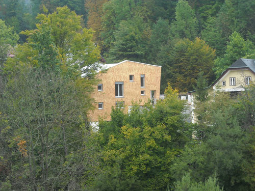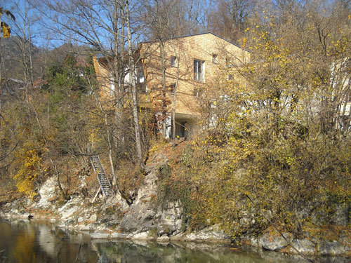 Der Baugrund befindet sich in Zentrumsnähe von Bad Ischl und grenzt am Ufer des Flusses Ischl. Wegen der Hanglage wurde fürs Gebäude das Split-Level-Konzept mit halbgeschoßiger Anordnung gewählt. Dies trägt einer bessern Anpassung des Baukörpers im steilen Gelände und einer Verkürzung der hausinternen Wege bei.Der Bauherr wollte ein zeitgemäßes, funktionelles, energiesparendes Haus für eine vierköpfige Familie, das die Exklusivität der Lage am Flussufer gut umsetzt. Es wurde ein langer Baukörper gewählt, der einerseits den Hauseingang im Straßenniveau ermöglicht und andererseits mit dem Wohnraum möglichst nahe an den Fluss herankommt. Die asymmetrische Satteldachform resultiert aus der Hanglage und dem Split-Level-Konzept. Die seitlichen Mauerscheiben, die die Ausrichtung des Baukörpers und die Anpassung an den Hang betonen, wurden mit Lärchenholzschindeln verkleidet. Dieses traditionelle Material steht im Gegensatz zur asymmetrischen, modern anmutenden Form der Fassade.