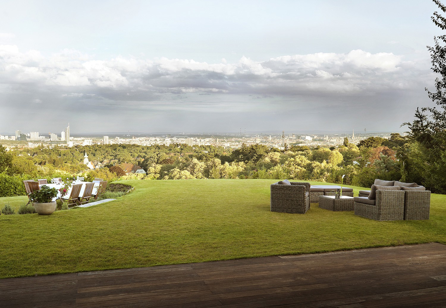 Ziel war den bestehenden Gastraum um einen Zubau von ca. 80m² zu erweitern und so sorgsam wie möglich in die umliegende Landschaft zu integrieren. Durch die intensive Begrünung des mit einer Böschung versehenen erweiterten Daches blendet sich der Baukörper optimal in den Hang ein. Die vollkommen in den Boden absenkbaren Glaselemente lassen den Kellerbereich des Gastraumes mit dem Außenbereich des Weingartens verschmelzen. Die große Glasfront bietet unabhängig von Niederschlag und Kälte einen fantastischen Blick über Wien.An der Westseite des Gebäudes wurde eine Natursteinmauer mit zusätzlichen Holzpaneelen in Spalieroptik ausgestattet um den Schallpegel noch weiter zu senken. (Text: Architekt)