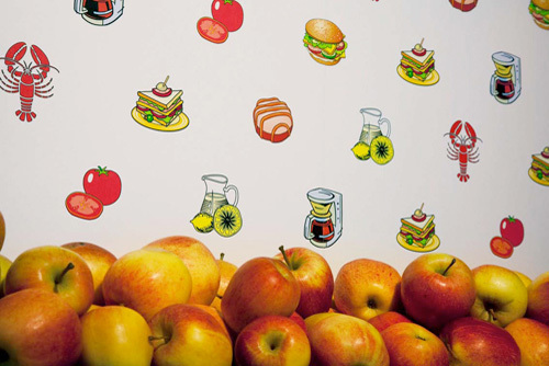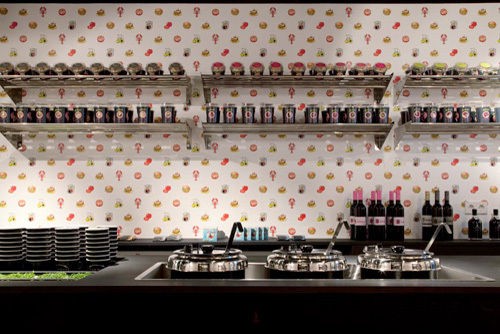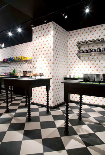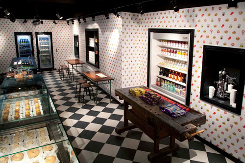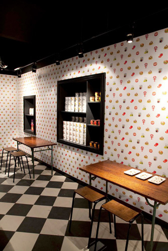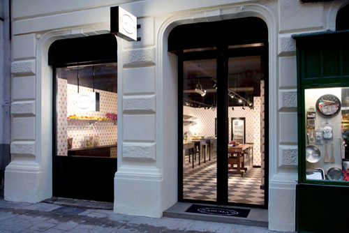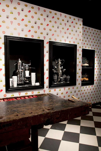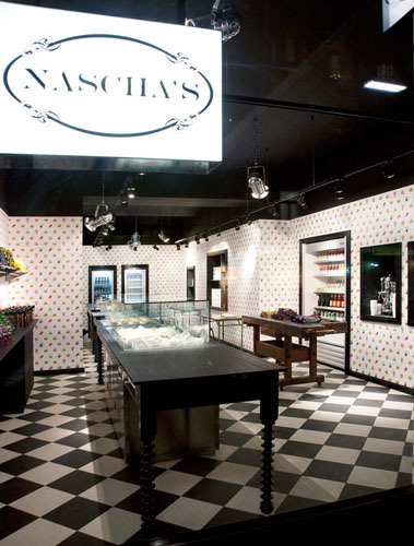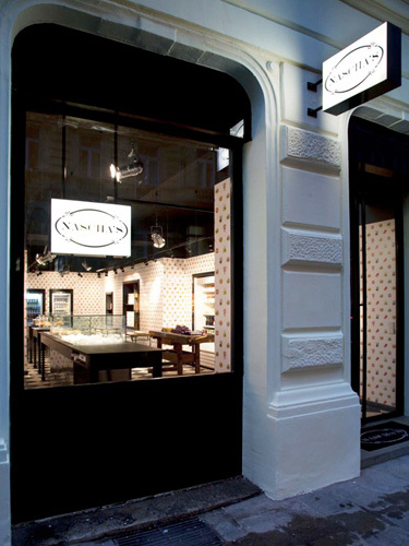 Vintage-Möbel und Industrieleuchten verleihen der im Grunde eleganten Komposition eine shabby chic Note und sorgen für überraschende Kontraste. Die Grenze zwischen Neu und Alt verblasst dadurch. Die bunte, plakative Tapete mit manieristischen Zeichnungen umfasst den gesamten Raum und bildet eine fröhliche ironische Basis der Gestaltung. In ihrer Unverwechselbarkeit wird die Architektur zum Träger der Markenentwicklung. Das auf diese Weise entwickelte Design wirkt nostalgisch und zeitgemäß zugleich, immer an der Grenze zwischen Ironie und Ernsthaftigkeit. In weiteren Schritten, angewendet als Branding an allen nicht raumbezogenen CI-Elementen, wird das Muster zum wesentlichen Bestandteil der Marke Nascha`s. (Text: Architekt, redaktionell überarbeitet und erweitert Martina Frühwirth)