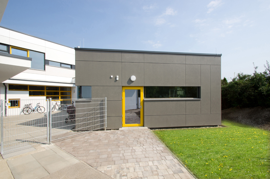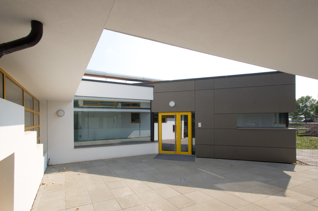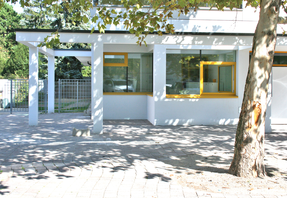 Das planerische Ziel bestand darin, ein stimmiges neues Ensemble zu schaffen, indem alt und neu nicht in Konkurrenz treten, sondern nebeneinander bestehen und miteinander harmonieren. Das umlaufende Band blieb als Zäsur zwischen dem alten Erdgeschoss und dem neuen Obergeschoss erhalten. Das bestehende Zeltdach des Kindergartens wurde durch einen schlichten Kubus ersetzt. Dieser aufgesetzte Kubus ist durch ein Lichtband durchschnitten und an den Ecken durch große Verglasungen noch weiter aufgelöst, was ihm Leichtigkeit und Transparenz verleiht. Im Bereich des Gartens wurde eine zweite, kleinere Box platziert, die an den Kindergarten andockt und den neuen Eingang für den Kindergarten und die Zentralgarderobe aufnimmt. Die gegenüber dem Hauptgebäude verdrehte Box schafft im Anschluss an den öffentlichen Vorplatz einen eigenen geschützten Vorbereich für den Kindergarten – als neuen Zugangsbereich und Marktplatz, der in den großzügigen Garten überleitet.