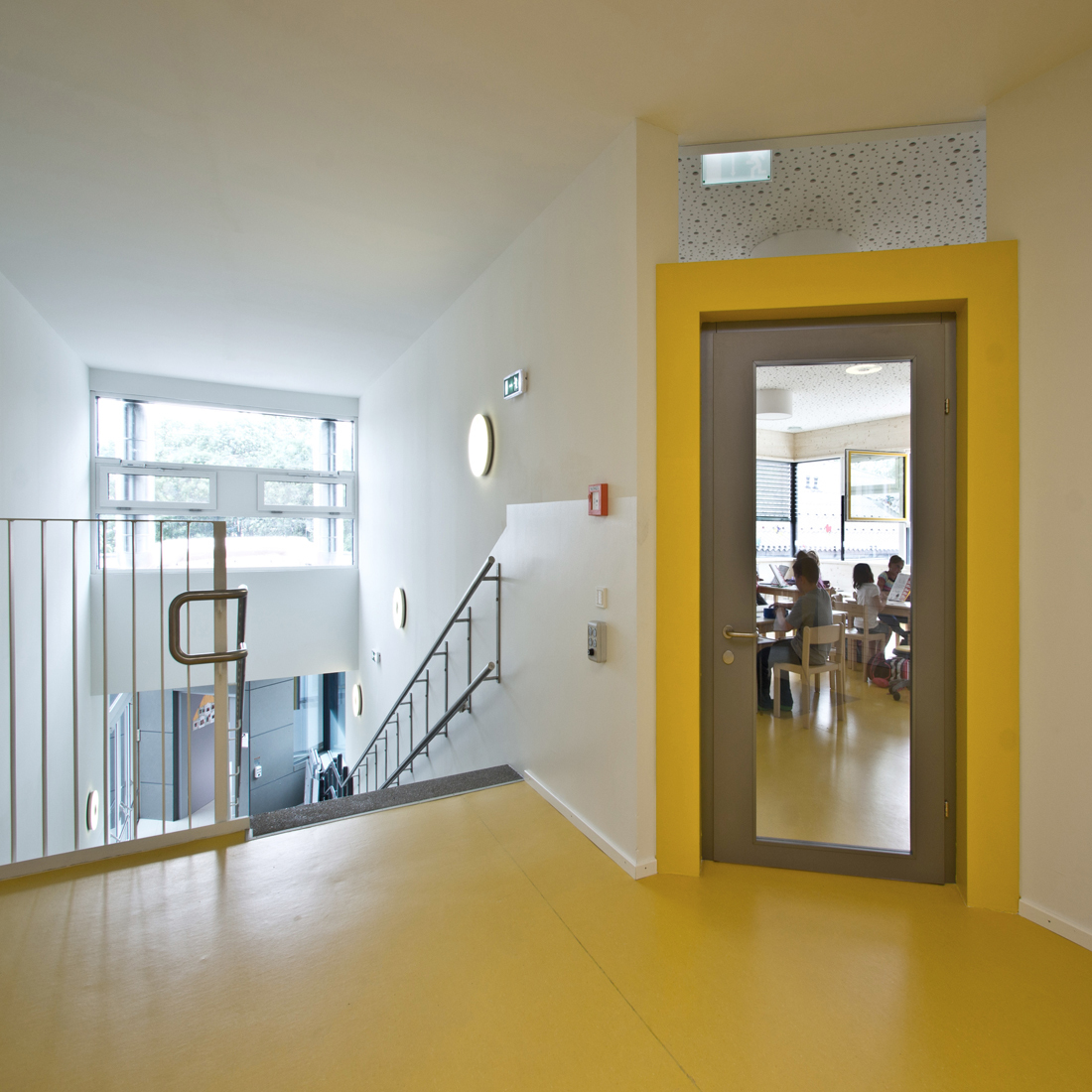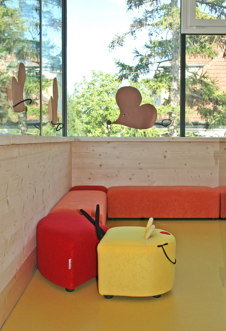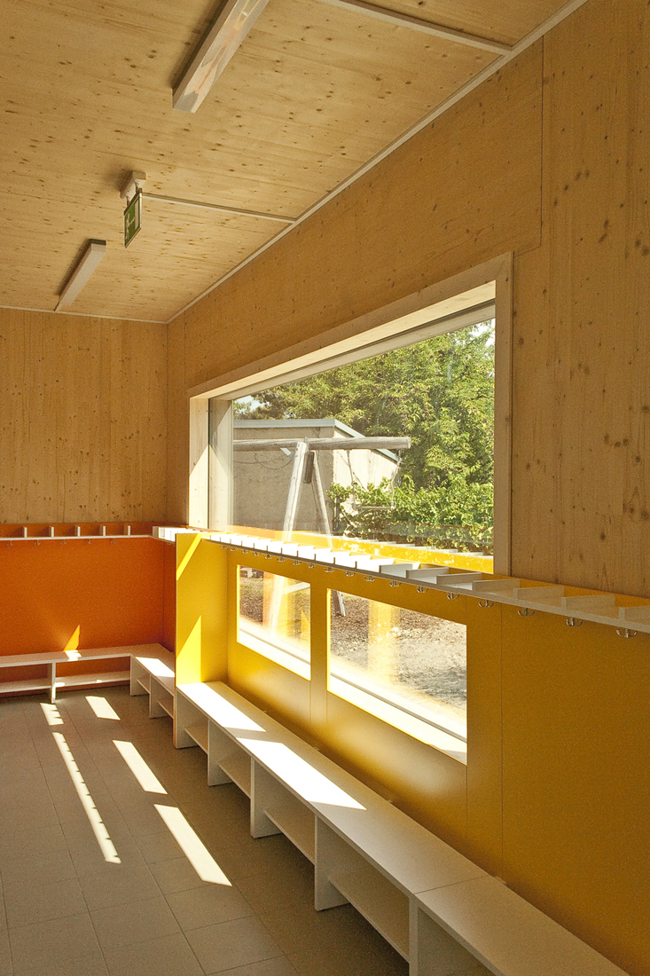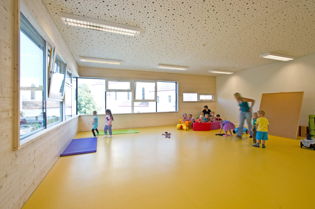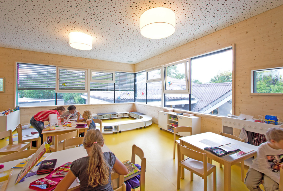 Die Wahl des Baustoffes Holz erfolgte allein schon aus ökologischer Überzeugung; die haptischen, optischen und akustischen Raumqualitäten des Holzes wurden durch großzügige Sichtoberflächen in allen Aufenthaltsräumen genutzt und zur Geltung gebracht. Weitere Vorteile der Holzmassivbauweise: Ein optimales Raumklima und eine natürliche Umgebung, in der sich Kinder wie Betreuungspersonen wohl fühlen. Das gesamte Innenraumkonzept setzt auf großzügige, lichtdurchflutete Räume und die aufeinander abgestimmte Wirkung der verwendeten Materialien.