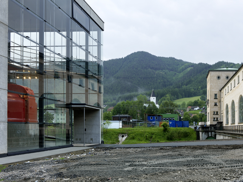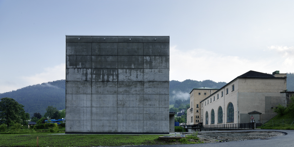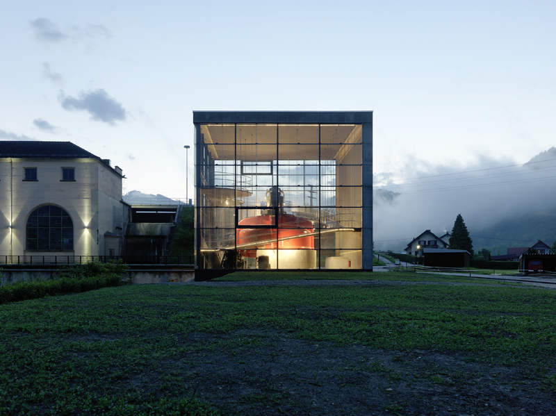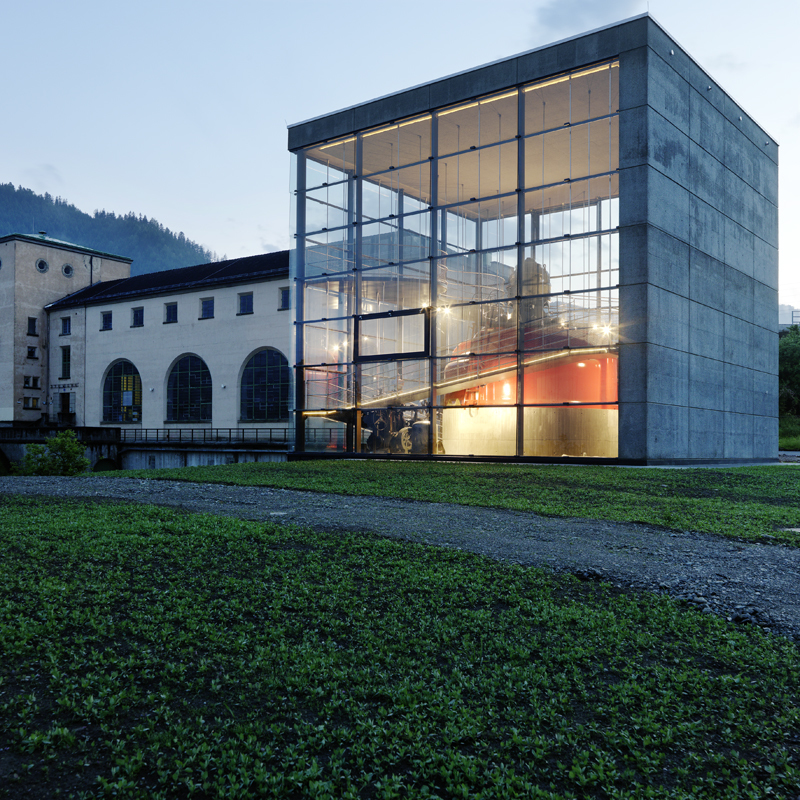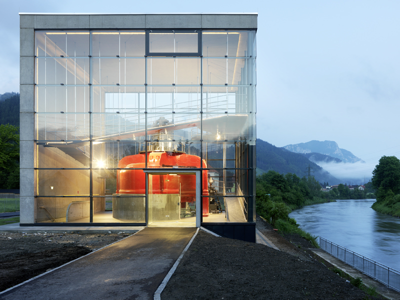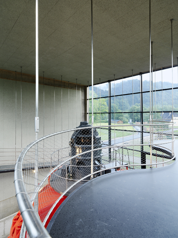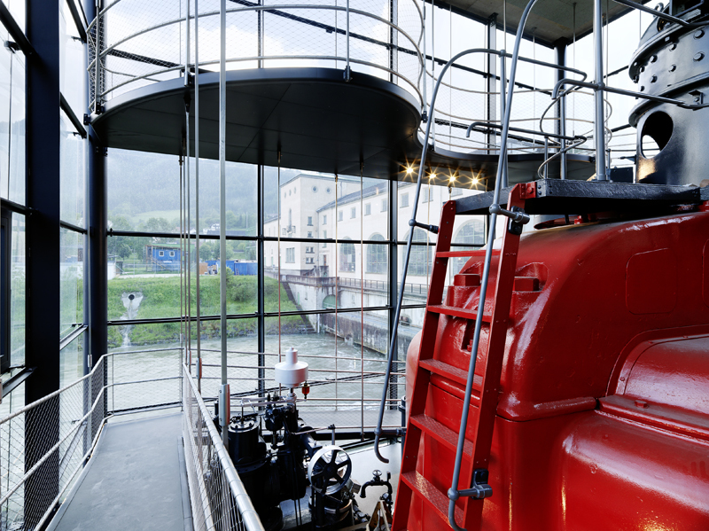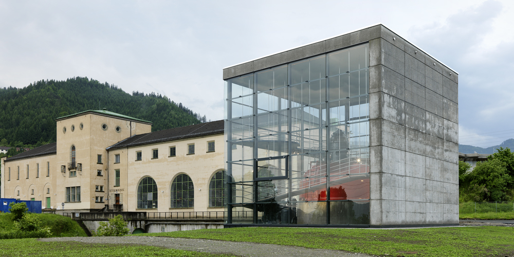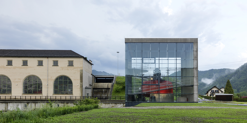Der neue Ausstellungspavillon für die Schauturbine, ein transparenter Würfel, bildet aufgrund seiner Schlichtheit einen spannenden Kontrast zur üppig geformten Objekt der Kaplanturbine, gleichzeitig steht er als Beispiel zeitgemäßer Baukunst im Dialog mit den historischen Bauten.