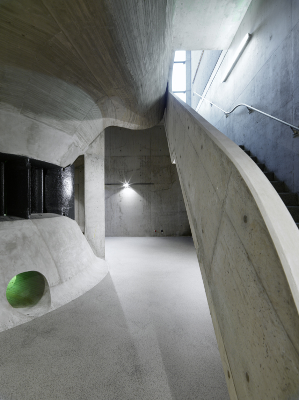 Um die komplexen Funktionen der Turbine erlebbar zu machen, wurde eine Wegführung angelegt, die von der Eingangsebene (0), die den Generator in ähnlicher Situation wie im jetzigen Krafthaus zeigt, über eine Rampe zu einer Aussichtsplattform auf halber Höhe des Pavillons führt (Ebene +1), auf der die Turbine allseitig und aus verschiedenen Blickwinkeln besichtigt werden kann. Von dieser Plattform aus können auch Filmprojektionen auf die Rückwand des Pavillons zur weiterführenden Erklärung des Kraftwerks vorgeführt werden. Gleichzeitig bietet die Rampe Ausblicke auf das alte Kraftwerksensemble und die Umgebung von Pernegg. Die untere Ebene (-1) bietet mit einer nachgebildeten, schneckenförmigen Turbinenspirale Einblicke in die jetzt für Besucher nicht zugänglichen Turbinenbereiche.