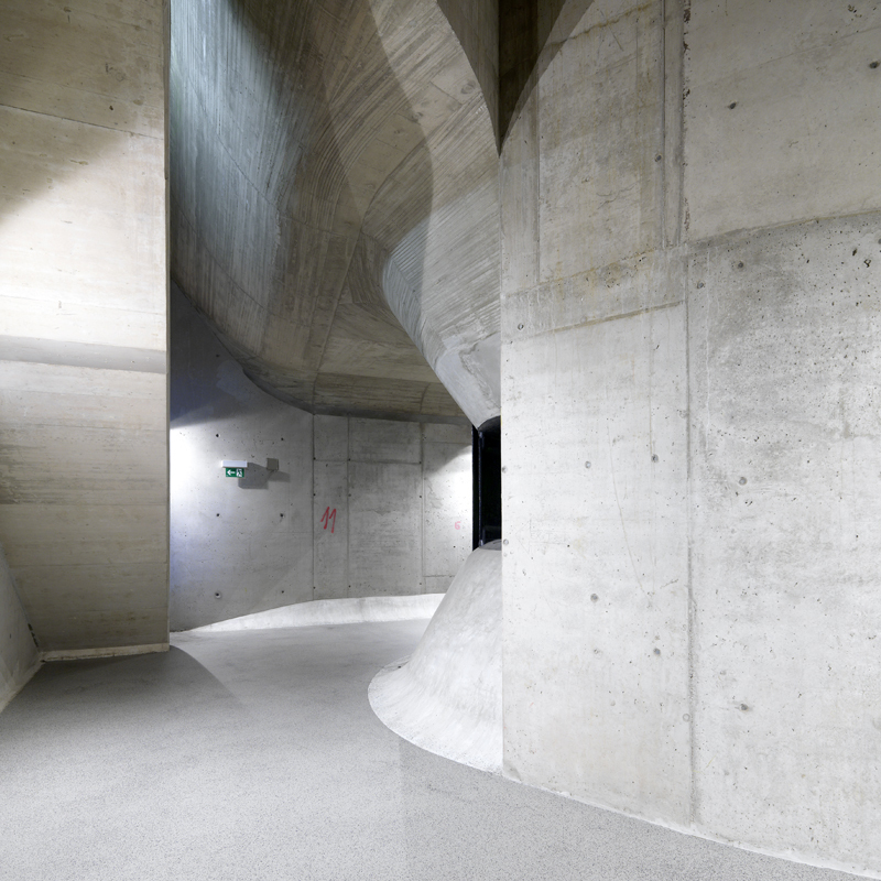 Das Gebäude wurde als Mischkonstruktion aus Stahlbeton für Boden, Dach, geschlossene Rückseite und Stahlstützen errichtet. Das geneigte Foliendach mit Attika wird über die Stützen ohne sichtbare Abfallrohre entwässert. Die Betonoberflächen im Hauptraum sind eingefärbt, geschliffen oder gestockt. Die drei Sichtfassaden, Ost, Süd und West, sind als Nurglasfassaden hergestellt. (Text: Architekt, redaktionell überarbeitet, Karin Wallmüller)