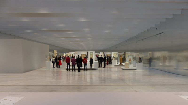 Das Wesentliche, nämlich die Kunst selbst, scheint so fast aus dem Blickfeld zu geraten. Doch auch hier drehten die Architekten an subtilen Schrauben. Das Herzstück der Louvre-Filiale, die „Galerie du temps“, in der 205 ausgewählte Stücke aus der riesigen Sammlung in chronologischer Reihe platziert sind, wurde auch innen matt verspiegelt: eine doppelte Familienaufstellung von ägyptischen Statuen bis zum Neoklassizismus des 19. Jahrhunderts.