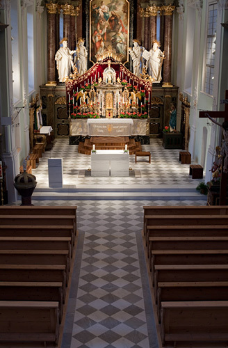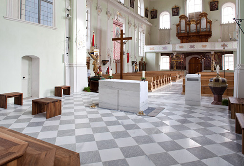 Eine weitere wesentliche Maßnahme war die Neugestaltung der Bodenoberflächen. Den Vorgaben des BDA Innsbruck und des bischöflichen Bauamtes Innsbruck folgend wurde der Belag auf den barocken Innenraum abgestimmt und nach einem exakt vorgegebenen Muster verlegt. Das zweifarbige Rautenmuster bilden zwei kontrastierende heimische Natursteine: weißer Laaser Marmor und hellblauer Rauriser Marmor. (Text: Claudia Wedekind nach einem Text der Architekten)