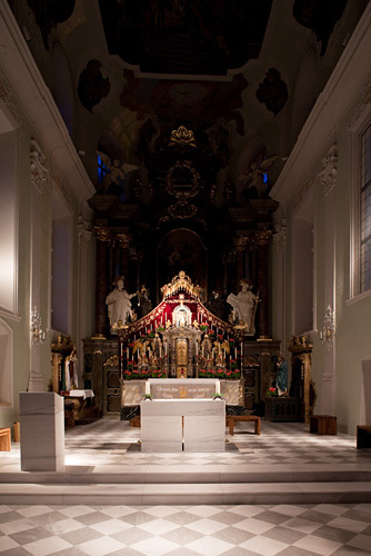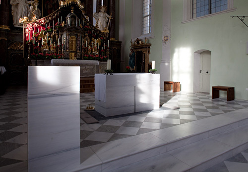 Das Niveau des Altarraumes wurde angehoben und damit die Übergänge zu den bestehenden Nebenräumen angeglichen, Altar und Ambo wurden neu ausgerichtet und gestaltet, um den geänderten liturgischen Abläufen gerecht zu werden. Die aus jeweils einem Marmorblock geschnittenen exakten geometrischen Körper von Altar und Ambo bilden durch ihre Massivität und Schwere den neuen unverrückbaren Brennpunkt der Apsis, ohne dass sie in Konkurrenz zum barocken Hochaltar treten.