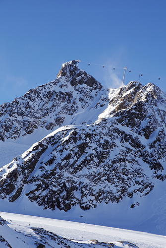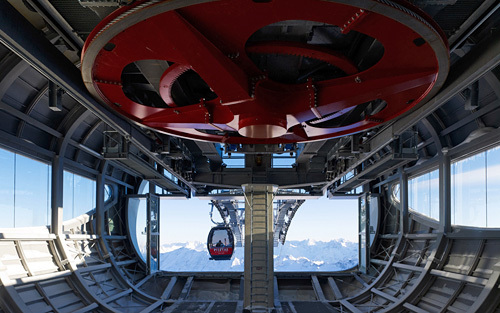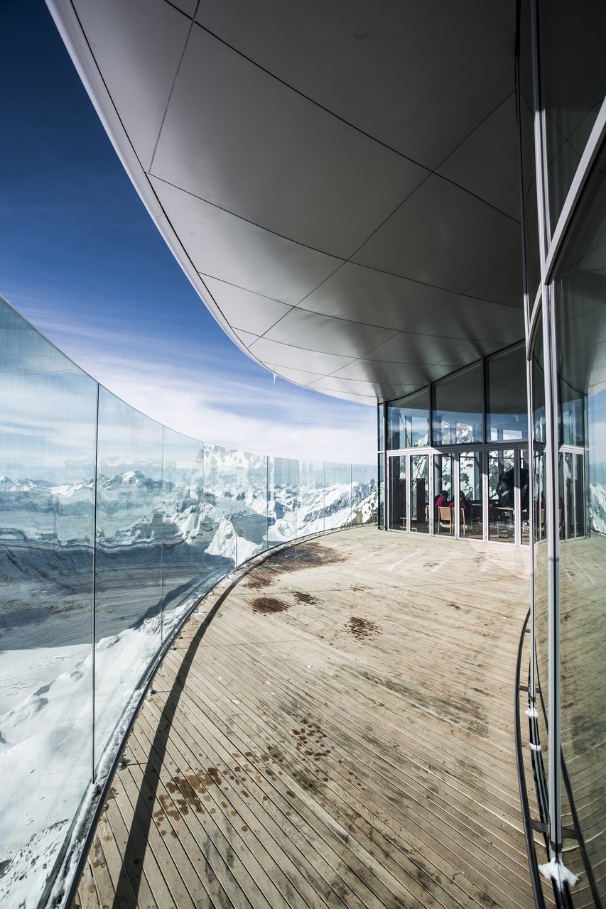 Architektur auf solchen Höhen umzusetzen, ist ein Kraftakt: 3350 Fahrten mit der Materialseilbahn waren nötig, größere Bauteile und der Kran kamen Stück für Stück in 700 Hubschrauberflügen auf den Gipfel. Noch dazu war der Zeitdruck enorm: Wo die Wintersaison von September bis April dauert, bleibt nicht viel Zeit für ungestörte Bautätigkeit. Noch dazu verlangte die Dachkonstruktion, bei der kein Teil dem anderen gleicht, höchste Präzision. Trotz Verzögerung durch Wintereinbrüche in den Sommermonaten wurde man in letzter Minute rechtzeitig zum Saisonauftakt fertig.