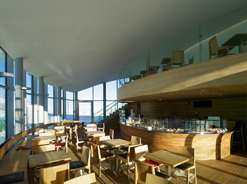 Zwei Monate nach der Eröffnung am 9. November ist das Café gut gefüllt mit Besuchern, die skibestiefelt ihre Tabletts mit Kaspressknödeln zum Tisch balancieren. Es herrscht gute Laune, aber kein Après-Ski-Gelärme, sondern ein fast meditative Aussichtsruhe. Auf den kleinen Tischen aus massivem Eichenholz ließe sich ohnehin schwer tanzen. Keine rustikal wuchernden Bergstüberlbänke, die Möblierung hinter den bis zu sechs Meter hohen Glasscheiben tritt hinter dem Wesentlichen - der Aussicht - dezent zurück.