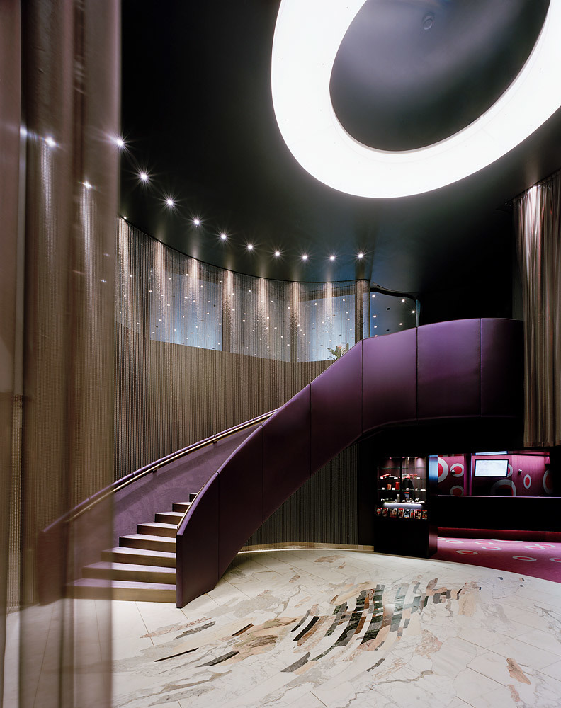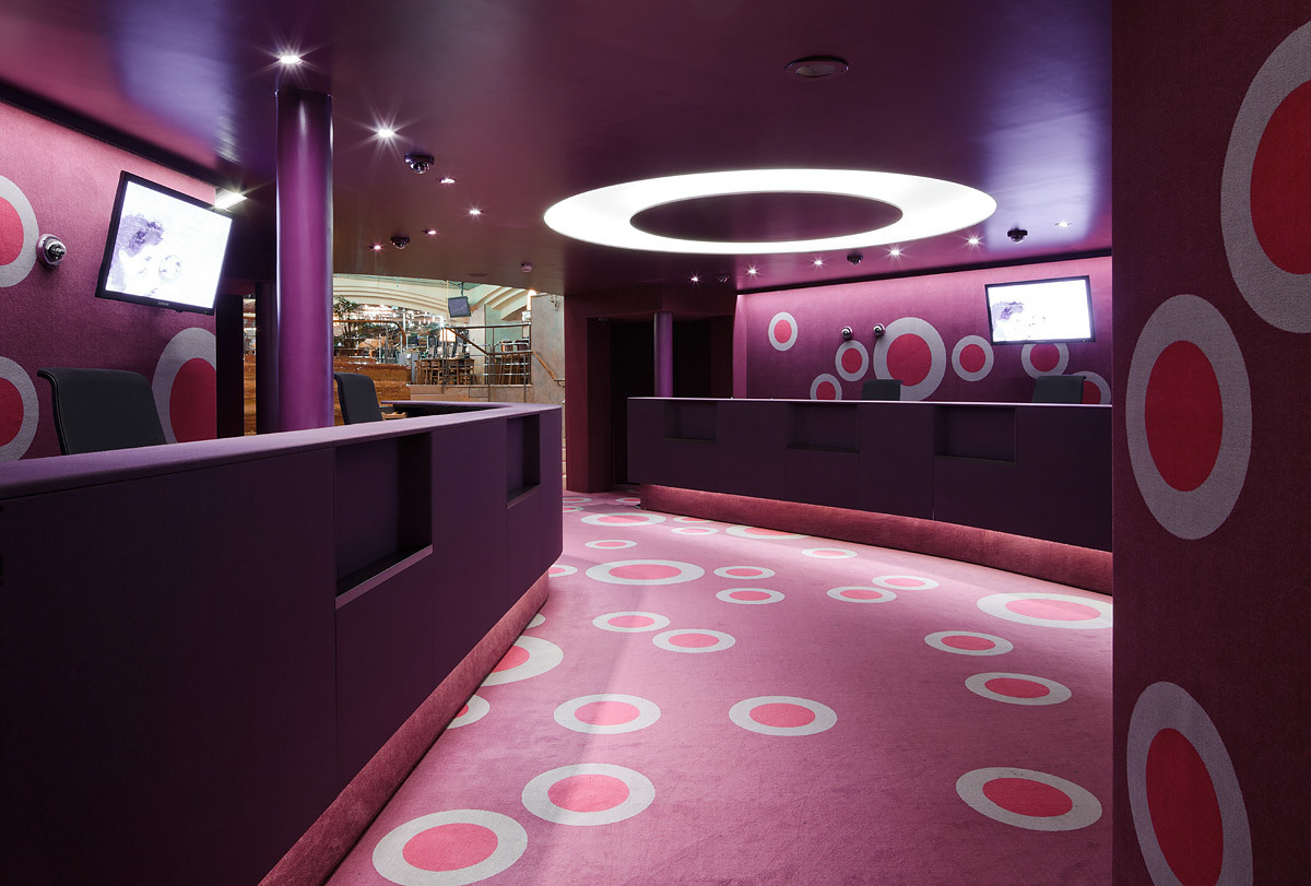 Am Ende des Foyers, dient die Rezeption als Schwelle zwischen Außenwelt und Spielsaal. Bewusst niederer und dunkler gehalten wird dieser Bereich zu einer Art Tunnel als Einstimmung auf die helle, glitzernde Casinowelt. Brombeer- und Magentatöne ziehen sich von Decke über Wände und Boden bis zu den Oberflächen der Einbauten durch. Wie bereits im Restaurant nimmt auch hier das Teppichmuster ein Element des Casinos auf – die Jetons. Die Tresen sind mit einem Stoff bespannt, mit dem auch Spieltische bezogen sind, und stimmen die Besucher dadurch auch haptisch auf das Casinoerlebnis ein.