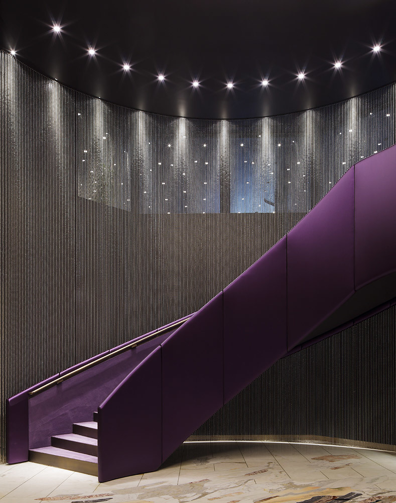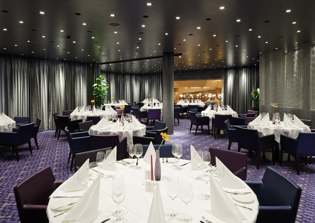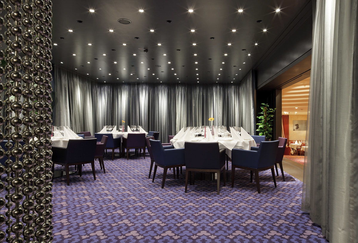 Über die geschwungene, als Volumen neu interpretierte Treppe gelangt man in das Restaurant im ersten Stock. Durch Wandöffnungen wird es zum Teil des Foyers, wobei beidseitig angebrachte raumhohe Ketten-Vorhänge als Filter dienen. Das alte Restaurant wird komplett entkernt und als fließendes Raumkontinuum angelegt. Die dunkle, anthrazitgraue Decke des Foyers wird in das Restaurant hineingezogen. Mehrschichtige Vorhänge vor der Glasfassade vermitteln eine Ahnung vom Außen, filtern aber die Sicht. Schwere Vorhänge fungieren als Raumteiler, die bei Bedarf séparéeartige Räume herstellen. Der von Gregor Eichinger entworfene Teppich nimmt das Thema Casino mit einem Muster aus Spielkartenmotiven auf.