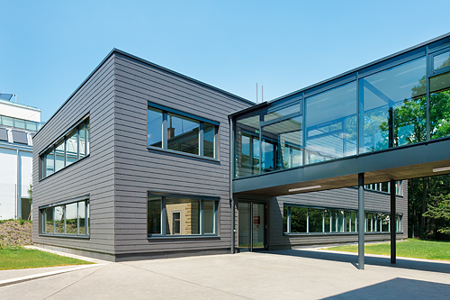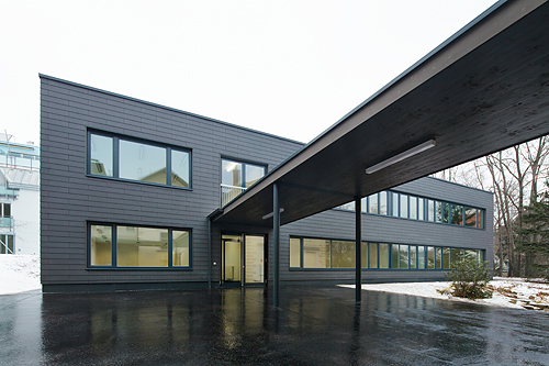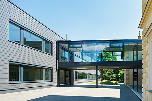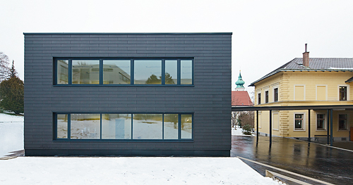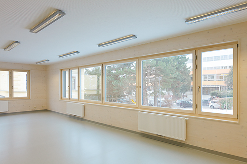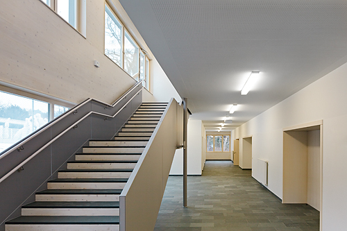 Die Konstruktion des neuen Schultraktes wurde in vorgefertigten Teilen Brettschichtholz gelöst. Innerhalb von vier Tagen war der Rohbau aus Holz montiert. Die Fassade wurde mit anthrazitfarbenen Faserzementplatten verkleidet, der eine ähnliche Anmutung hat wie alter Dachschiefer und so auch in der Farbsprache eine Verbindung zum Altbestand herstellt. Die Holzwände blieben innen dort, wo weder Schall- noch Brandschutzanforderungen eine zusätzliche Beplankung erforderten, sichtbar. Sie sind weißlasiert, und die durchschimmernde Holzmaserung sorgt für eine feine Atmosphäre. Es gab keinen Spielraum für Extravaganzen.