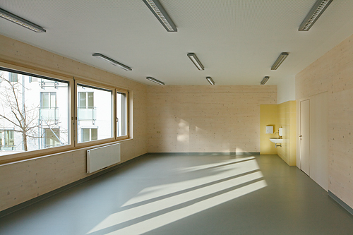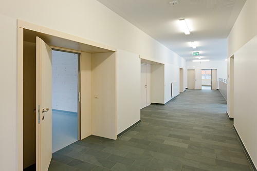 Dass die Schule dennoch als angenehmer Ort empfunden wird, hat damit zu tun, dass die Architekten nichts dem Zufall überließen und in einigen Detailfragen beharrlich blieben. So durften die Klassentüren nureine Öffnung von 90 mal 200 Zentimetern haben. Um eine spätere Aufweitung nicht von vornherein unmöglich zu machen, sahen die Architekten breitere Löcher in den Wandscheiben vor, in die sie Portalnischen setzten, die nun eben den vorschriftsmäßigen Türflügel enthalten, deren geschlossene Seitenteile aber leicht entfernbar wären und durch breitere Türen oder transparente Teile ersetzt werden können. Dass die Schränke in den Klassenzimmern auf die Höhe dieser Türelemente abgestimmt sind, ist Ehrensache. Ansonsten gab es in Hinblick auf die Möblierung wenig Gestaltungsfreiheit. Was als lächerliche Marginalie erscheinen mag, trägt gerade an einem Gebäude, von dem die Bauherren nicht mehr als die Erfüllung eines in Kosten, Kubatur und Termine gezwängten Bedarfs verlangen, dazu bei, dass die Zwänge nicht an allen Ecken und Enden spürbar sind.