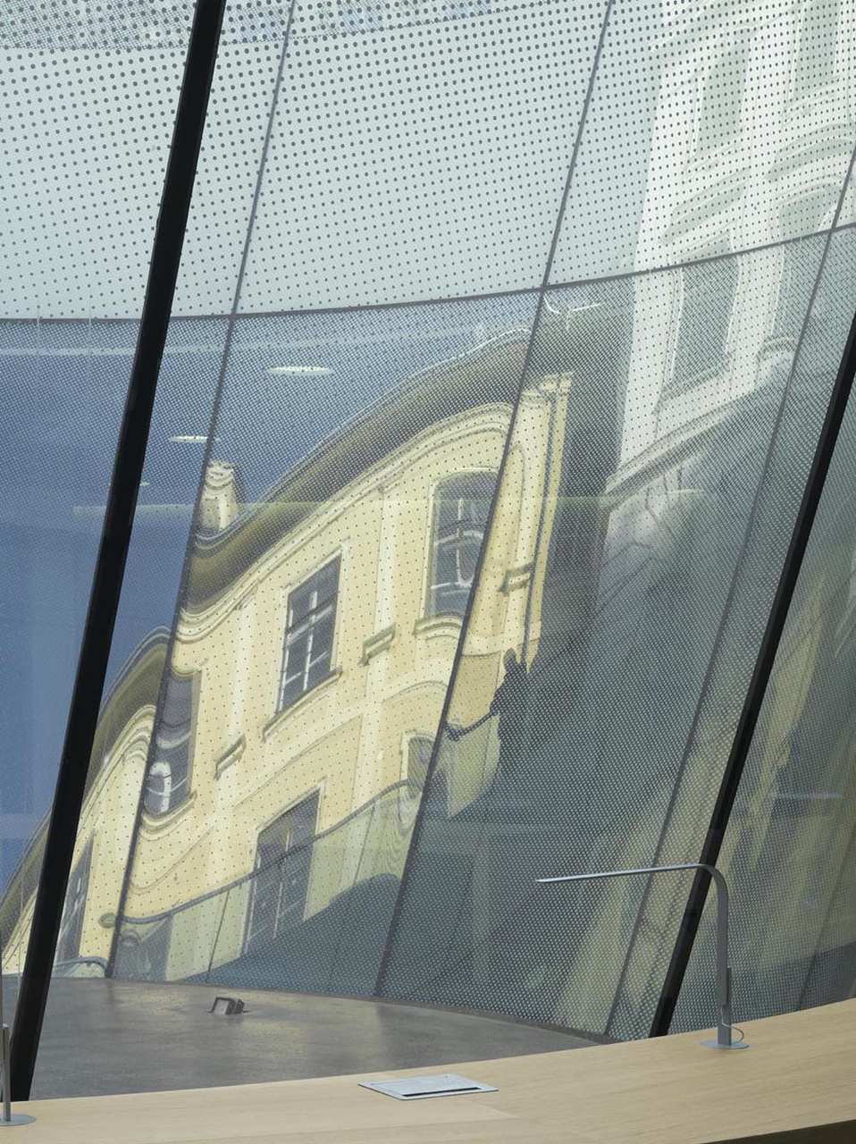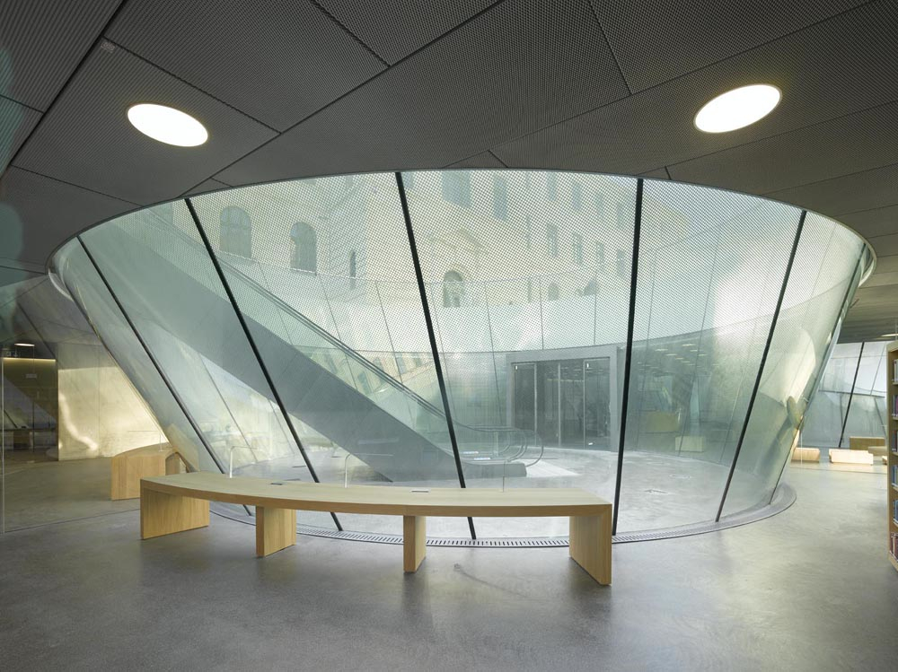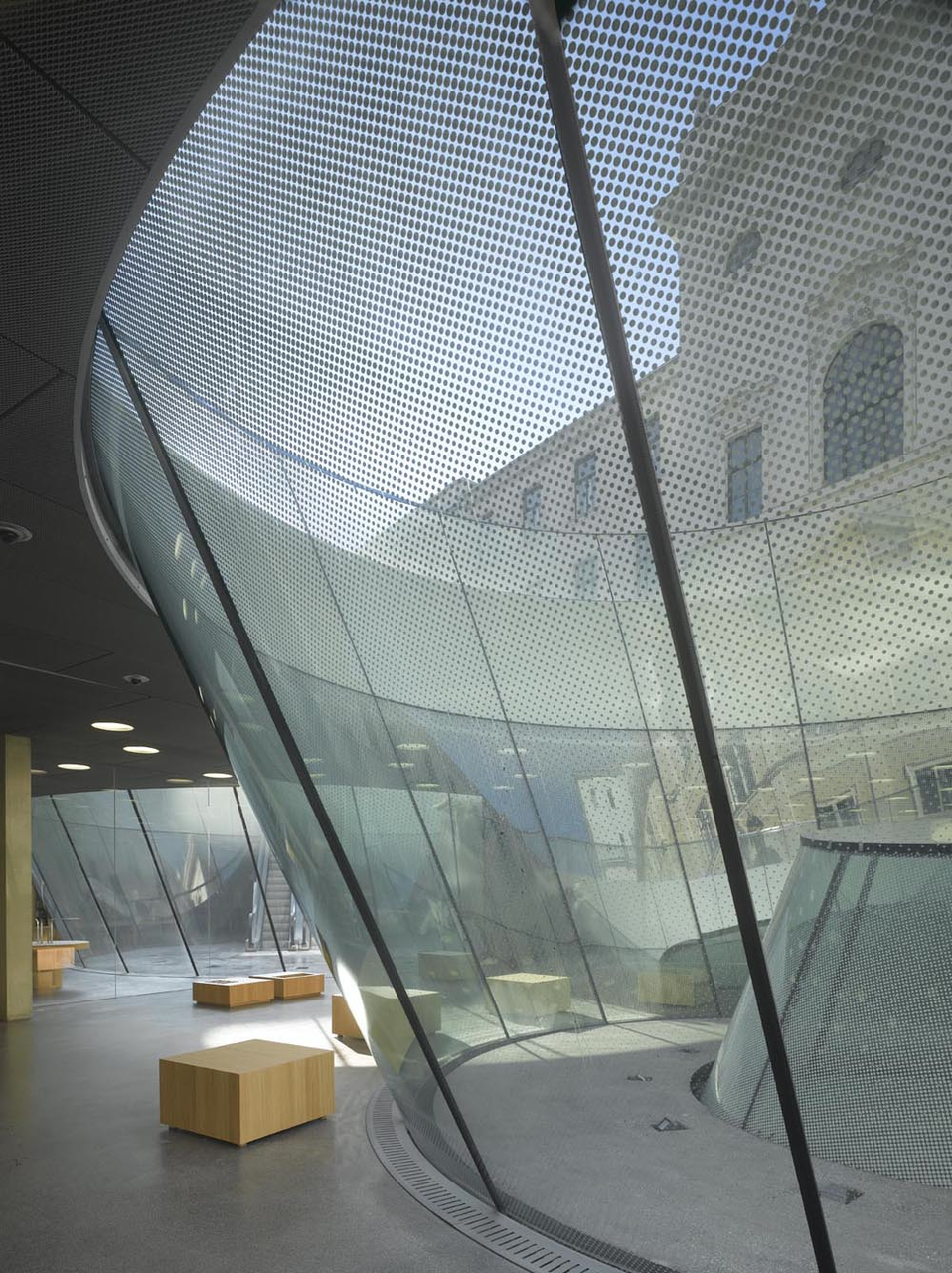 Das Besucherzentrum (unter ihm dient ein zweites Untergeschoß als Bibliothekdepot) ist ein Gefüge aus frei ineinander fließenden Raumzonen. Niveaugleich ordnen sich die Ausstellungsflächen der Multimedialen Sammlungen, ein Museumsshop, ein Veranstaltungsraum, sowie der Freihand- und Entlehnbereich der Landesbibliothek um einen zentralen Info-Desk. Durch Glas- und Sichtbetonwände sowie die hellen Kegelstümpfe wird die Anordnung strukturiert, ohne zerschnitten zu werden. Letzteren verdankt die Ebene auch ihre freundliche Anmutung. Wie die Architekten betonen, kann hier kaum der Eindruck eines Untergeschoßes aufkommen. Problematisch ist allerdings der Anschluss an das Museumsgebäude in der Neutorgasse über ein beengt wirkendes Stiegenhaus, das von hinten in das alte Foyer führt. Und in den Ausstellungsräumen bringen kostensparende Technikwände die ursprünglichen Raumsymmetrien leider aus dem Lot. (Text: Ulrich Tragatschnig)