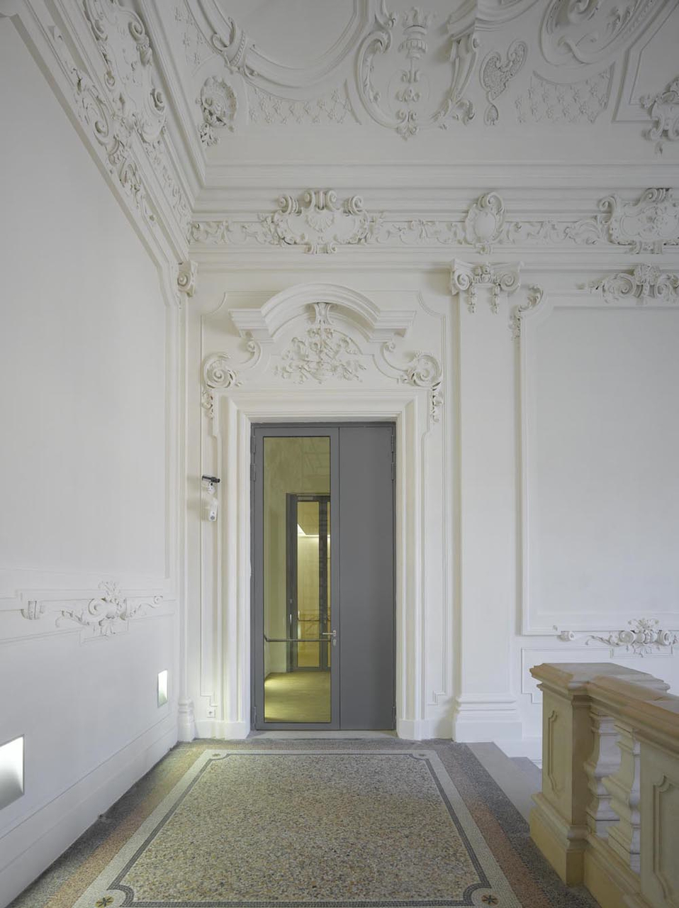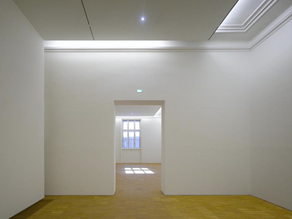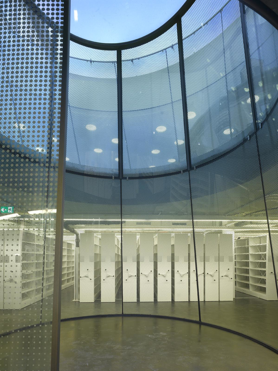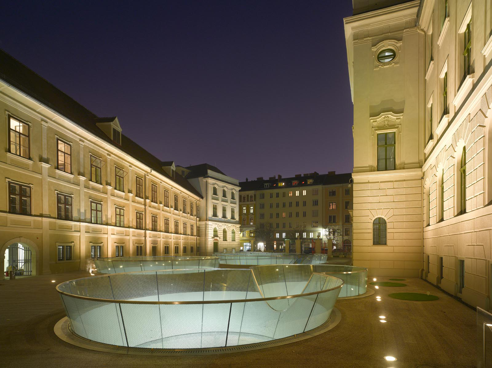Das Besucherzentrum (unter ihm dient ein zweites Untergeschoß als Bibliothekdepot) ist ein Gefüge aus frei ineinander fließenden Raumzonen. Niveaugleich ordnen sich die Ausstellungsflächen der Multimedialen Sammlungen, ein Museumsshop, ein Veranstaltungsraum, sowie der Freihand- und Entlehnbereich der Landesbibliothek um einen zentralen Info-Desk. Durch Glas- und Sichtbetonwände sowie die hellen Kegelstümpfe wird die Anordnung strukturiert, ohne zerschnitten zu werden. Letzteren verdankt die Ebene auch ihre freundliche Anmutung. Wie die Architekten betonen, kann hier kaum der Eindruck eines Untergeschoßes aufkommen. Problematisch ist allerdings der Anschluss an das Museumsgebäude in der Neutorgasse über ein beengt wirkendes Stiegenhaus, das von hinten in das alte Foyer führt. Und in den Ausstellungsräumen bringen kostensparende Technikwände die ursprünglichen Raumsymmetrien leider aus dem Lot. (Text: Ulrich Tragatschnig)