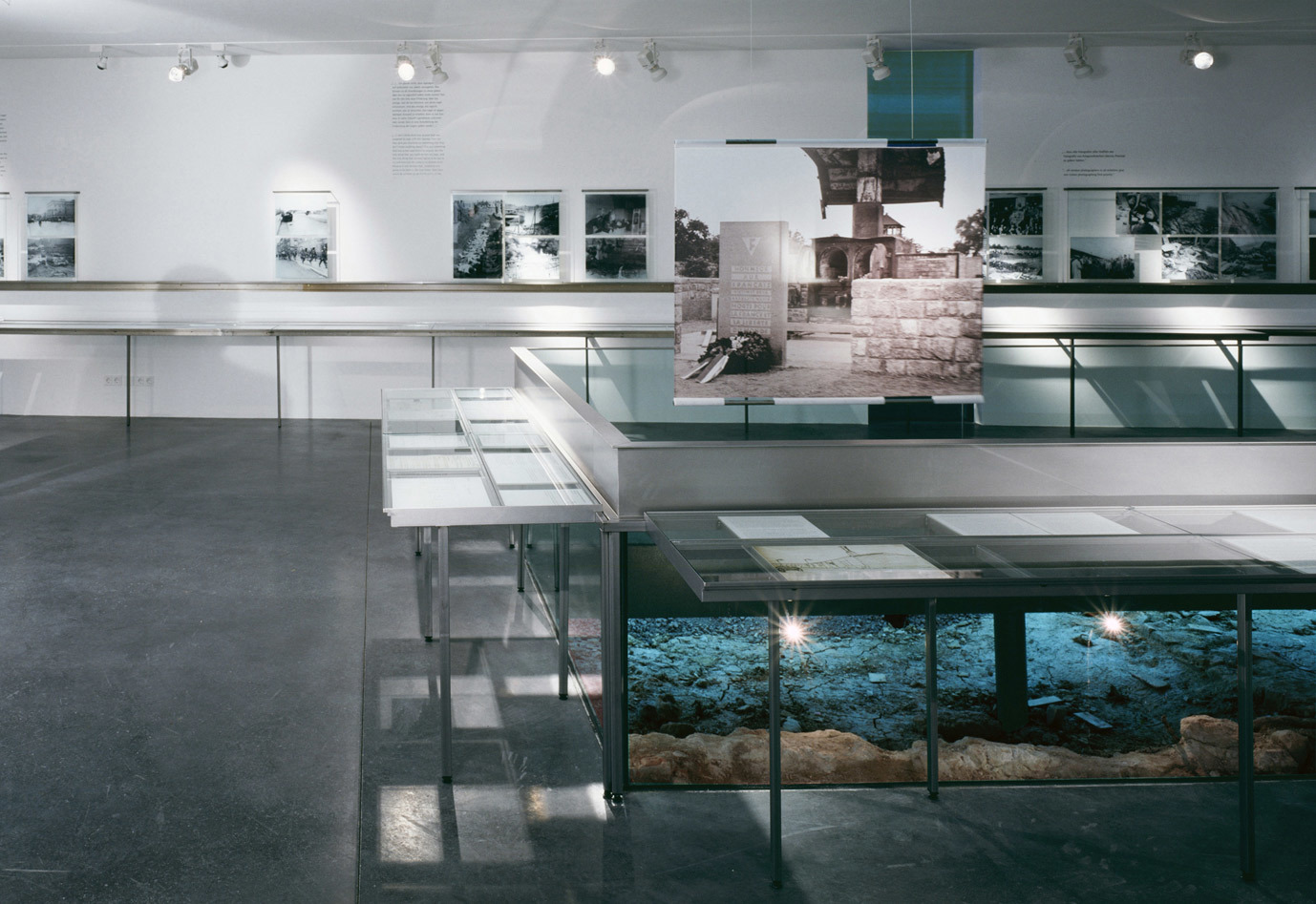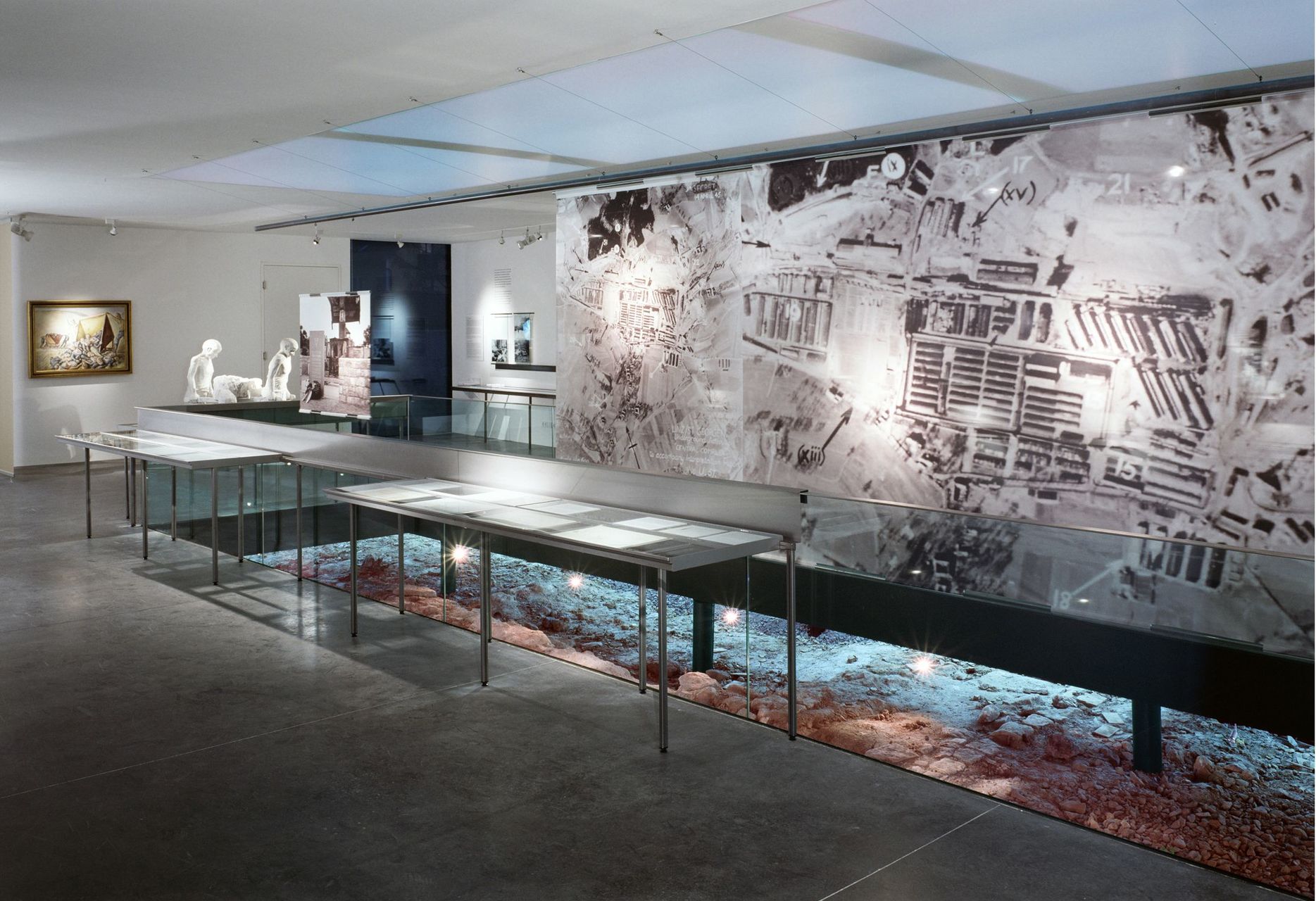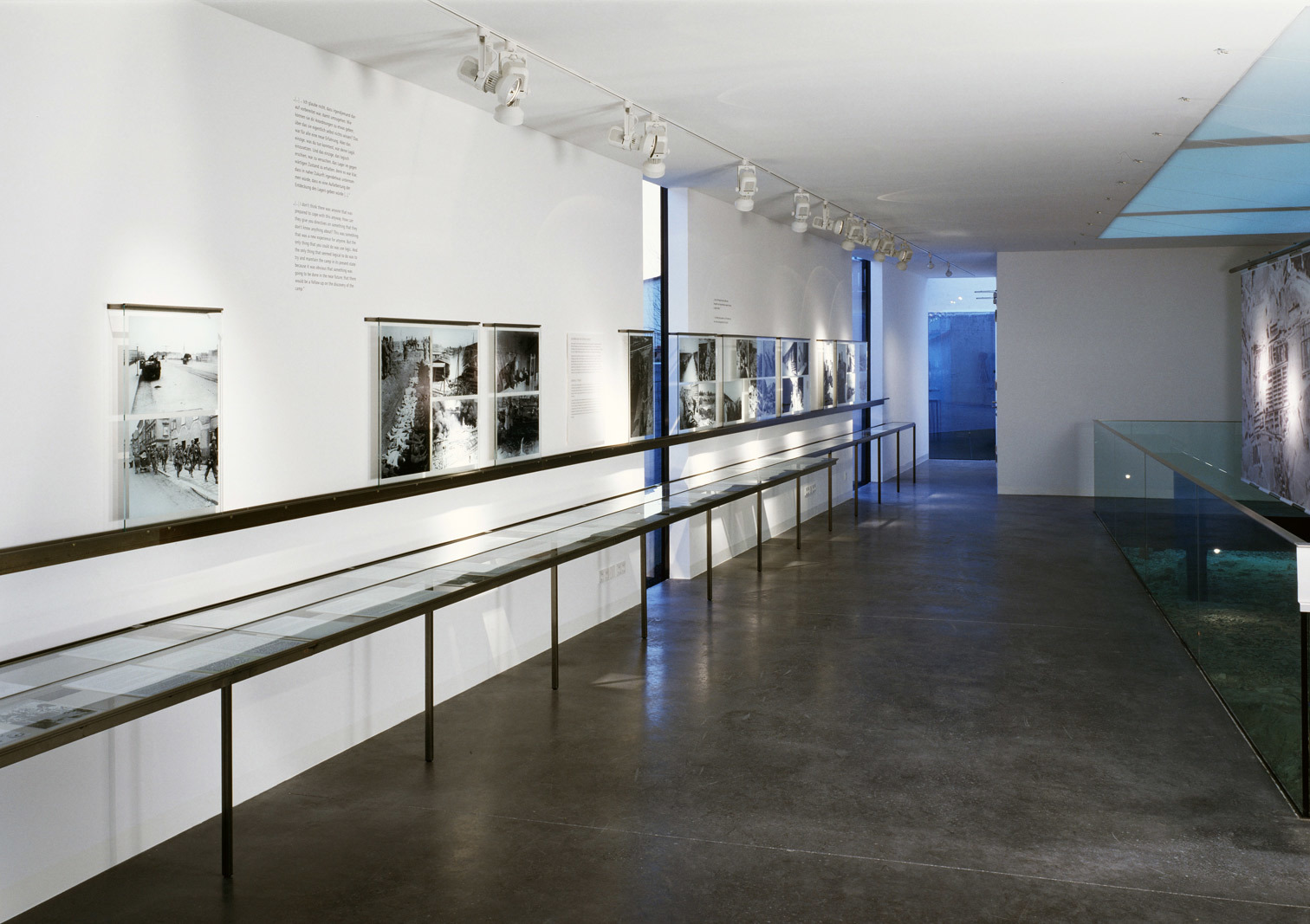 und industrielle Verfahren verweisende Sichtweise gegenüberzustellen: Der Neubau wird als moderne „Baracke“, Behälter und konstruktives Traggerüst interpretiert. Schienensysteme aus gekanteten Metallprofilen, die ihre Einlege- und Aufnahmeteile zeigen, modulartig mit Ausstellungselementen belegt, werden über die Wand und Glasfächen verlegt. Halbtransparente, „immaterielle“ Materialien von geringer haptischer Präsenz, wie die abgehängten textilen Bildträger, treten in Kontrast zur optischen und materiellen Schwere der Sichtbetonwände des Memorials.
