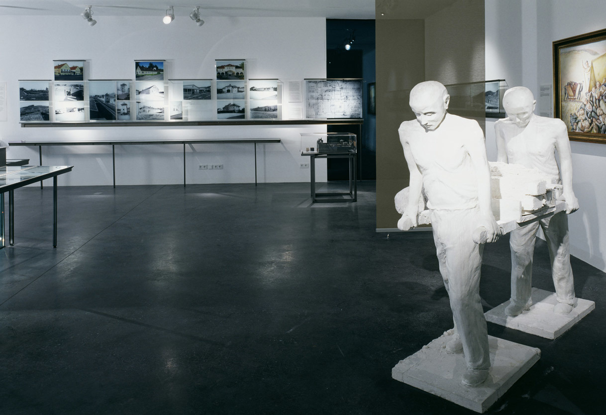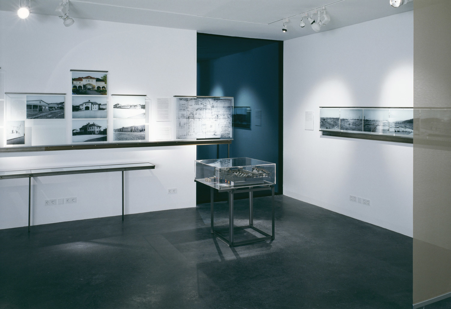 Drittens einen Kontext zwischen der Ausstellung und der umgebenden Einfamilienhaus-Überbauung des ehemaligen KZ-Lagergeländes herzustellen: Baustellenfotos, die die Errichtung der KZ-Lagers zeigen, in die Fensterfläche geführt, überlagern den Blick nach außen. Vor dem Fenster ist ein von einem ehemaligen KZ-Häftling gebautes Modell des Lagers platziert.