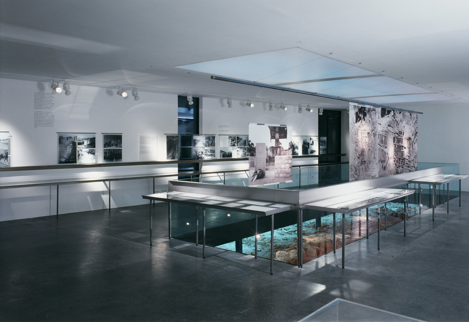 Die zentrale Positionierung und die Größe der Fundstelle im Verhältnis zum verbleibenden Restraum, fordern dazu auf, das Gebäude als zweiten Gedenkraum, neben dem unmittelbar benachbarten Memorial aus dem Jahre 1965, wahrzunehmen. Die Ausstellungsarchitektur versucht diese Entstehungsgeschichte aufzunehmen und auf das Spannungsfeld zwischen Grabungsfund, Neubau und Memorial zu reagieren.