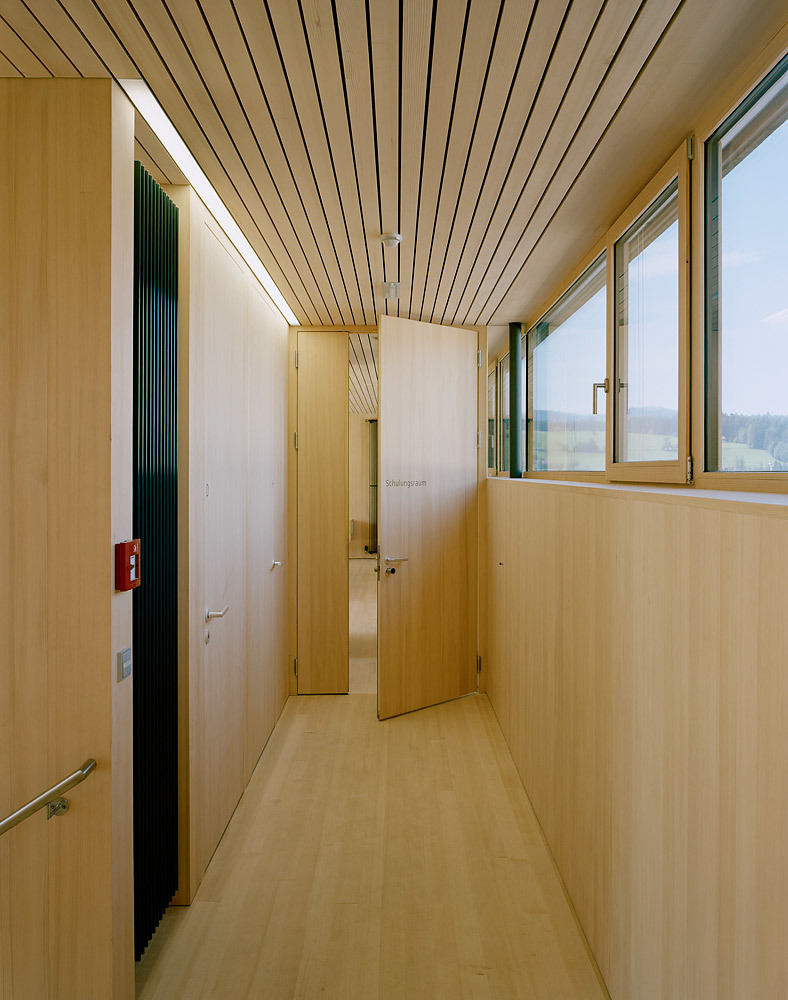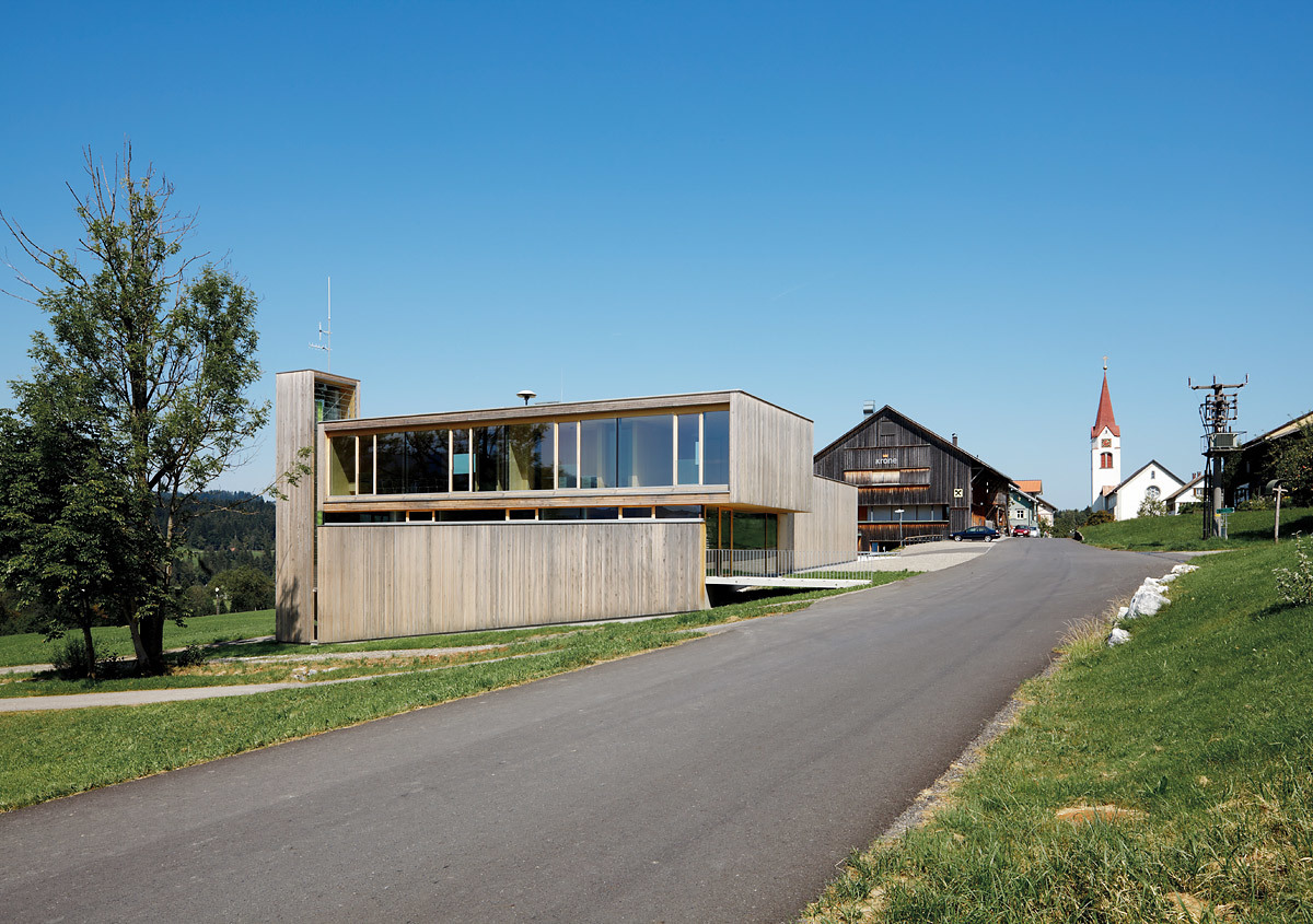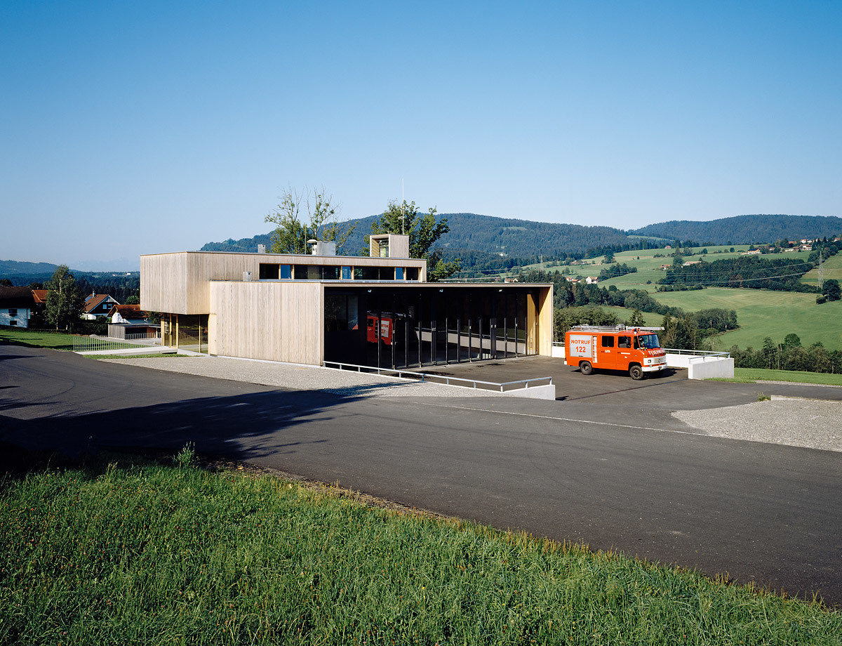 Das neue Feuerwehrhaus des Ortsteils Thal in der kleinen Gemeinde Sulzberg fügt sich zurückhaltend in die dörfliche Struktur ein. Parallel zur Hauptstraße, auf einem abfallenden Gelände situiert, zeigt sich der Zweckbau in Holzschalung bescheiden schlicht. Man muss schon etwas genauer hinsehen, um zu erkennen, dass es sich bei diesem Gebäude um ein Feuerwehrhaus handelt. Drei an- und aufeinandergesetzte Volumen bilden einen Baukörper, dessen Konturen und Charakter unter Rücksichtnahme auf die topographischen Gegebenheiten auf jeder Seite unterschiedlich sind. Die diversen Funktionen des Gebäudes werden bezüglich Raumhöhen und Temperaturzonen jeweils kompakt zusammengefasst und sind architektonisch klar voneinander getrennt. Über der in Massivbauweise ausgeführten Fahrzeughalle liegt das Obergeschoss als Holzbau. Eine vertikal verlaufende Weißtannenschalung verkleidet alle geschlossenen Fassadenflächen des Gebäudes in Niedrigenergiehaus-Standard.Richtung Nordost öffnet sich die Fahrzeughalle über die komplett verglaste Fassade zum Gasthaus Krone und schafft damit einen eigenständigen Platz im Dorfgefüge. Der erhöhte Funk- und Kommandoraum überblickt die Halle, den Platz sowie den Mannschaftszugang. Straßenseitig wird der Bau über eine Zugangsbrücke betreten. Das leicht auskragende Obergeschoss schafft eine gedeckte Eingangssituation. Der Vorraum ist in Richtung Straße verglast und dient als Verteiler zu Obergeschoss, Fahrzeughalle und dahinterliegenden Mannschaftsräumen mit Sanitärbereichen. Das Obergeschoss ist an der Längsseite in Südwest-Richtung raumhoch verglast und nimmt einen Schulungsraum, Dorfarchiv, Büro und Nebenräume auf. Der an zwei Seiten verglaste Schlauchturm tritt von der Straße aus gesehen in den Hintergrund. Von der Rückseite betrachtet, und speziell in beleuchtetem Zustand, bildet er ein besonderes Schmuckstück.