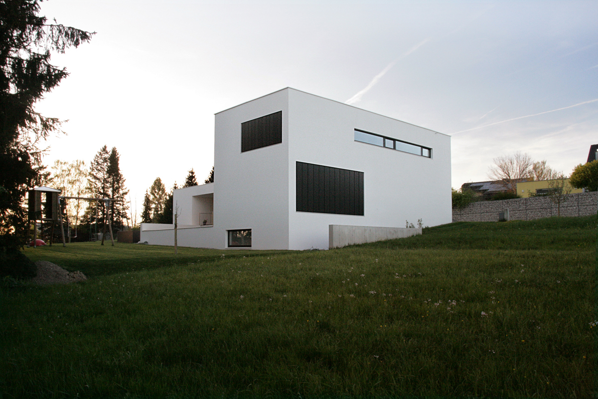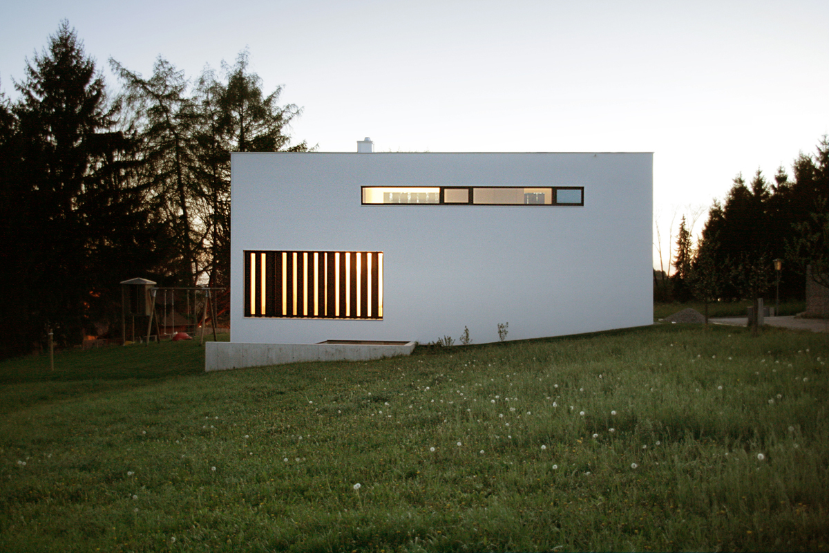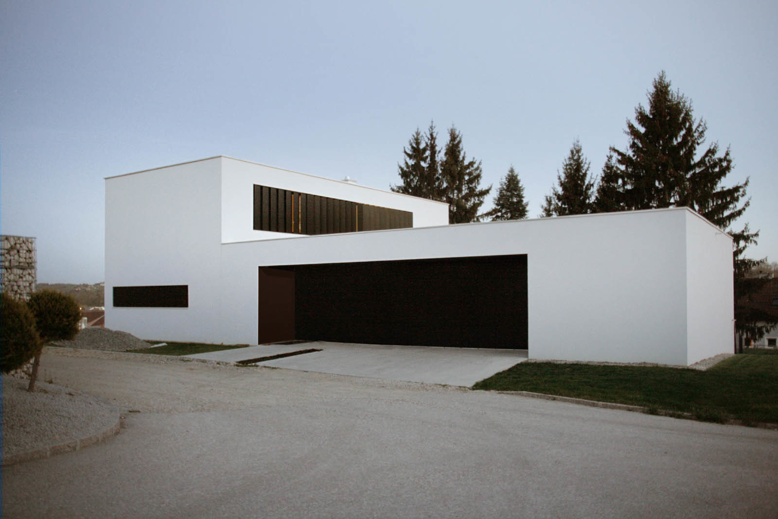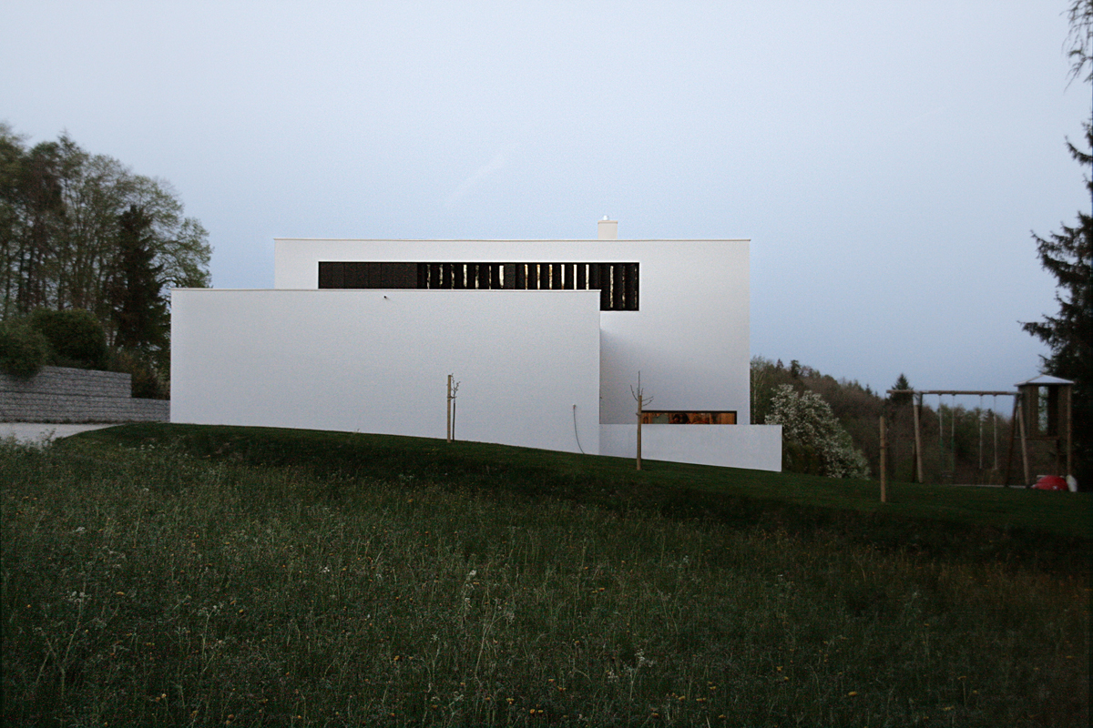 Der Baukörper besetzt als L-Form die nördliche und östliche Grundstücksgrenze und öffnet sich nach süd- west zum Grundstücks-Eck. Den offenen Raumwinkel schließt der Pool mit seiner Wasserkante zum Naturraum ab. Auf der Nordseite zeichnen sich Zufahrt, Hauseingang, Garageneinfahrt und Geräteraum als plastisch-schwarzer Einschnitt im Nebentrakt ab. Ein durchgesteckter langer Vorraum – von der Straßen zur Gartenseite – verbindet diesen mit dem Wohnhaus, welches vertikal in drei dem Hang folgenden, abgestuften Hauptgeschossen gegliedert ist.