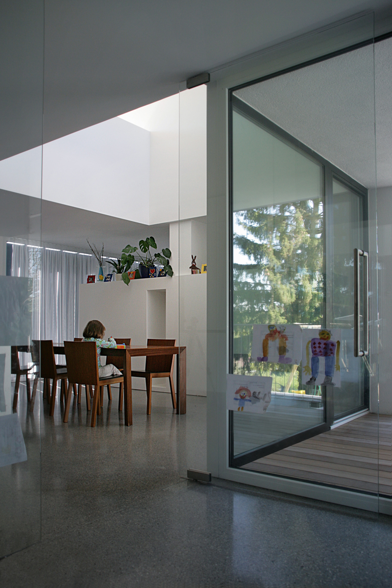 Im Wohnhaus angekommen, öffnet sich der zentrale Essbereich zweigeschossig. Die Öffnung dieses Luftraumes sammelt das Tageslicht bis zum Abendrot, während verstellbare Lamellen sowohl introvertierte Intimität als auch den Blick hinab auf das Stadtzentrum ermöglichen. Diese – für die Beschattung der privaten Fensteröffnungen prägenden – 180°-Schwenklammellen basieren auf Industrieprodukten sowie der Profession des Bauherren und wurde gemeinsam entwickelt und umgesetzt.