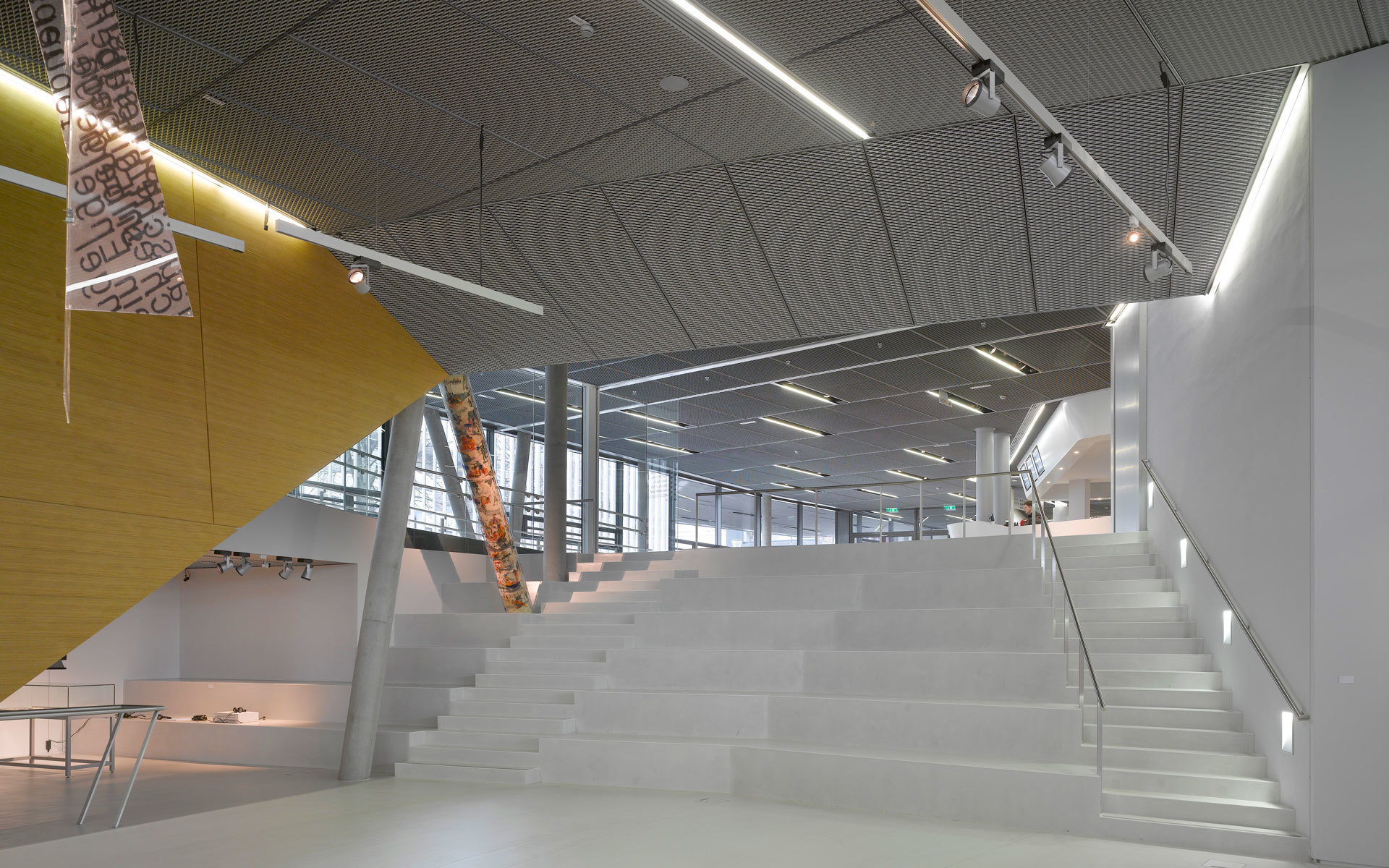 Eine auditoriumsartige großzügige Stufenlandschaft führt den Besucher in einer einladenden Geste in den Ausstellungsbereich, der in die beiden Hauptzonen gegliedert ist: permanente Ausstellung und Wechselausstellung. Beide Bereiche können voneinander getrennt werden, sowohl funktional, als auch raumklimatisch, um den jeweiligen Beanspruchungen zu dienen.
