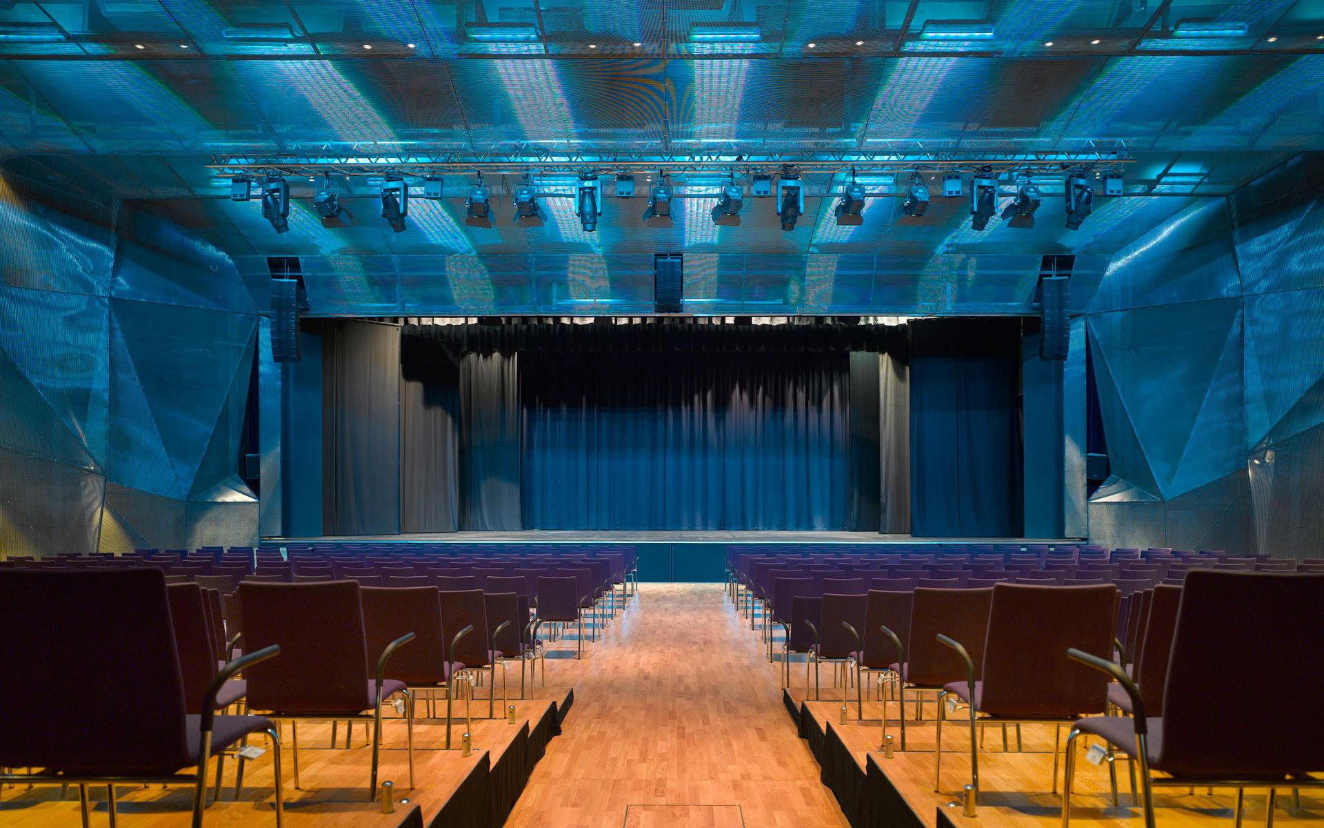 Der kleine Saal selbst ist über einer polygonalen Grundfigur angelegt, die leicht ausgedreht eine tiefere Blickwirkung über die Diagonale des großen Saales hinweg erzeugt und damit eine gewisse Ausrichtung zum Bühnenvorbereich des großen Saales intendiert. Es ist angedacht, auch die Trennwand zum Foyer partiell als mobile Wand auszuführen, womit eine größere Öffnung zum Foyer/Barbereich hin ermöglicht würde und damit einen großen zusammenhängenden Veranstaltungsbereich erzeugt. Der kleine Saal ist mit einem Glasoberlicht versehen und erhält dadurch – insbesondere für Konferenzen – Tageslicht.
