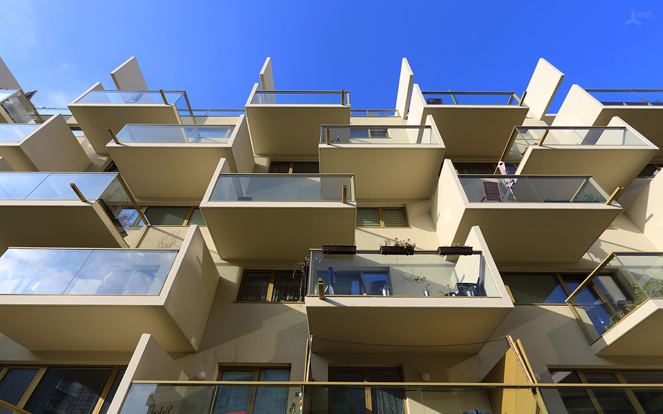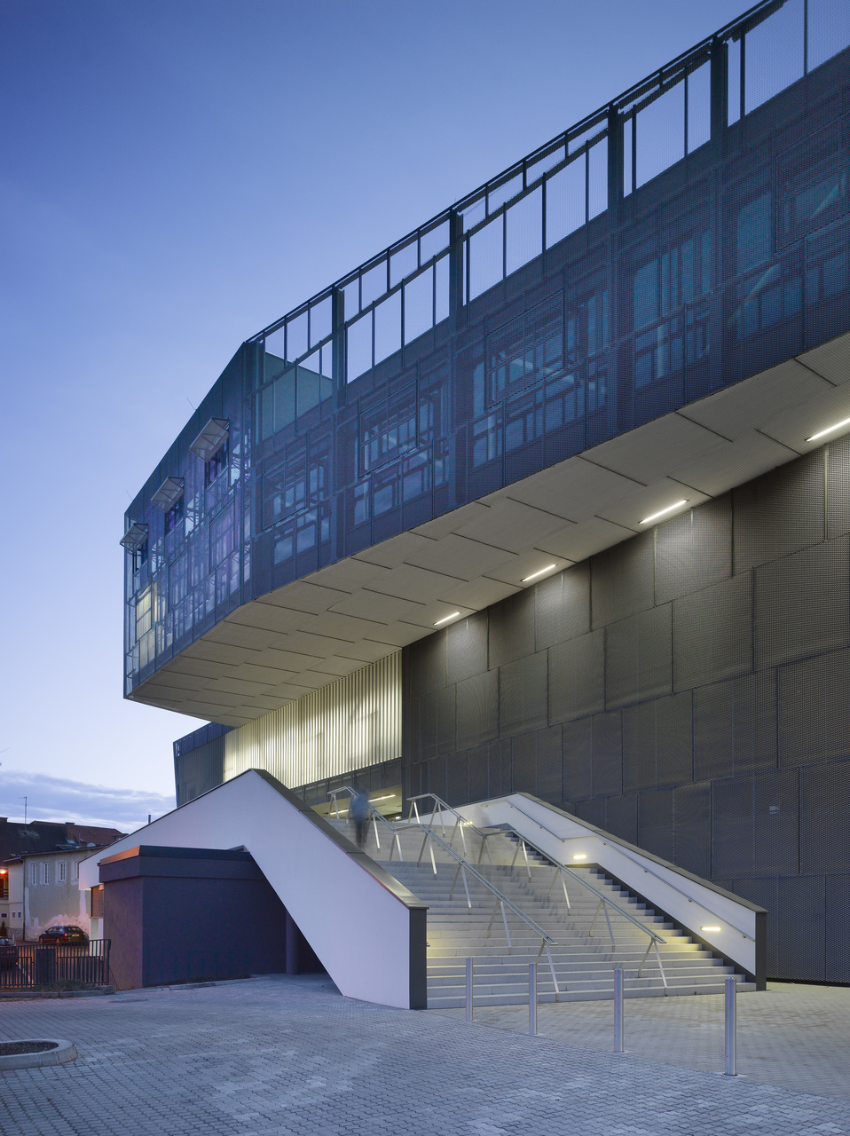 In den unteren Geschoßen tritt die neu geschaffene durchlaufende Glasfassade mit Vertikallamellen als Hauptfassade zum Schubertplatz hin in Erscheinung. Hier wird der öffentliche Charakter des Bauwerkes deutlich zum Ausdruck gebracht. Der Platzraum fließt in das Innere des Gebäudes, das damit ein Teil des öffentlichen Raumes wird, während anders herum das bespielte Foyer als gesellschaftlicher Ort für den Beobachter von außen erkennbar wird.