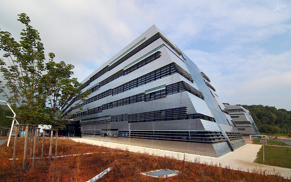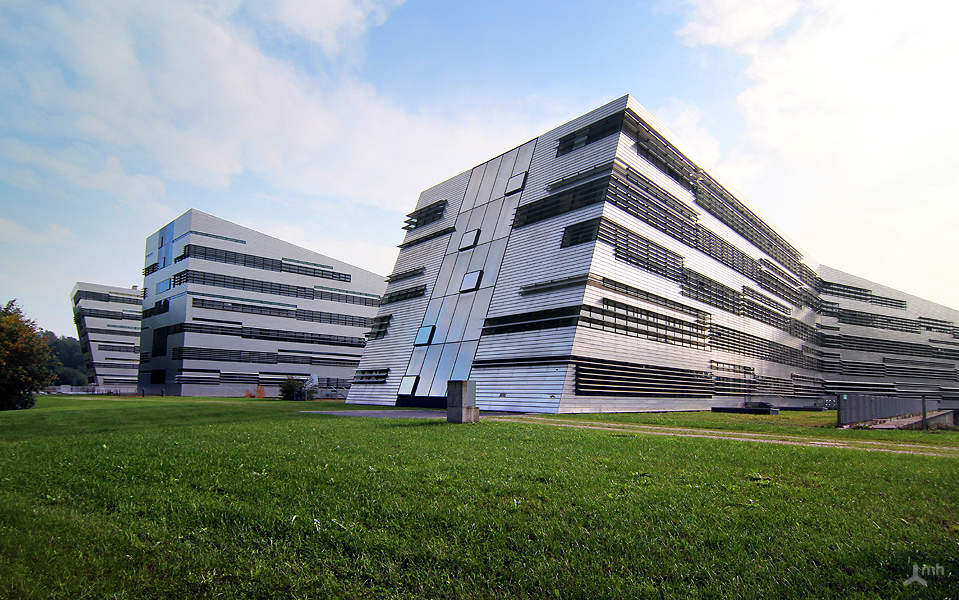 Material: Sowohl der Zubau, als auch die Umbaumaßnahmen erfolgen in Stahlbetonbauweise gemäß statischem Konzept. Als Außenhaut ist eine perforierte Metallhaut als hinterlüftete Fassade angedacht. Diese Metallhaut zieht sich auch zum Teil über verglaste Flächen hinweg und gewährt dort einen gedämpften Ausblick. Vor allem wickelt sich diese Haut auch über die Bestandsfassadenflächen in einem gewissen Abstand als vorgehängte Screen, generiert dadurch die optische Einheit des Gesamtensembles und damit ein neues und elegantes Erscheinungsbild ohne substantiell in die bestehenden Fassadenteile einzugreifen. Die Bestandsfassaden können dadurch unkompliziert und günstig saniert werden. Die großformatigen Glasflächen sind zum Sonnenschutz mit Lamellensystemen versehen – die Bürofassaden zur Südseite gegen die steile Sonne mit Horizontallamellen, die Ost- und die Westfassade mit Vertikallamellen gegen das flach einfallende Sonnenlicht.