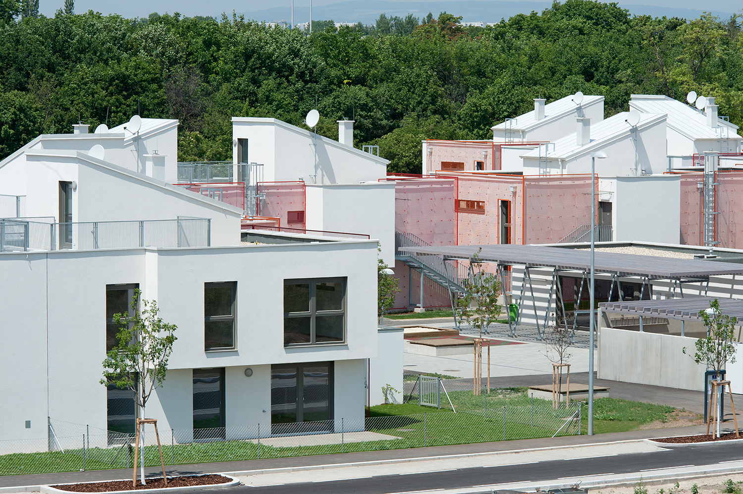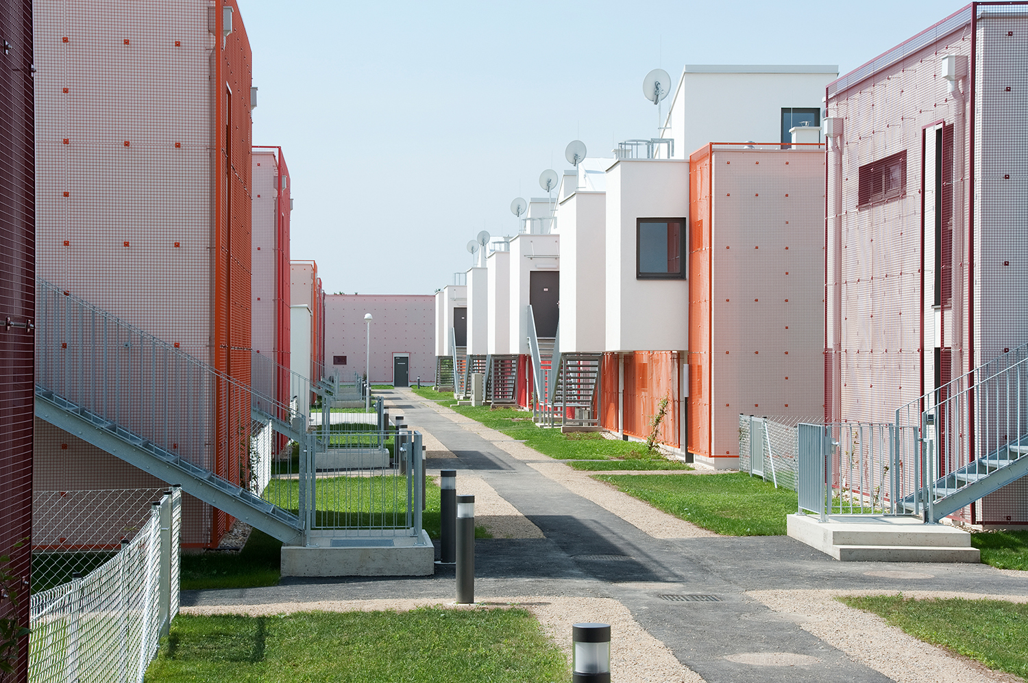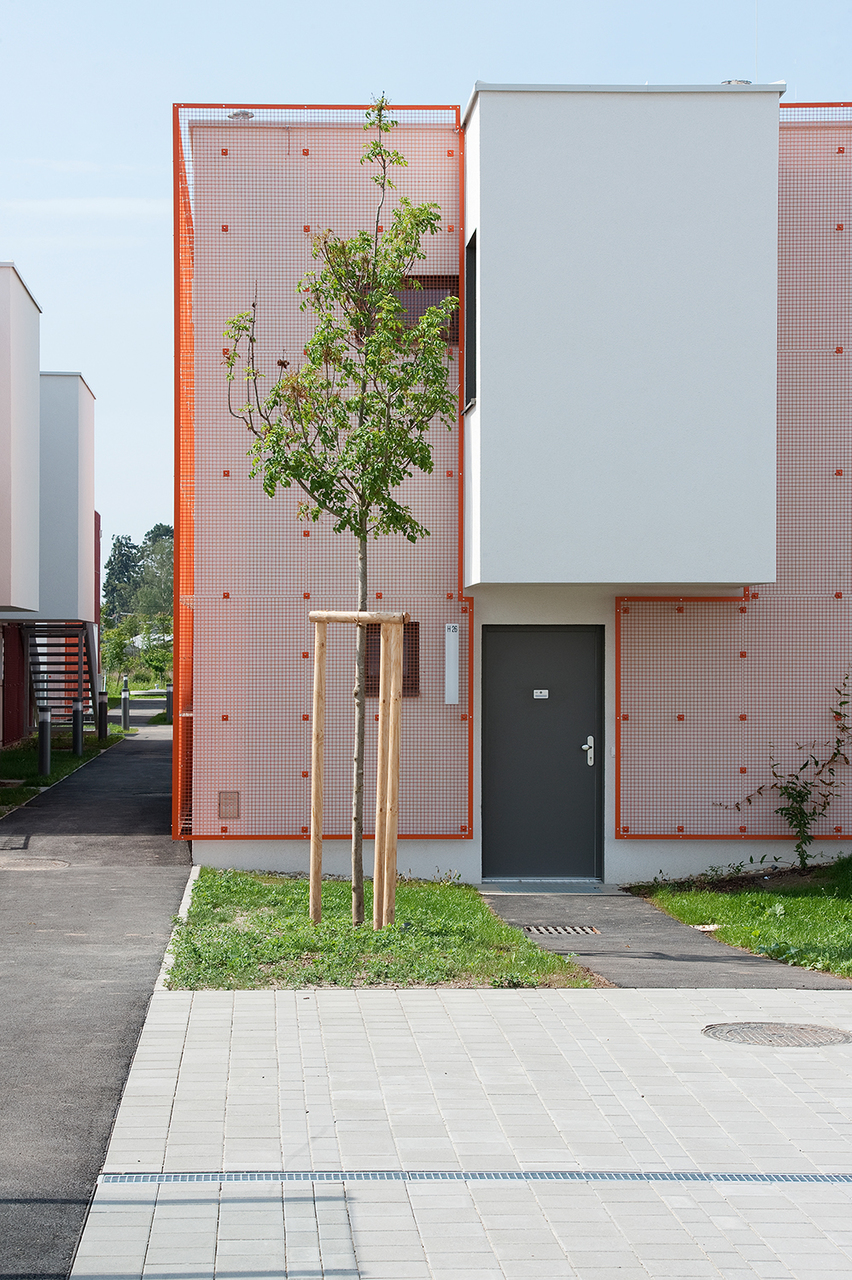 Im ersten Schritt wurden Eigengärten und Dachterrassen voneinander abgewandt. Die daraus resultierende räumliche Situation ist ungewohnt, jedoch sehr wirksam: nahezu fensterlose Hausrückseiten werden zur Ansichtsfläche – zu einer bunten, begrünten Ansichtsfläche wohlgemerkt, denn an den Außenwänden befinden sich vorgehängte Rankgitter in den Farben Orange, Tomatenrot und Rosarot. Der bildlich rote Faden bildet einen frischen Kontrast zum Grün der Pflanzen, die bereits nach kurzer Zeit die Gitter überwachsen haben. Die Lichteinbuße bei den wenigen vergitterten Fenstern ist insofern verträglich, als sich dort Nebenräume befinden (Toilette, Badezimmer). Zusätzliche Abschirmung vor Einblicken bieten Stauraum-Hütten. Die Stauräume bilden den Ersatz für nicht vorhandene Kellerabteile. Die Gartensiedlungshäuser sind nicht unterkellert.