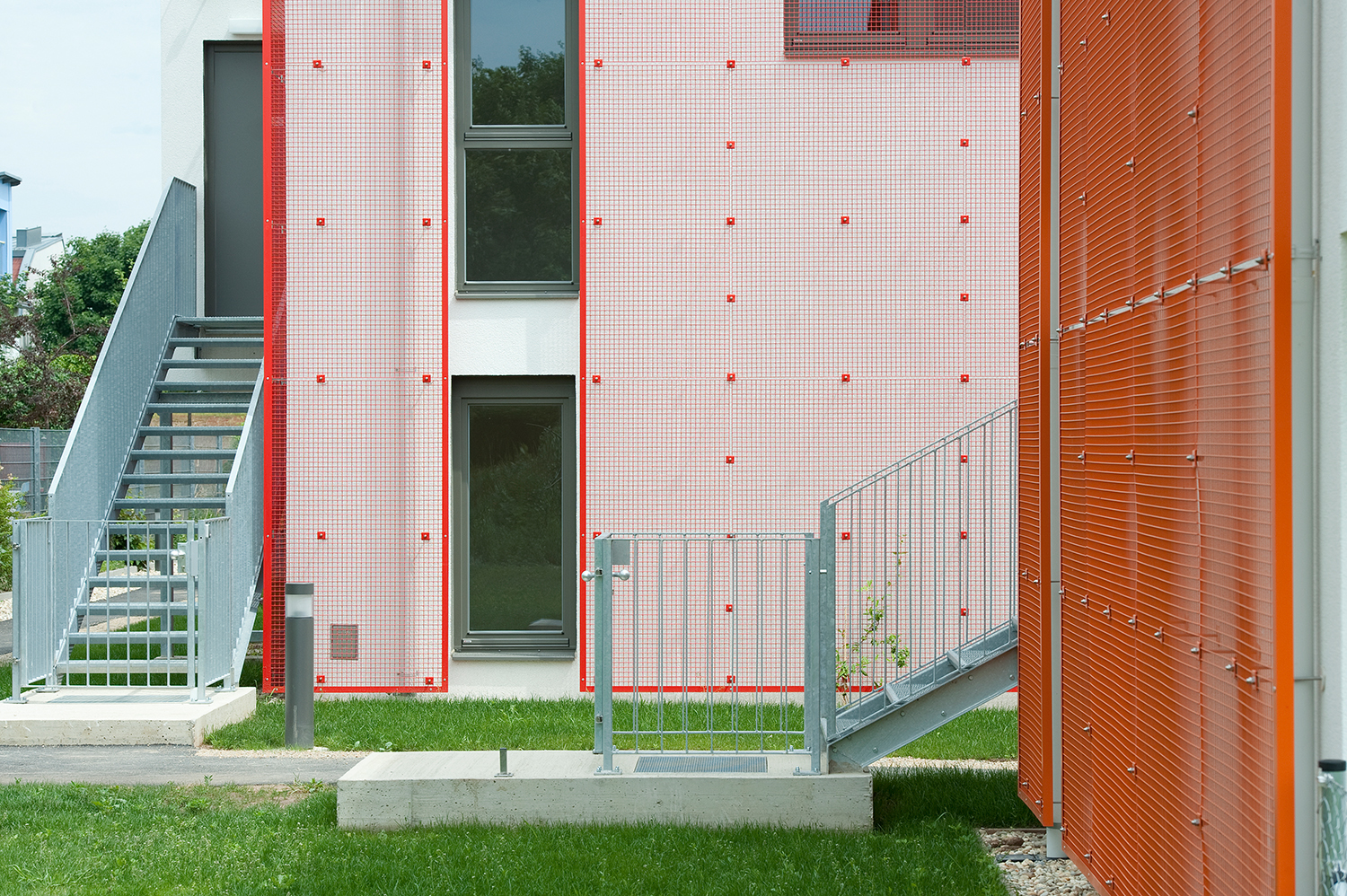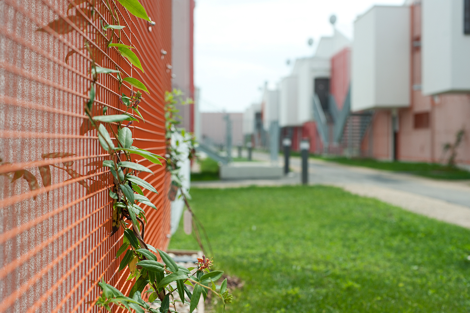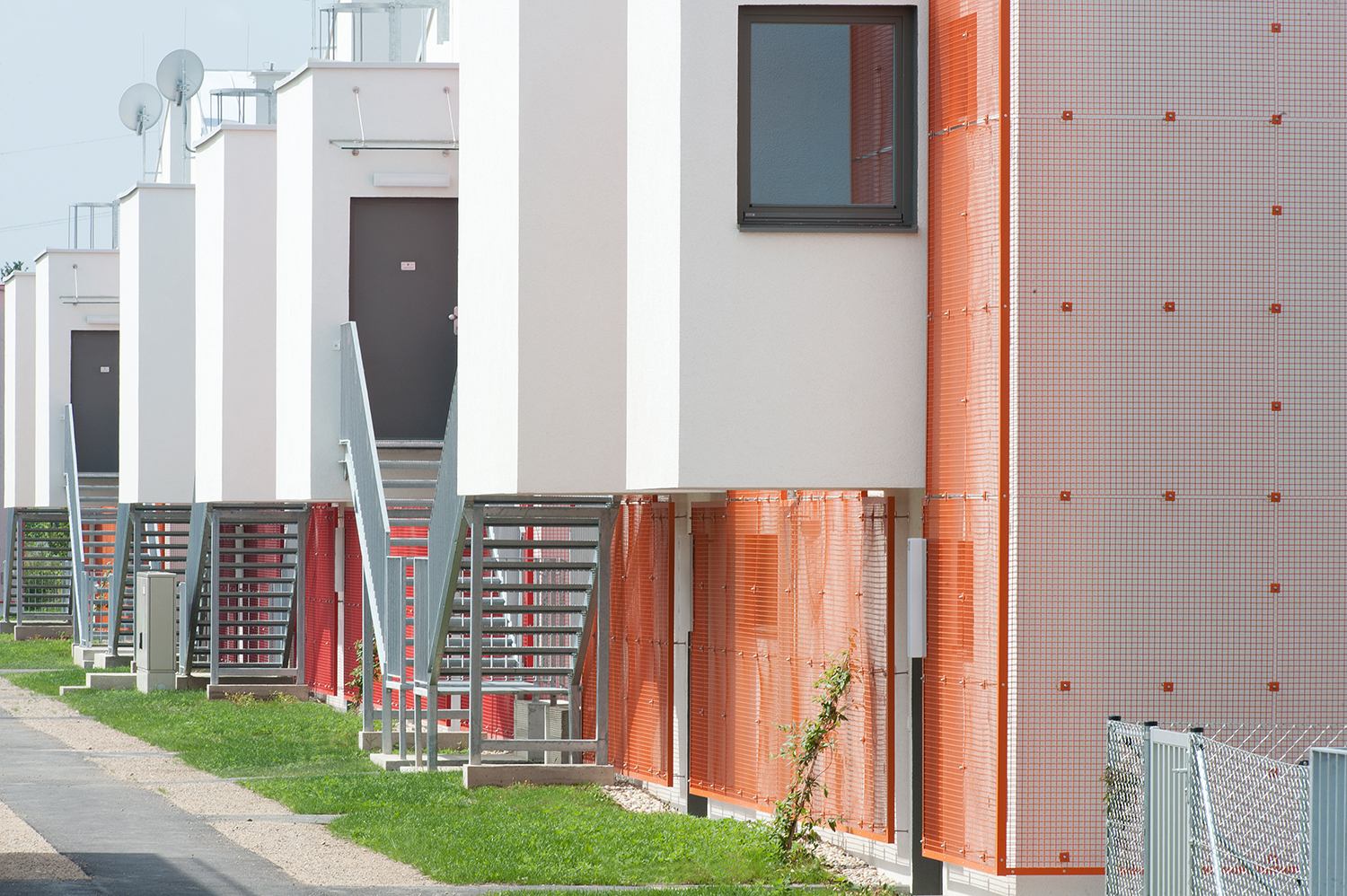 Im ersten Schritt wurden Eigengärten und Dachterrassen voneinander abgewandt. Die daraus resultierende räumliche Situation ist ungewohnt, jedoch sehr wirksam: nahezu fensterlose Hausrückseiten werden zur Ansichtsfläche – zu einer bunten, begrünten Ansichtsfläche wohlgemerkt, denn an den Außenwänden befinden sich vorgehängte Rankgitter in den Farben Orange, Tomatenrot und Rosarot. Der bildlich rote Faden bildet einen frischen Kontrast zum Grün der Pflanzen, die bereits nach kurzer Zeit die Gitter überwachsen haben. Die Lichteinbuße bei den wenigen vergitterten Fenstern ist insofern verträglich, als sich dort Nebenräume befinden (Toilette, Badezimmer). Zusätzliche Abschirmung vor Einblicken bieten Stauraum-Hütten. Die Stauräume bilden den Ersatz für nicht vorhandene Kellerabteile. Die Gartensiedlungshäuser sind nicht unterkellert.