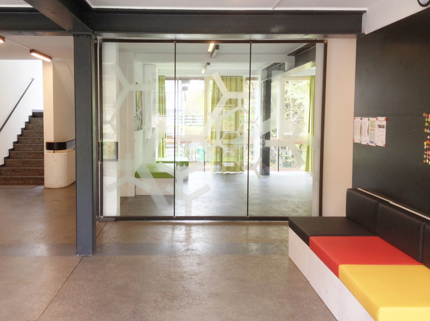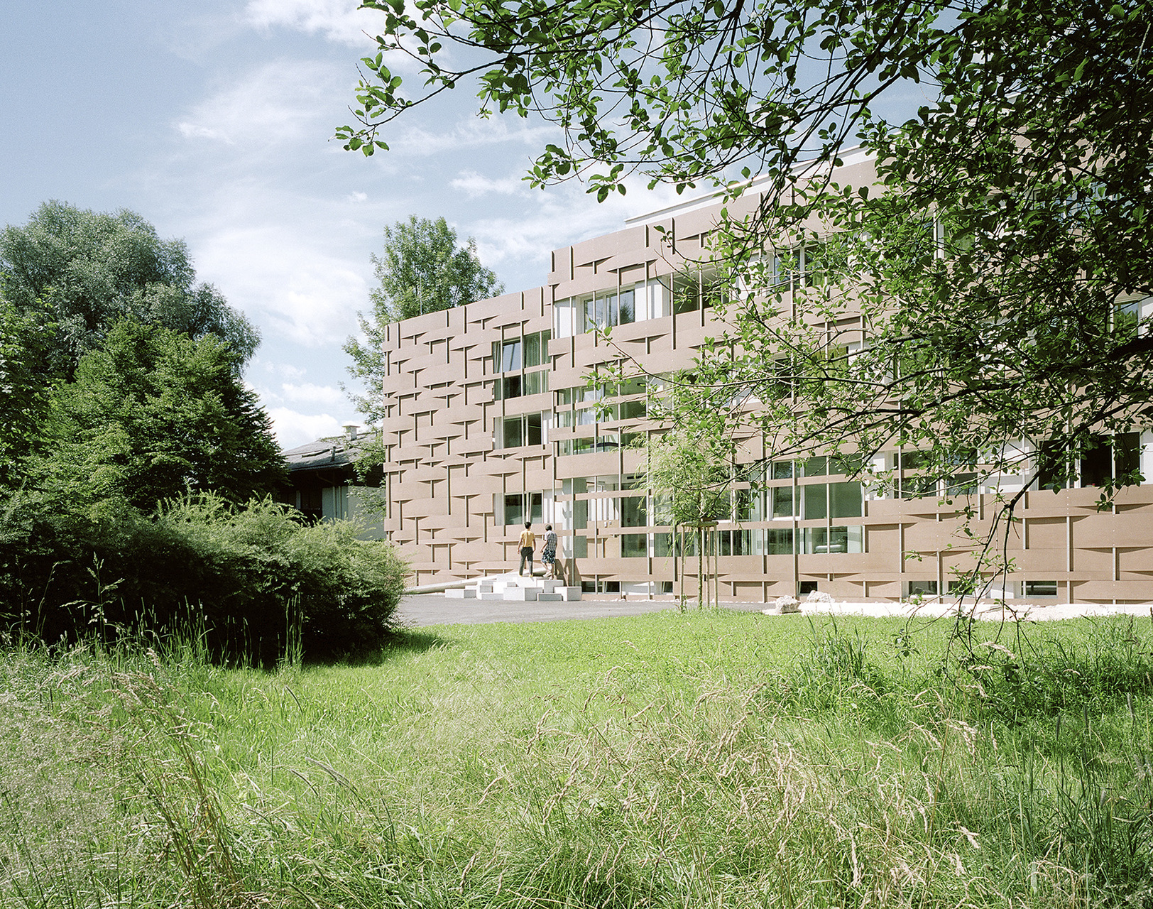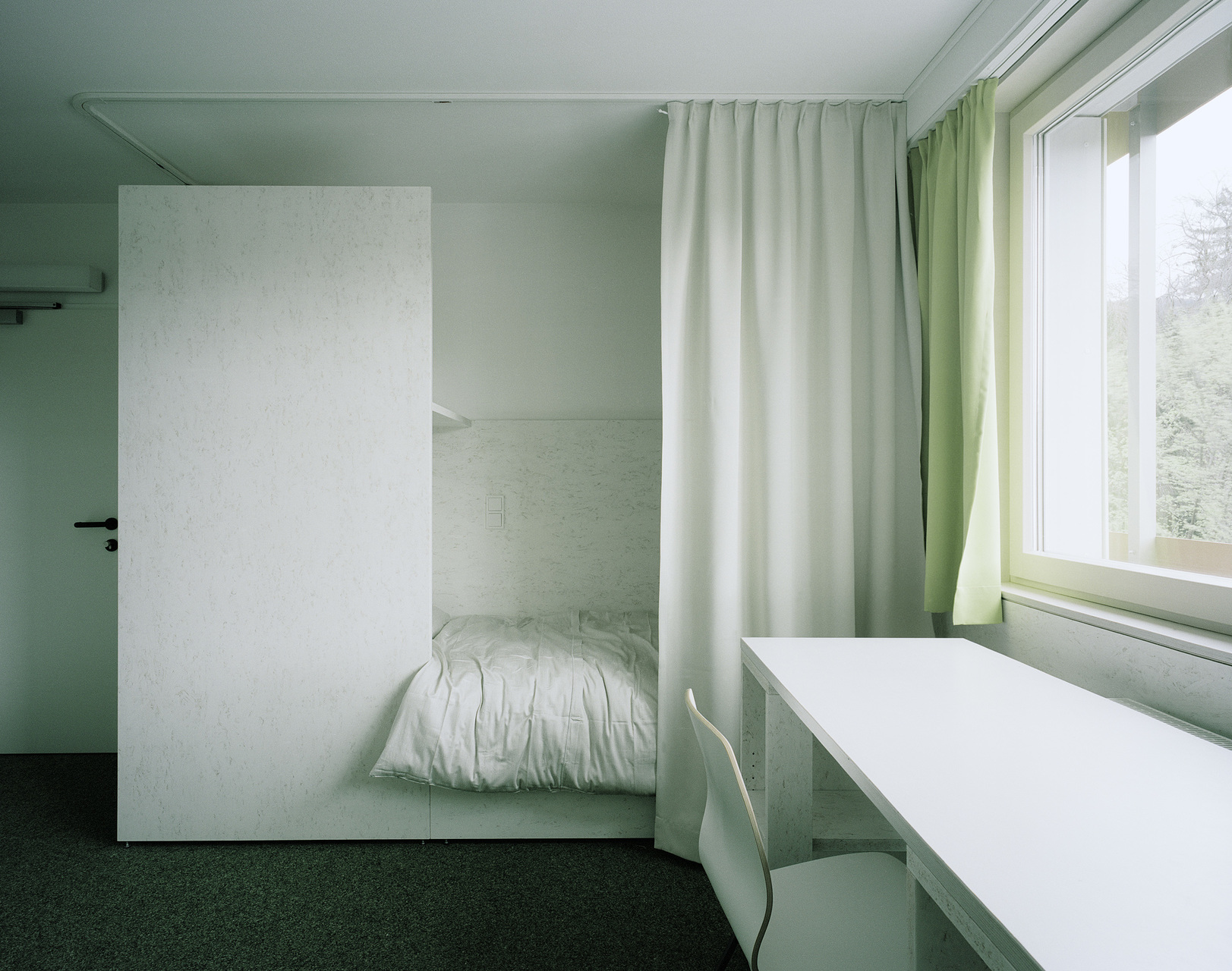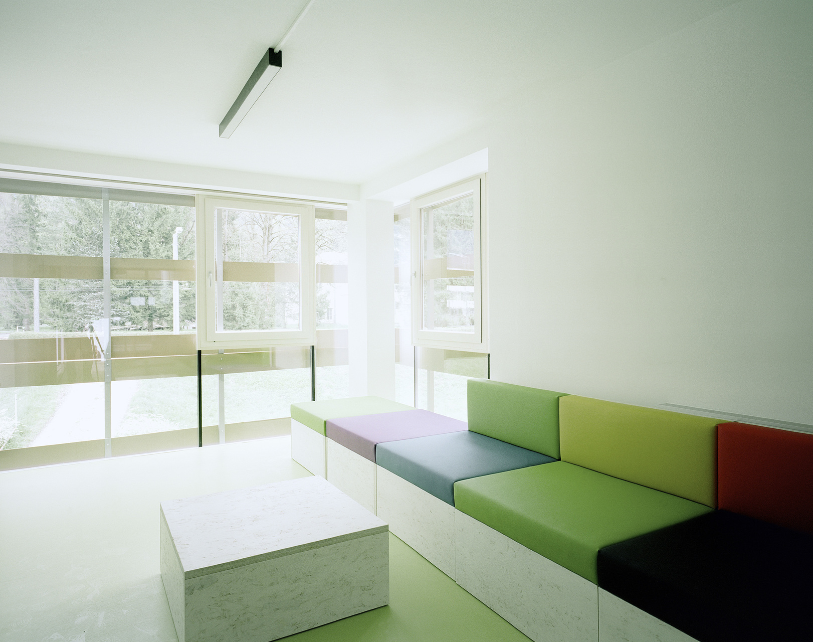 Im Inneren dominieren nun lichtdurchflutete Durchsichten und funktionelle Raumverbindungen. Weiße OSB-Platten (= Grobspanplatten) als Wandoberflächen setzen einen angenehmen Kontrast zu den bestehenden Putzstrukturen. Selbst für die intimen Rückzugsorte wurden eigene Schlafmöbel aus dem gleichen robusten Material entwickelt. Ressourcenschonend ist auch der Umgang mit den demontierten Brüstungselementen aus Waschbeton. Sie werden nun als Sitzbänke und Terrassenbelage im Außenraum verwendet. (Text: Architekt)