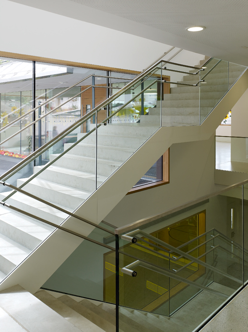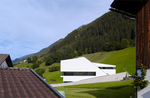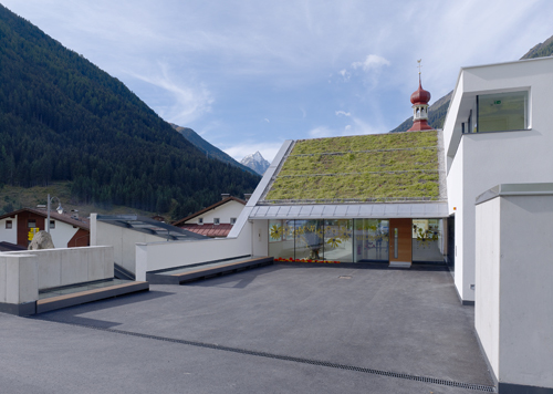 Der winkelförmige Baukörper umfängt einen hangaufwärts liegenden Vorplatz, der zusammen mit der dem Geländeverlauf folgenden Freitreppe eine künstliche Topografie bildet. In Anlehnung an die ortsübliche Materialsprache wurde der signifikant geformte und von jeder Richtung aus unterschiedlich in Erscheinung tretende Neubau weiß verputzt, Sonnenlamellen aus Holz und begrünte Schrägdächer tragen dazu bei, dass er sich in den dörflichen Kontext integriert. (Text: Claudia Wedekind)