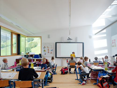Unter Ausnutzung der Hanglage wurde der Kindergartenbereich südseitig im eigentlichen Untergeschoss angeordnet, nördlich davon der gemeinsam nutzbare Turnsaal und im Erd- und Obergeschoss die Räume der derzeit zweiklassigen Volksschule sowie eine als Mittelpunkt des Hauses konzipierte Aula, die von beiden Einrichtungen für die Nachmittagsbetreuung genutzt wird.