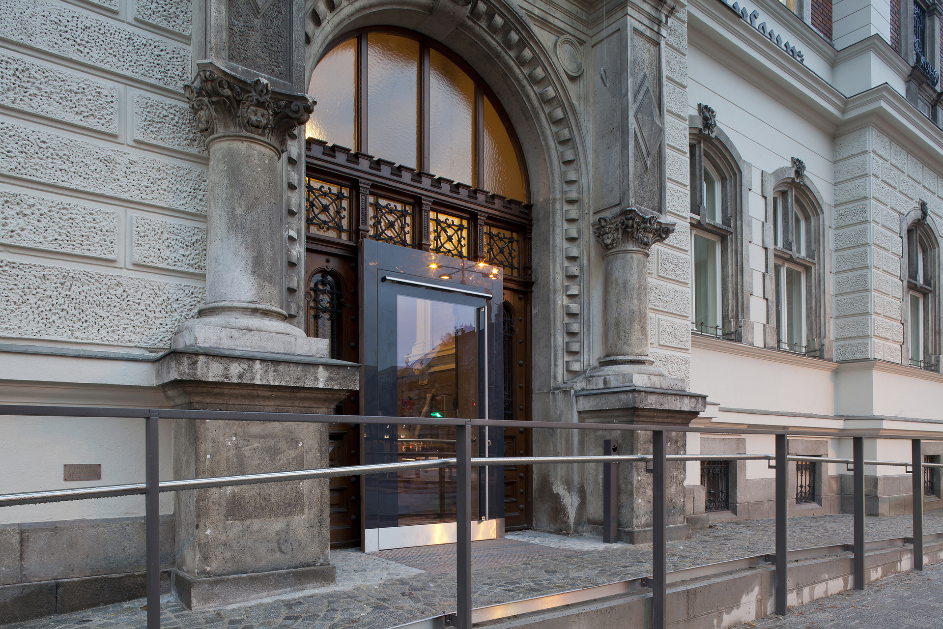 Auf der öffentlichen „Stadtfassade“ sind nur wenige Interventionen spürbar um nicht mit der reich gegliederten historischen Erscheinung zu konkurrieren. So wurde ein barrierefreier Zugang über eine Fußgängerrampe und ein neues Portal geschaffen, welches wie eine Box im bestehenden massiven Eichentor steckt.