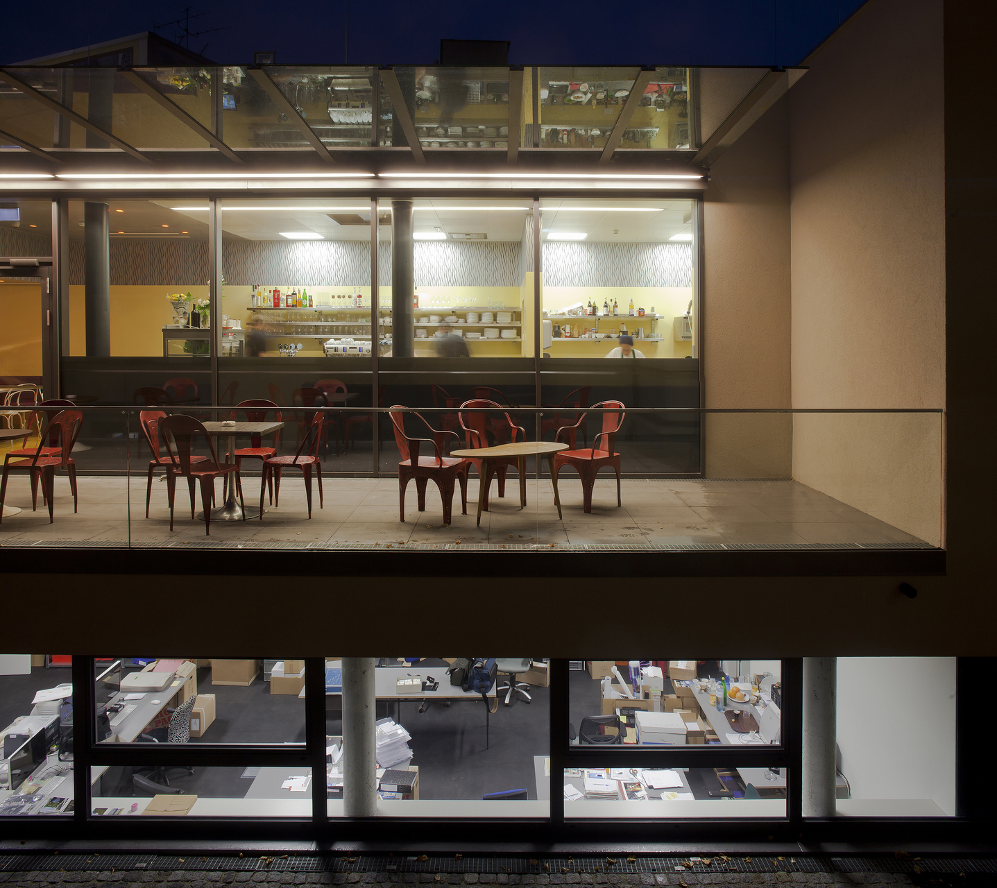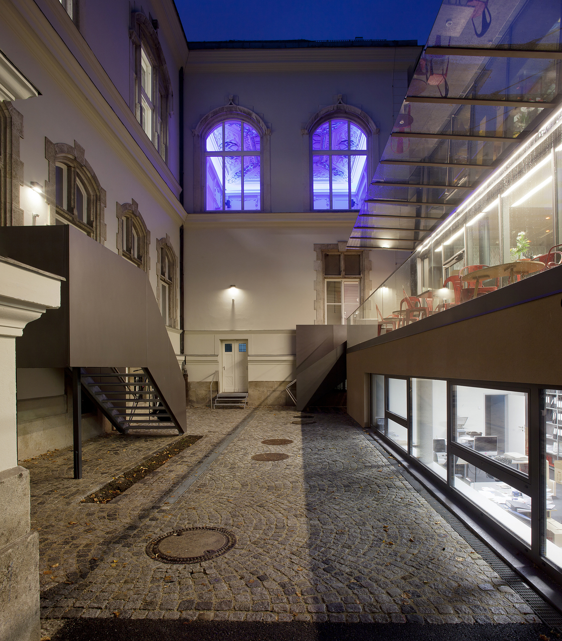 Ein zweigeschossiger Zubau im Hof erstreckt sich entlang der Grundgrenze und beherbergt neben dem Restaurant mit offener Schauküche und Terrasse diverse Räumlichkeiten für YOUKI und Buch.Zeit. Der schmale Baukörper dockt mit einem niedrigen, transparent gehaltenen Gelenk an die Bestandsfassade an, ohne dabei dessen Solitärcharakter zu beeinträchtigen. Die neu gewonnene Aufenthaltsqualität der Hofsituation wird zusätzlich durch das Freihalten von Autos gewährleistet.