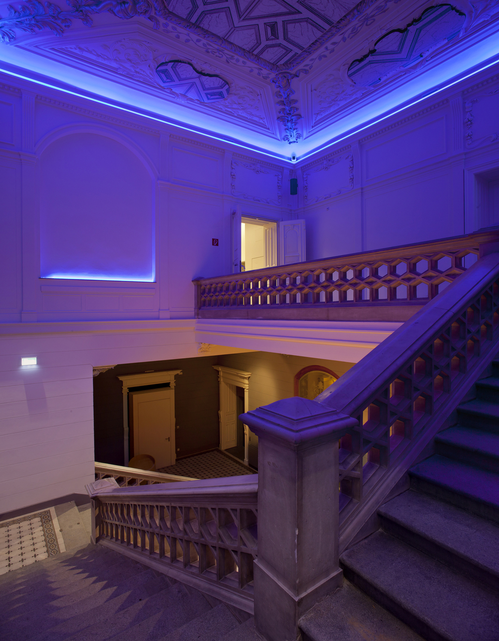 Der Zugang zu den beiden Kinosälen erfolgt über Schleusen, die als Einschub in den historischen Türgewänden sitzen und in ihrer Gestaltung einen deutlichen Kontrast markieren. Der große Saal bietet Platz für 90 Zuseher unter optimalen technischen und räumlichen Voraussetzungen. Ein zweiter Fluchtweg führt über eine Freitreppe direkt in den Hof. Der kleine Saal ist für ca. 50 Personen ausgelegt und bietet durch seine flexible Möblierung Synergien in der Nutzung mit den anderen Mitstreitern des Hauses.