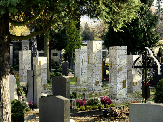 Anstatt wie bisher gesonderte Bereiche für die Urnenbeisetzung zu schaffen, wurden freistehende Urnenstelen entwickelt, die je nach Möglichkeit und Bedarf, in kleinen Gruppen in die bestehende Friedhofsstruktur gemischt werden.