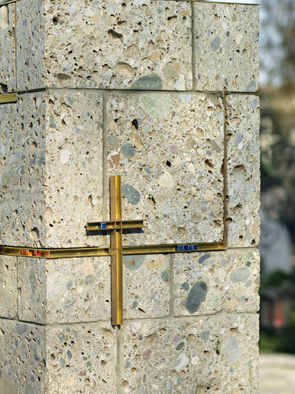 Auch die Stelen selbst verfolgen den Gedanken des individuellen und situativen Wachsens: Konglomerat und Messing als bewusst gewählte Materialien, die ein Altern erlauben und so der Natürlichkeit der Anlage von St.Barbara entsprechen. Das Messing, welches den Stein wie eine Lebensader durchzieht, erlaubt es den Trauernden die Stele durch eigens entwickelte Accessoires, wie Vasen, Kreuze, Keramiken, etc. selbst zu gestalten und zu erweitern.