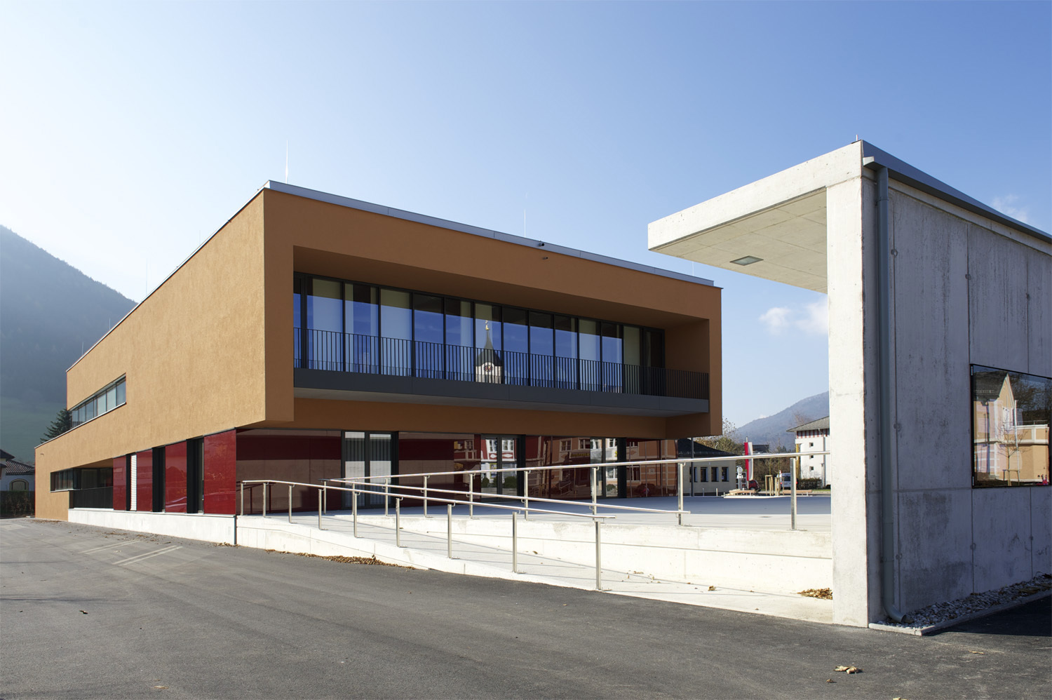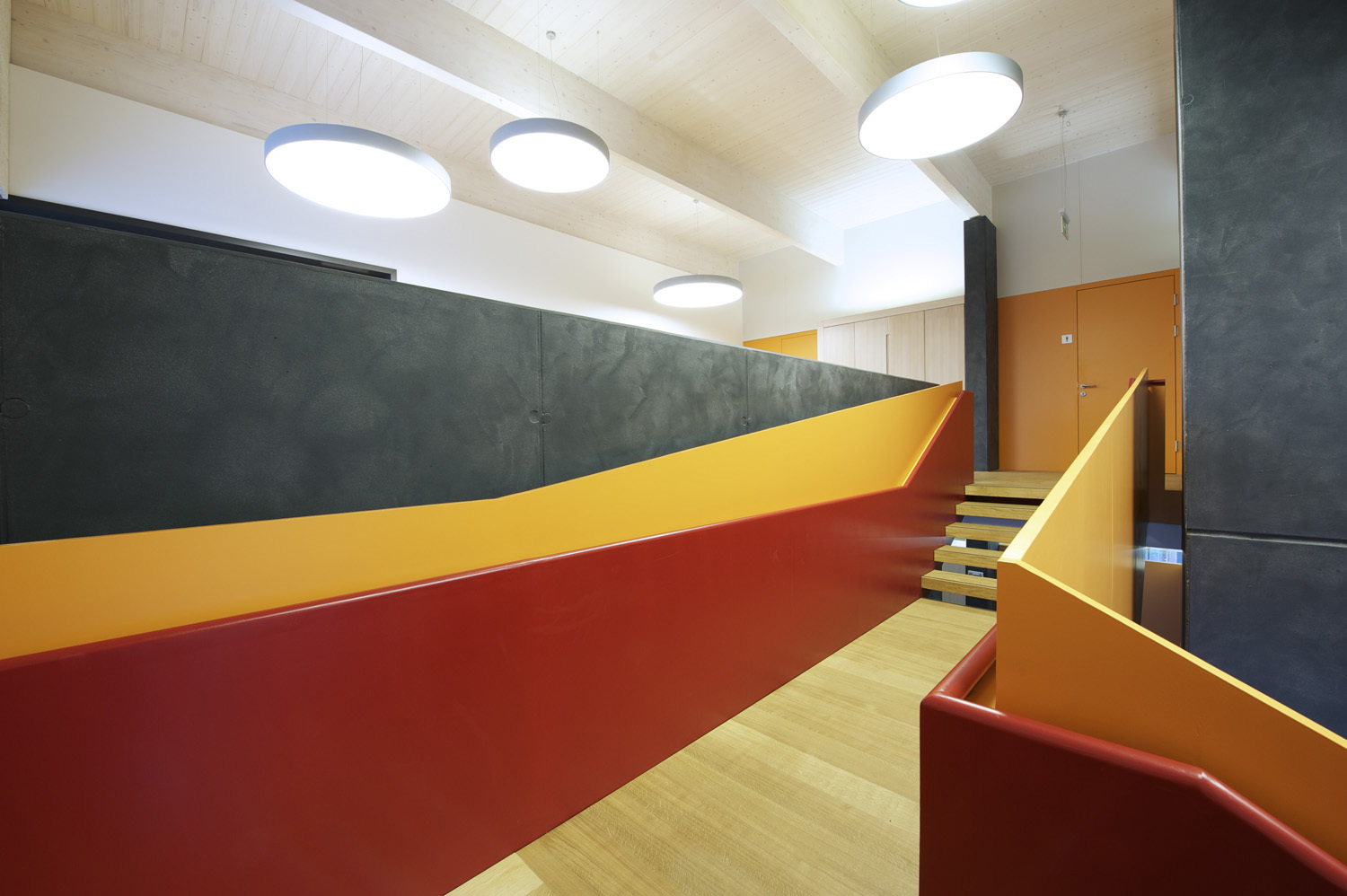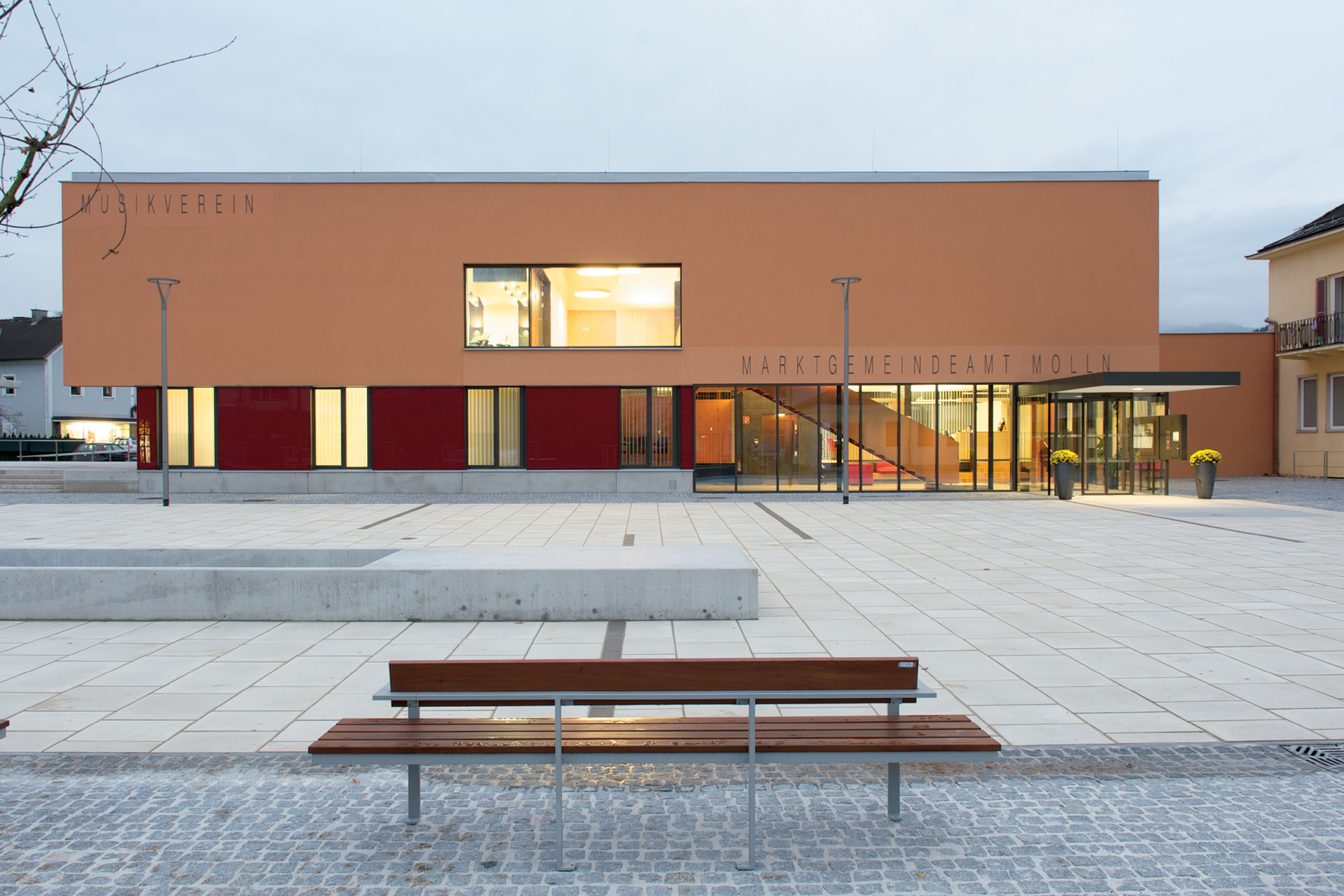 Die Räume des Gemeindeamtes und des Musikvereins werden über ein gemeinsames Foyer auf Platzniveau erschlossen. Die Amtsräume liegen auf der Ebene des Altbaus und ermöglichen dadurch die Anbindung an den Bestand. Im Obergeschoss finden sich die Räume der Musik mit dem nach Norden orientierten Probesaal. Sie bilden einen eigenen Bereich im Gebäude, ohne den Amtsbetrieb zu durchkreuzen.