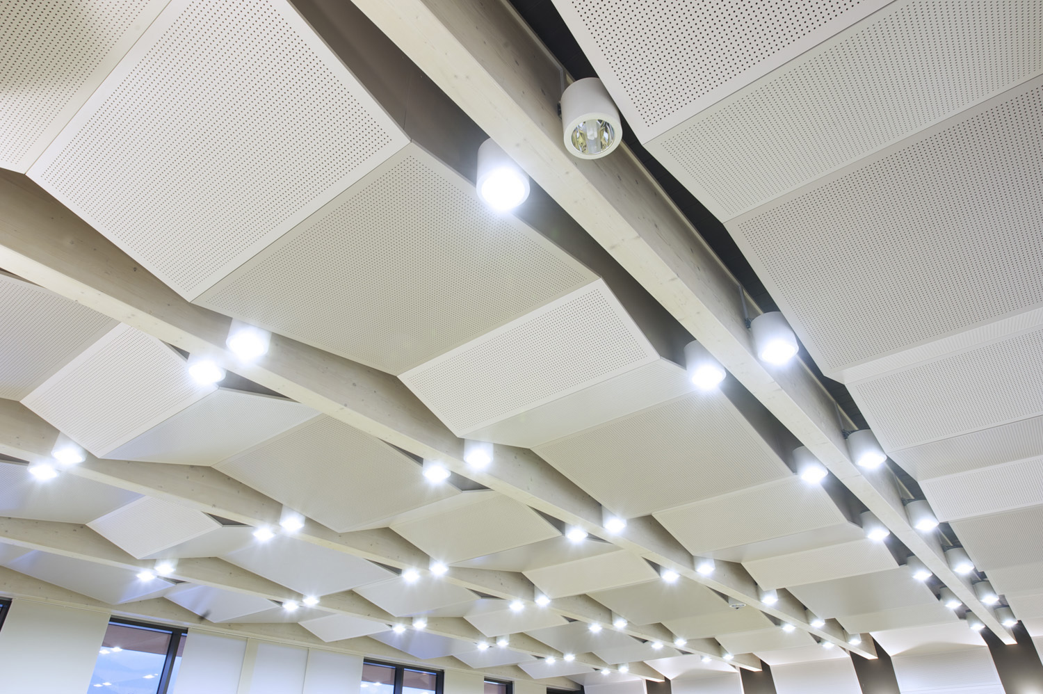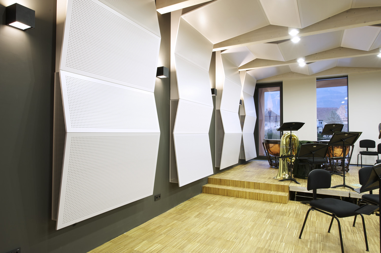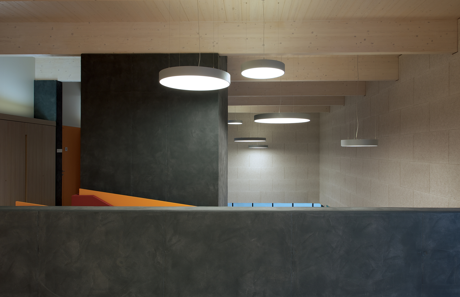 Die Räume des Gemeindeamtes und des Musikvereins werden über ein gemeinsames Foyer auf Platzniveau erschlossen. Die Amtsräume liegen auf der Ebene des Altbaus und ermöglichen dadurch die Anbindung an den Bestand. Im Obergeschoss finden sich die Räume der Musik mit dem nach Norden orientierten Probesaal. Sie bilden einen eigenen Bereich im Gebäude, ohne den Amtsbetrieb zu durchkreuzen.