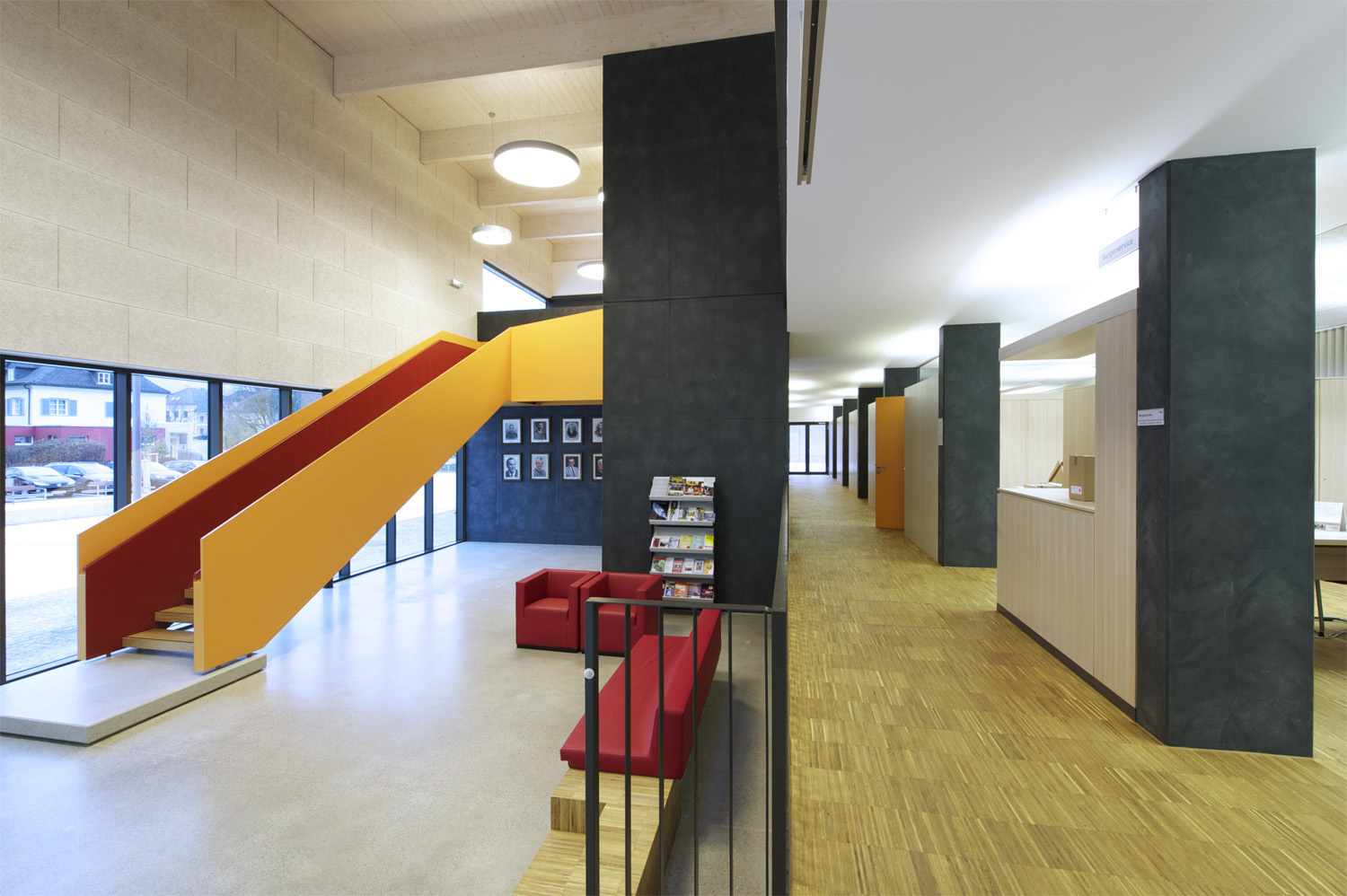 Unter der markanten Platzfassade betritt man das hell 2-geschossige Foyer, von welchem man direkt in den offenen Bürgerservicebereich kommt.