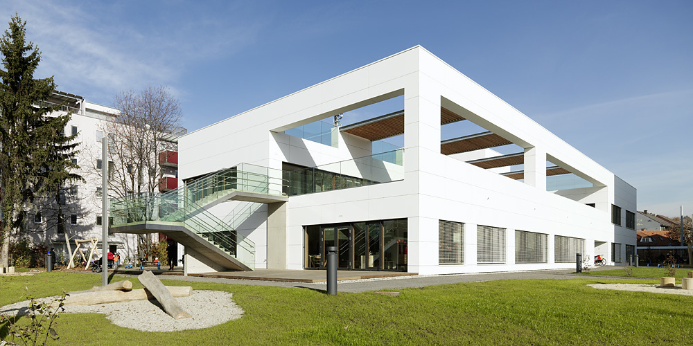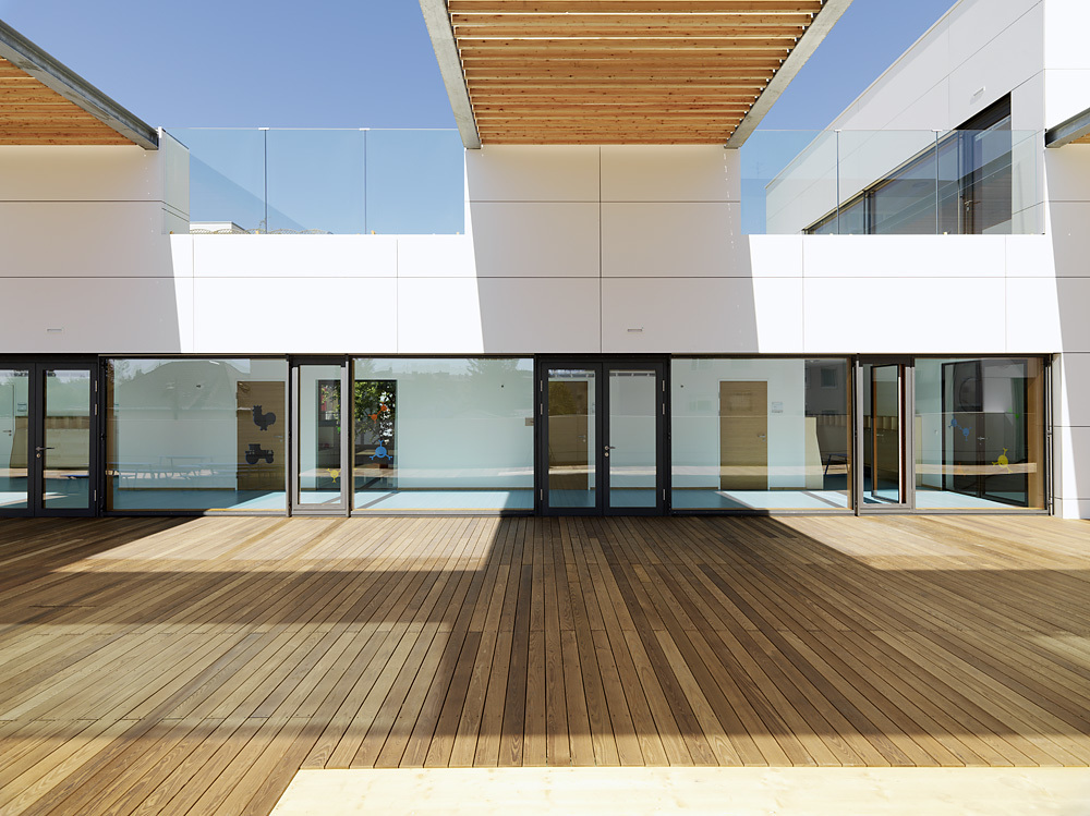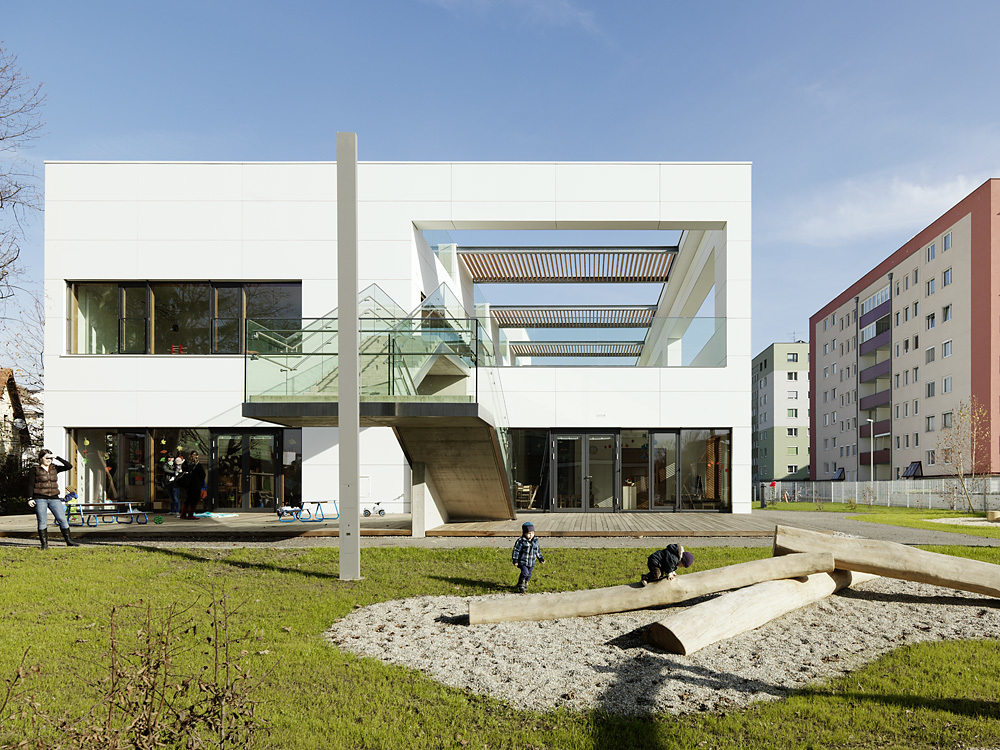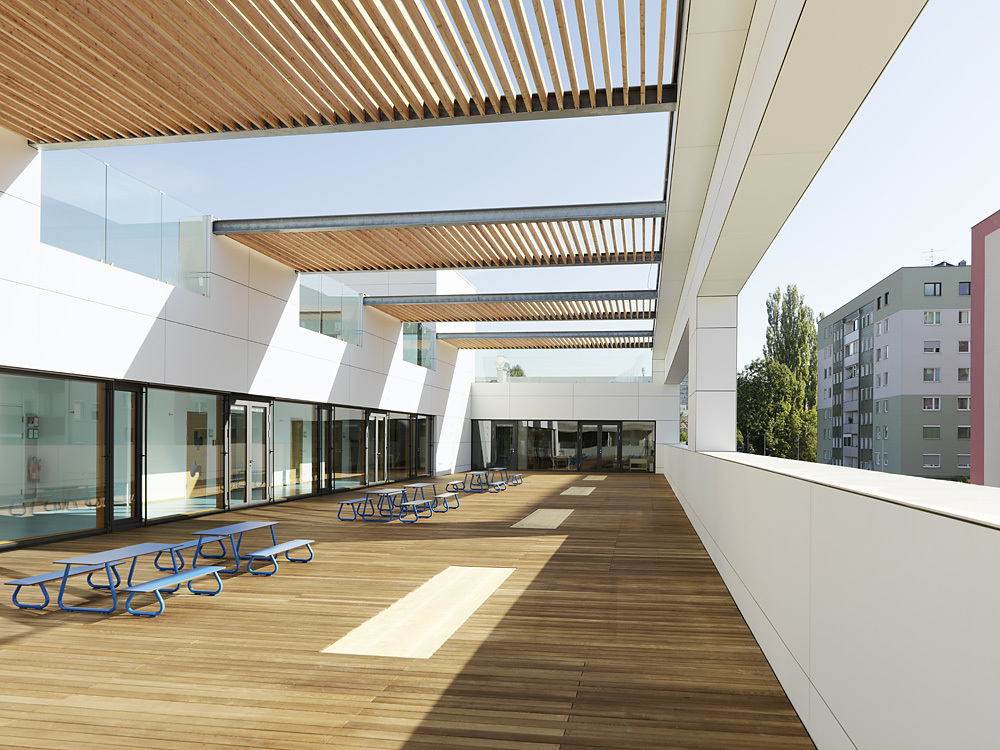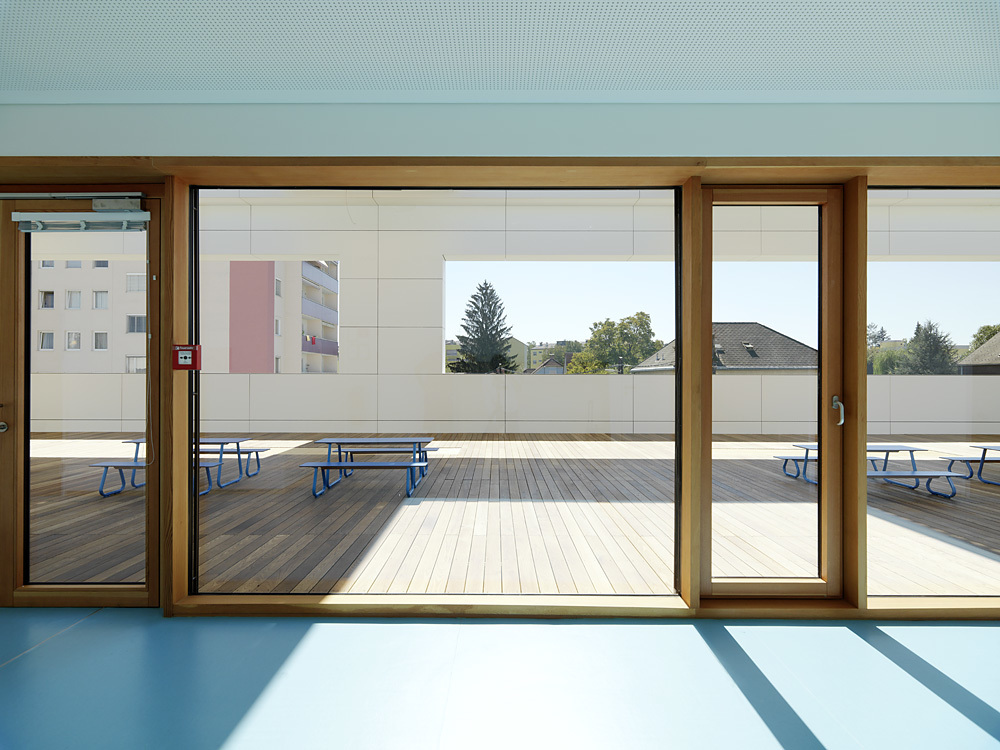 Die große holzbelegte Terrasse im 1.OG wird als geschützte Spielfläche im Freien ausgebildet. Sie gleicht einen Teil mangelnder Freiflächen auf Terrainniveau aus und bietet eine andere Qualität von Spielflächen - im Übergang zwischen Innen und Außen. Die Terrassen sind auch in kühleren Jahreszeiten (Frühling, Herbst) überwiegend warm und trocken. Das Flachdach über dem 1.OG wurde in räumlicher Verbindung und mit entsprechenden Blickbeziehungen zum 1.OG als benutzbarer Dachgarten ausgebildet. (Text: Architekt)