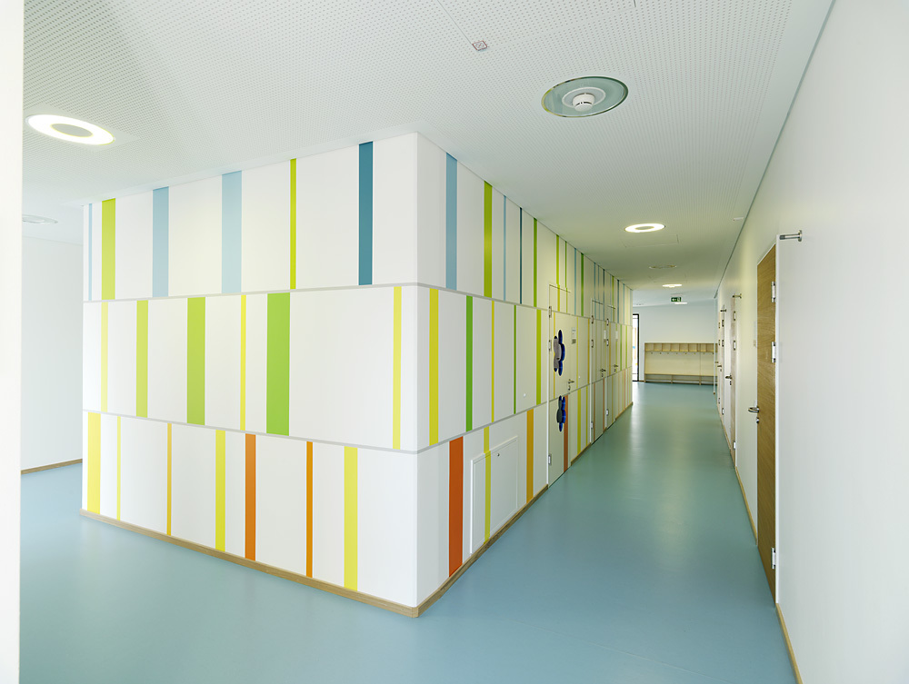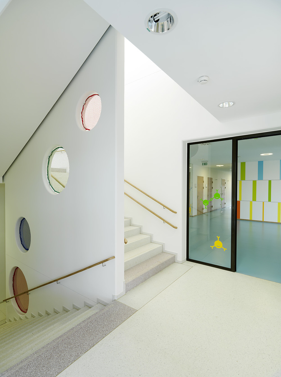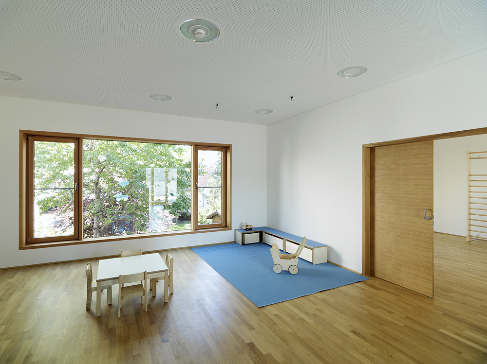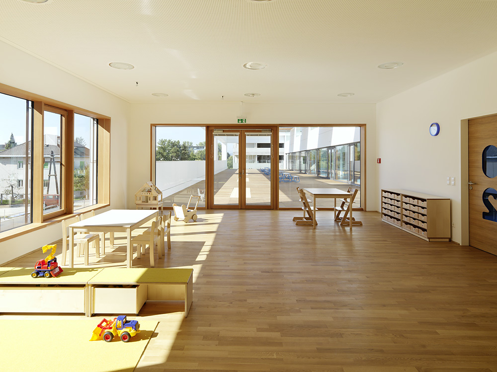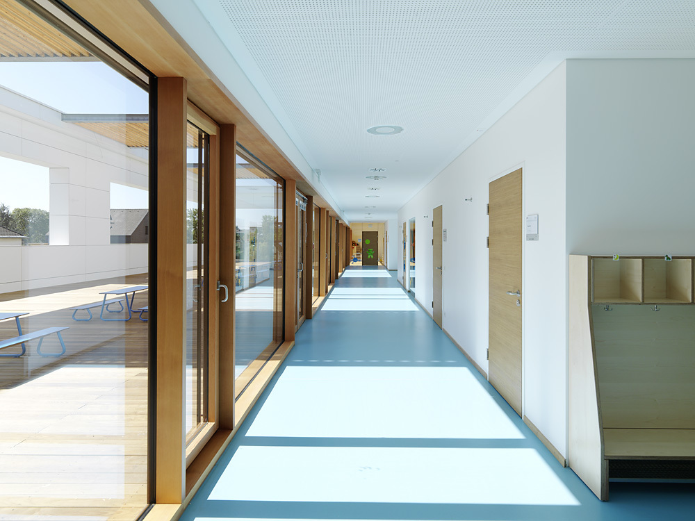 Die Gruppenräume sind durch großzügige, bis zum Boden reichende Verglasungen lichtdurchflutet, die vorgelagerten Terrassen wirken durch die fließenden Bodenübergänge als räumliche Erweiterungen im Freien. Innenliegende Öffnungen zu den Gangbereichen schaffen Sichtverbindungen zwischen Gruppenraum und Verkehrsflächen (Spielflächen) und fördern gruppenübergreifende Kontakte.
