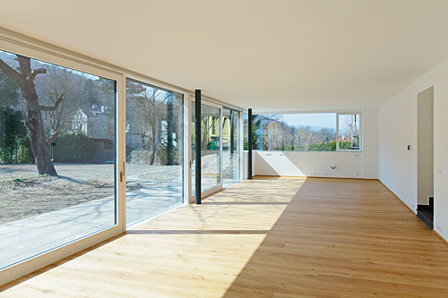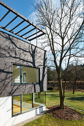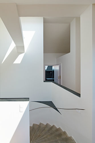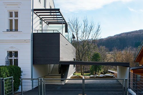 Im Zuge der Erweiterung und Neuprogrammierung wurde die Erschließung der Geschosse verbessert. In den Obergeschossen wurden die Außenbereiche nutzbar gemacht, auf Erdgeschossniveau entstanden neue Übergänge zum Außenraum sowie eine zweckmäßige Zufahrt mit Pkw-Stellplätzen (Carport). Hinsichtlich der Größe des Anbaus nahmen die Architekten Bezug auf die Maßstäblichkeit der Nachbargebäude. Auf eine gute Nachbarschaft! (Text: Architekten, redaktionell überarbeitet)