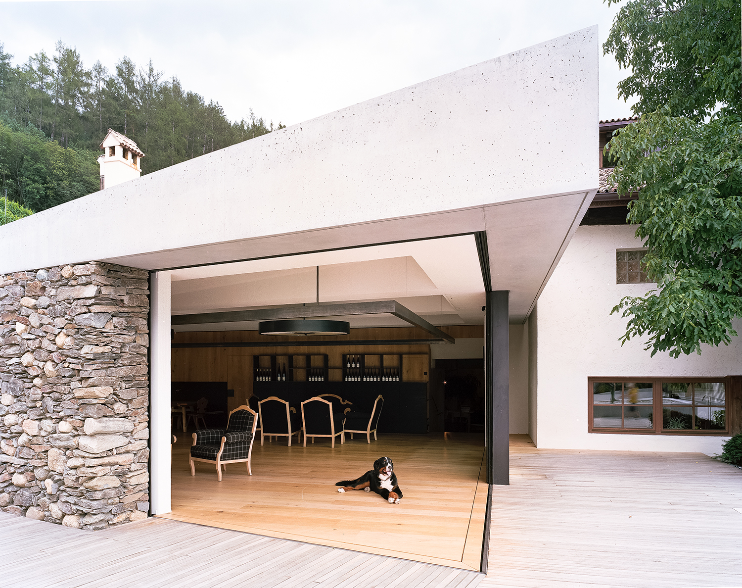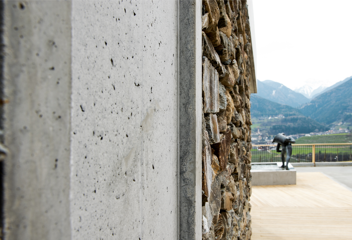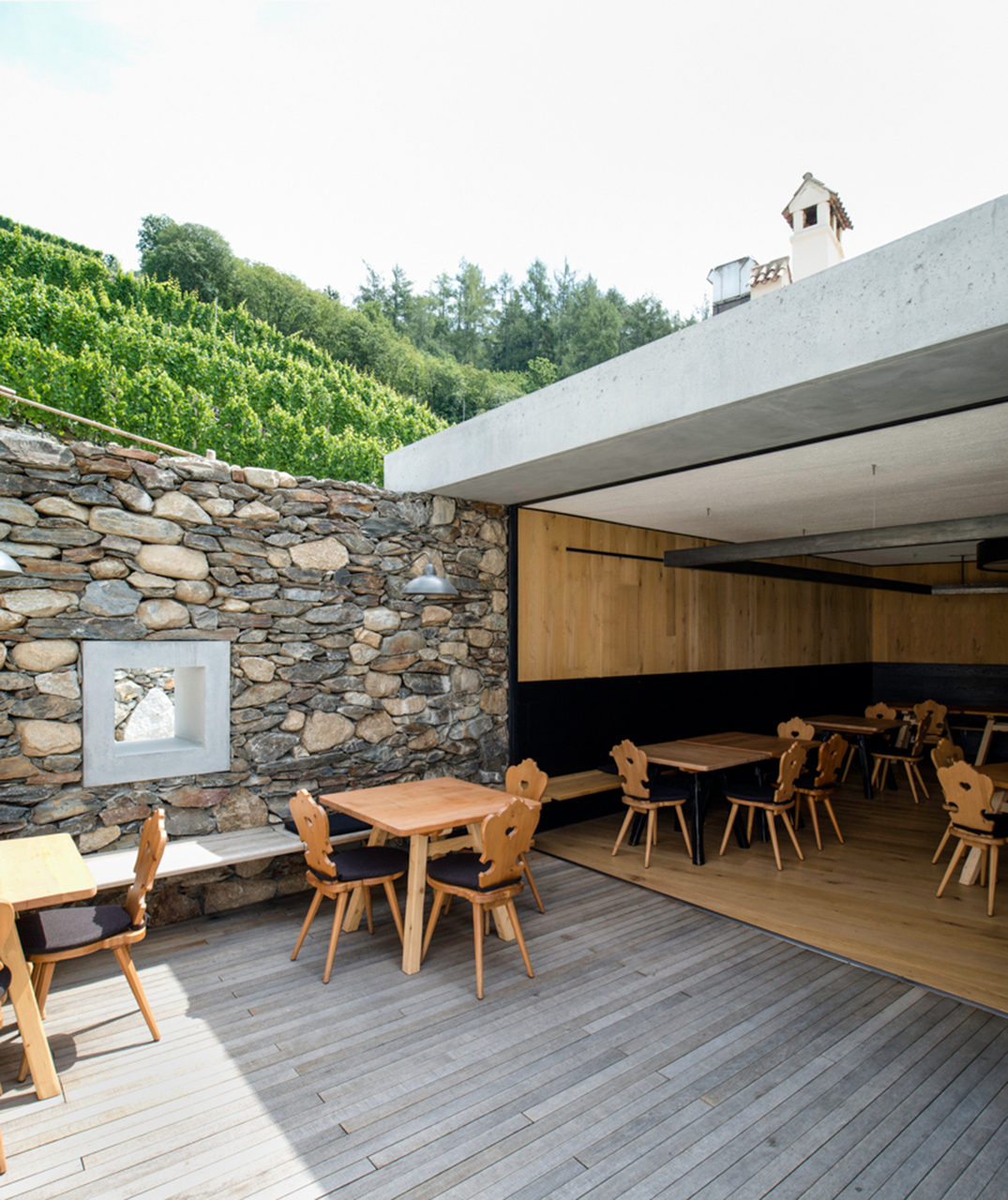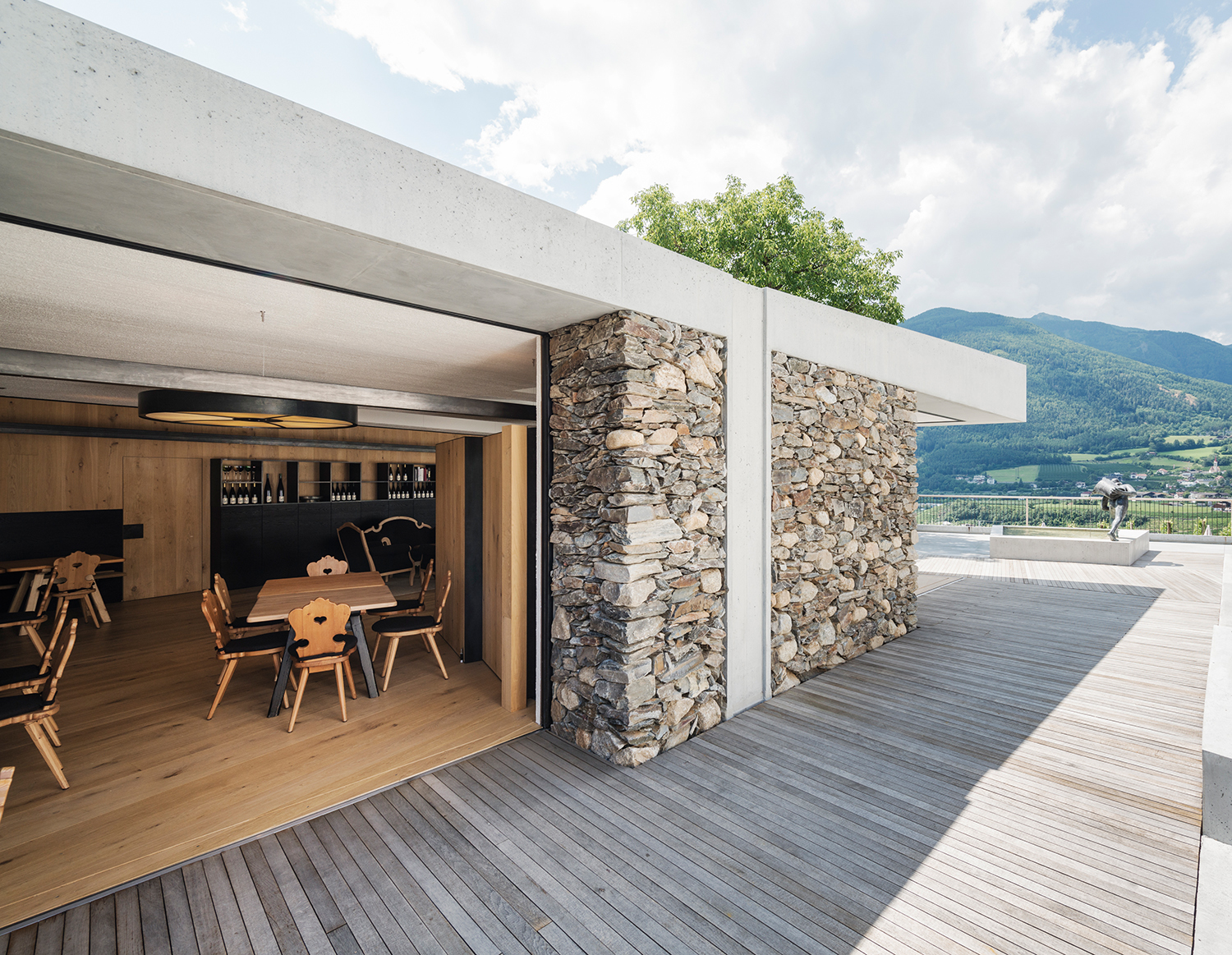 Die markante Skulptur aus hydrophobiertem Sichtbeton erscheint als sichtbare Narbe im Natursteinmauerwerk, ein Übergriff in Materialität – Beton, Stein, Glas – und räumlicher Situation. Die facettenreiche Räumlichkeit wird zum Essen, zur Weinverkostung und Begegnung genutzt. Verglaste Schiebeelemente lassen sich komplett öffnen und verschwinden in der Steinwand. Der Innenraum wird zum Außenraum und es verändert sich die Wahrnehmung. Die Gemütlichkeit der Tiroler holzgetäfelten Stuben wird in Qualität von Ruhe und Behaglichkeit aufgenommen und trotzdem zeigt sich der Salon in klarer, heller, moderner Architektursprache. Das Dach bietet als deutliches Bauelement Schutz.