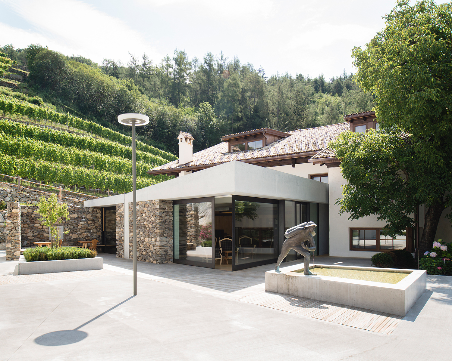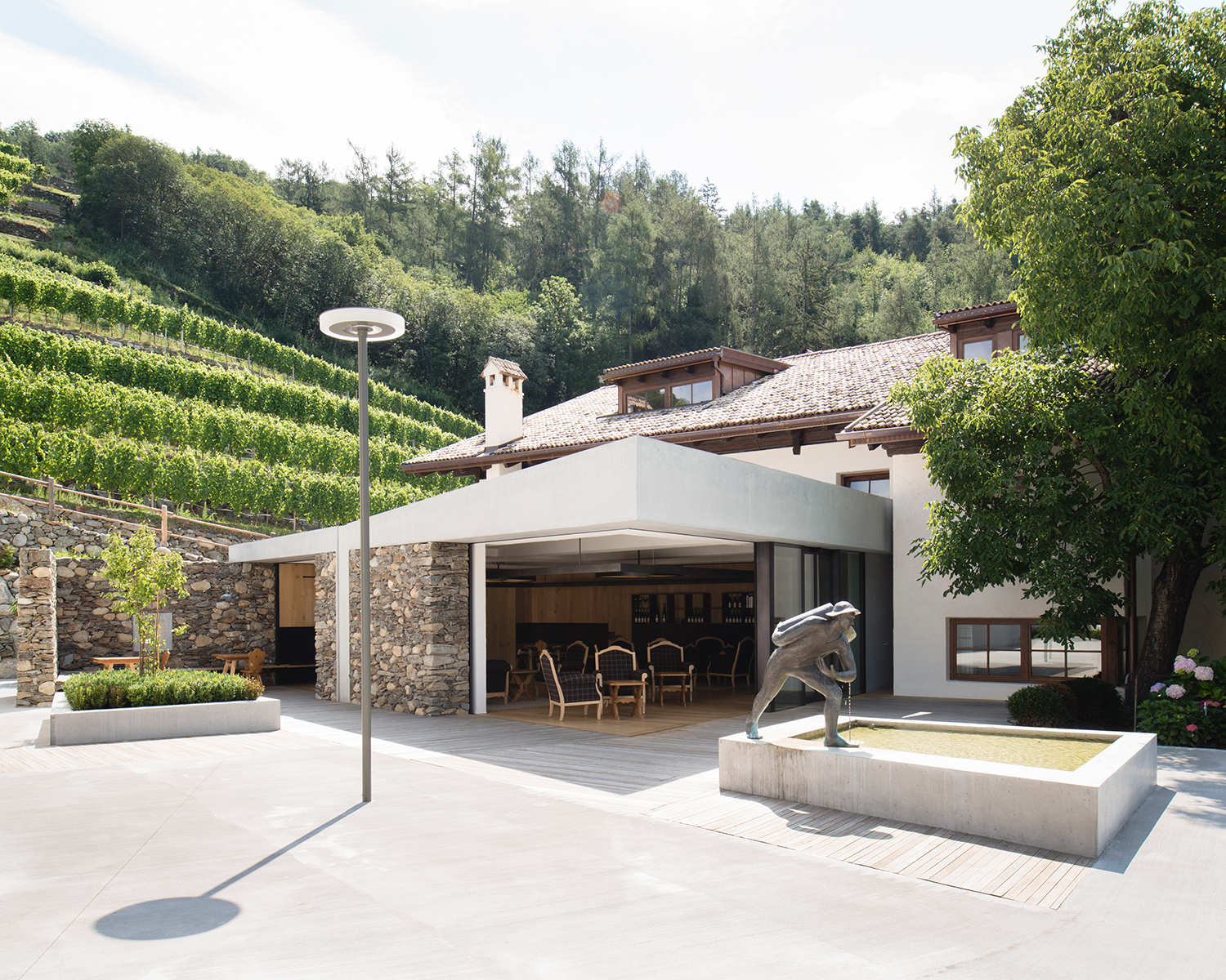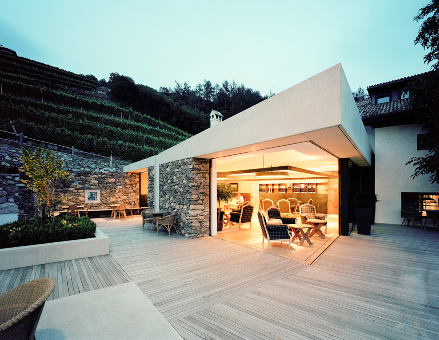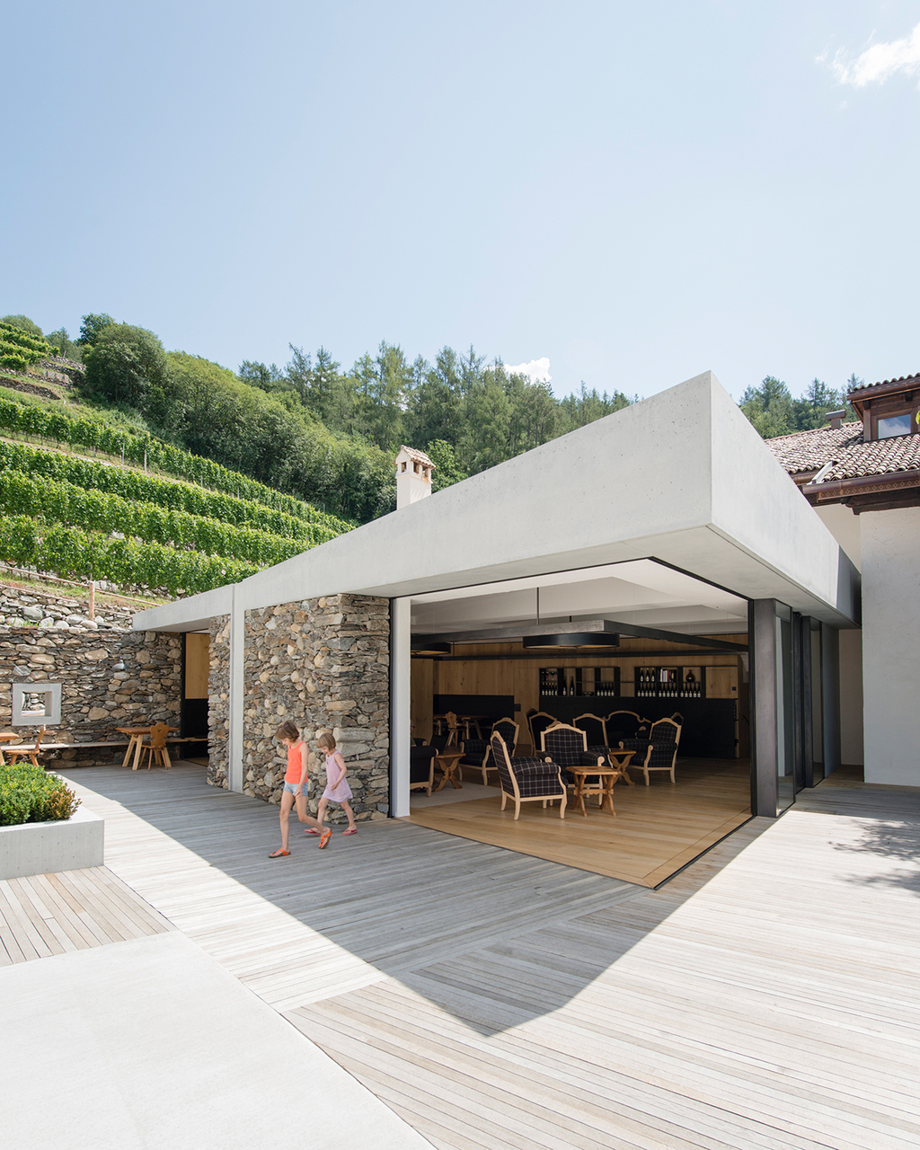 Die markante Skulptur aus hydrophobiertem Sichtbeton erscheint als sichtbare Narbe im Natursteinmauerwerk, ein Übergriff in Materialität – Beton, Stein, Glas – und räumlicher Situation. Die facettenreiche Räumlichkeit wird zum Essen, zur Weinverkostung und Begegnung genutzt. Verglaste Schiebeelemente lassen sich komplett öffnen und verschwinden in der Steinwand. Der Innenraum wird zum Außenraum und es verändert sich die Wahrnehmung. Die Gemütlichkeit der Tiroler holzgetäfelten Stuben wird in Qualität von Ruhe und Behaglichkeit aufgenommen und trotzdem zeigt sich der Salon in klarer, heller, moderner Architektursprache. Das Dach bietet als deutliches Bauelement Schutz.