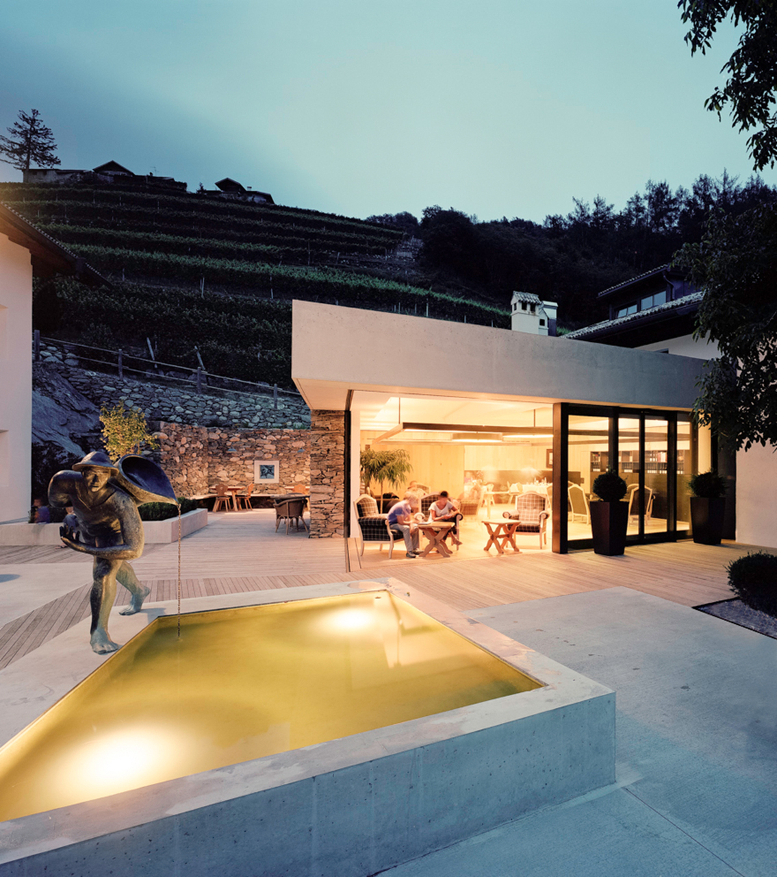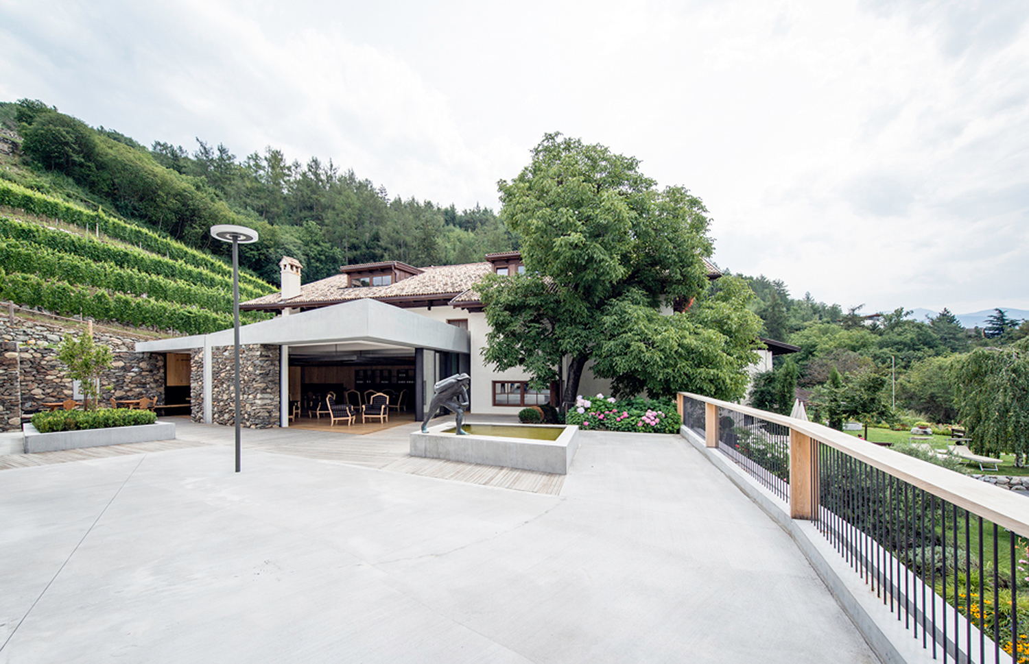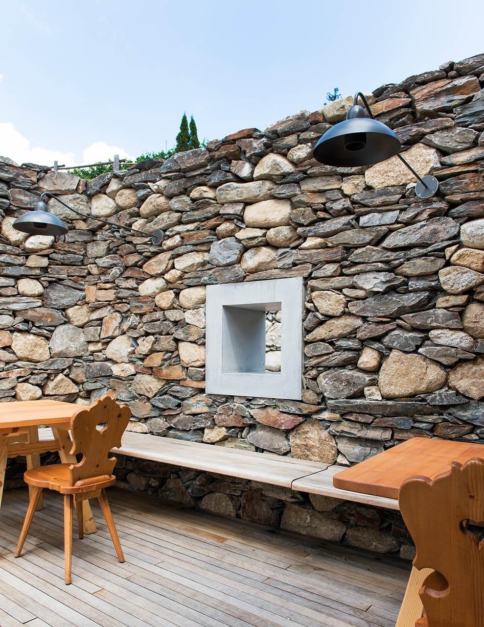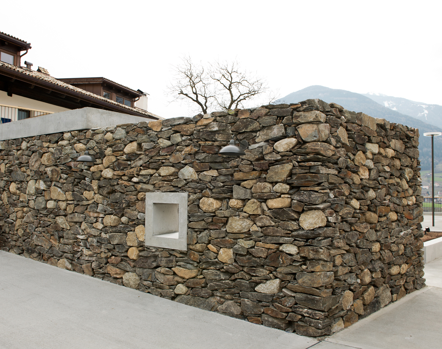 Die markante Skulptur aus hydrophobiertem Sichtbeton erscheint als sichtbare Narbe im Natursteinmauerwerk, ein Übergriff in Materialität – Beton, Stein, Glas – und räumlicher Situation. Die facettenreiche Räumlichkeit wird zum Essen, zur Weinverkostung und Begegnung genutzt. Verglaste Schiebeelemente lassen sich komplett öffnen und verschwinden in der Steinwand. Der Innenraum wird zum Außenraum und es verändert sich die Wahrnehmung. Die Gemütlichkeit der Tiroler holzgetäfelten Stuben wird in Qualität von Ruhe und Behaglichkeit aufgenommen und trotzdem zeigt sich der Salon in klarer, heller, moderner Architektursprache. Das Dach bietet als deutliches Bauelement Schutz.